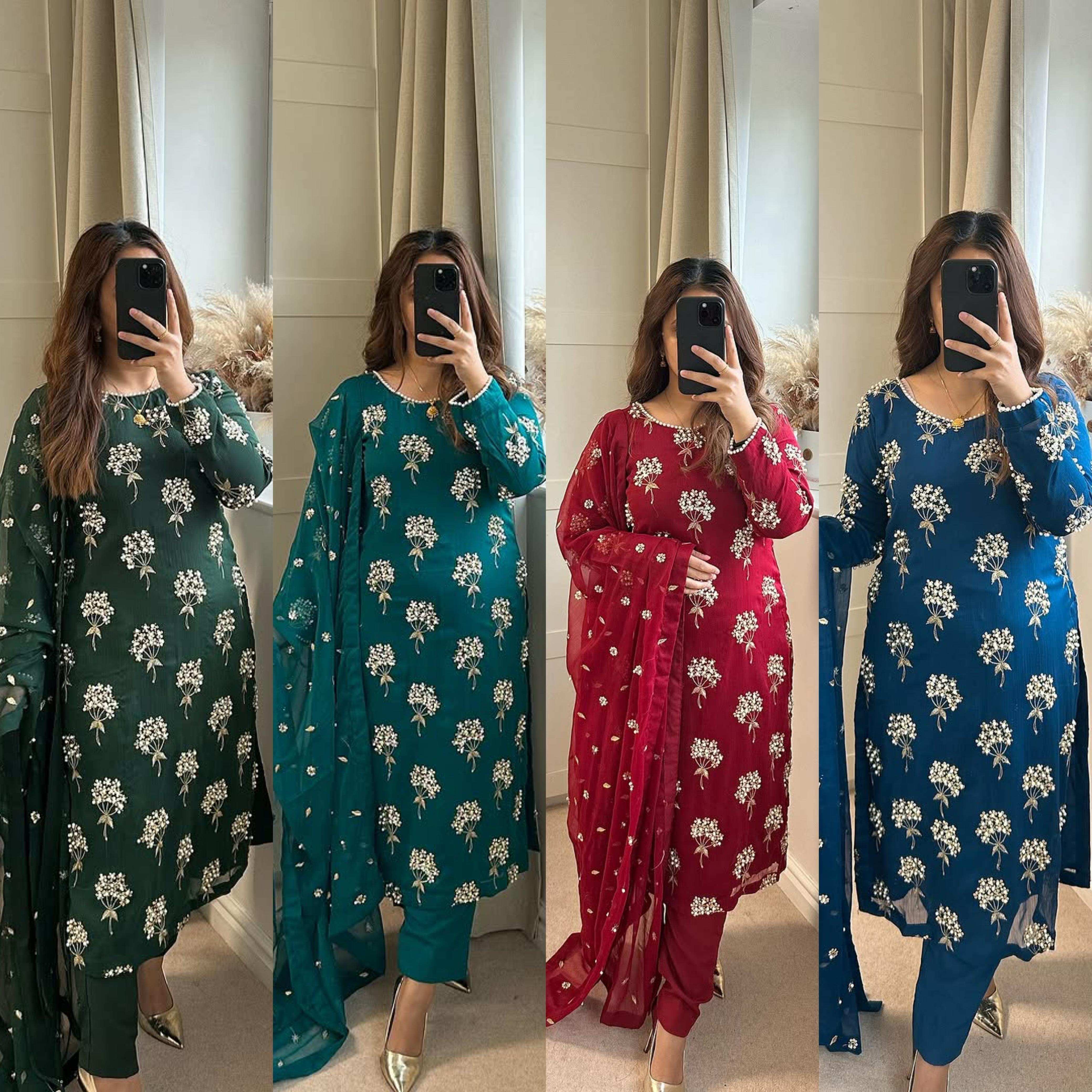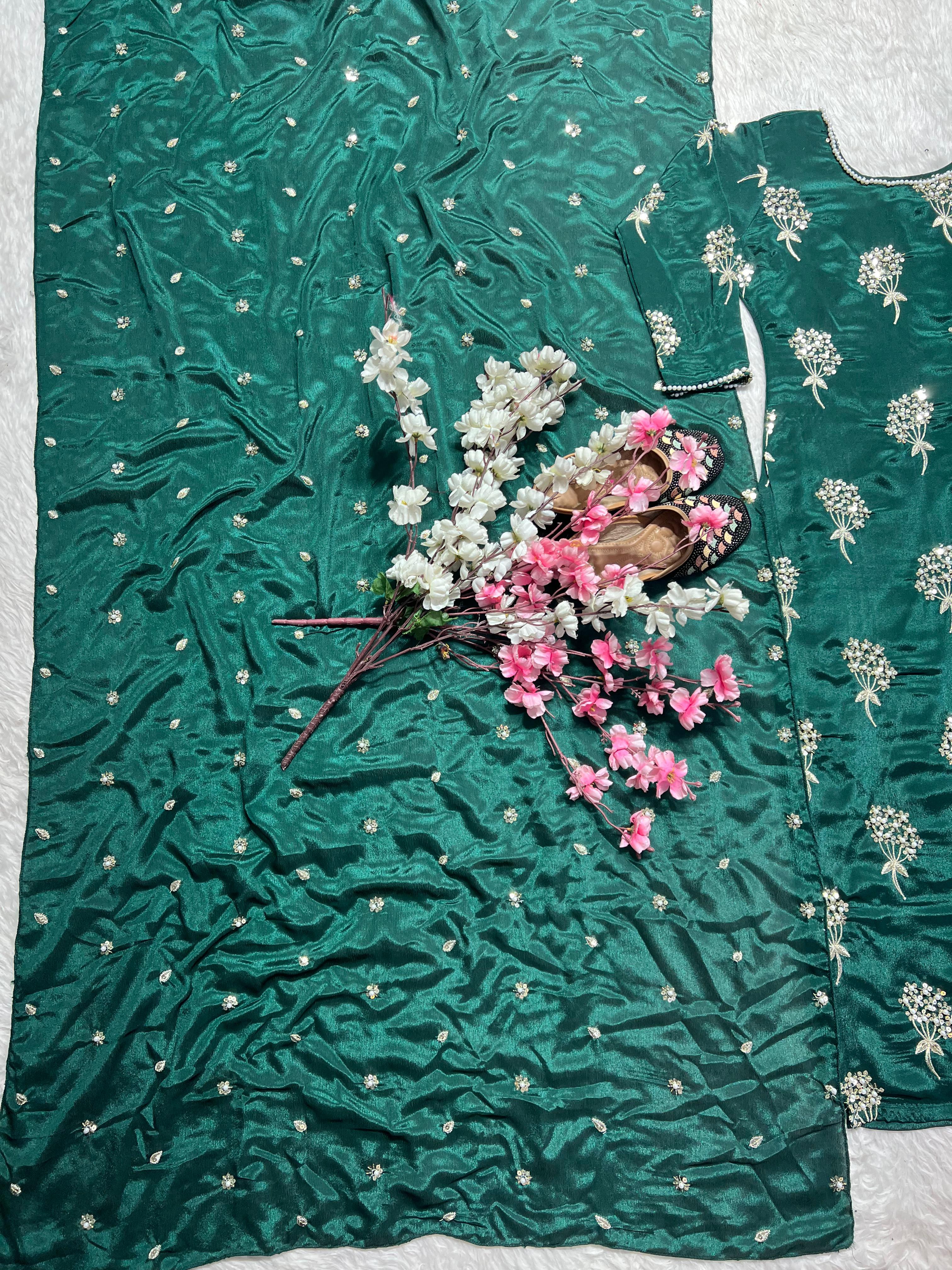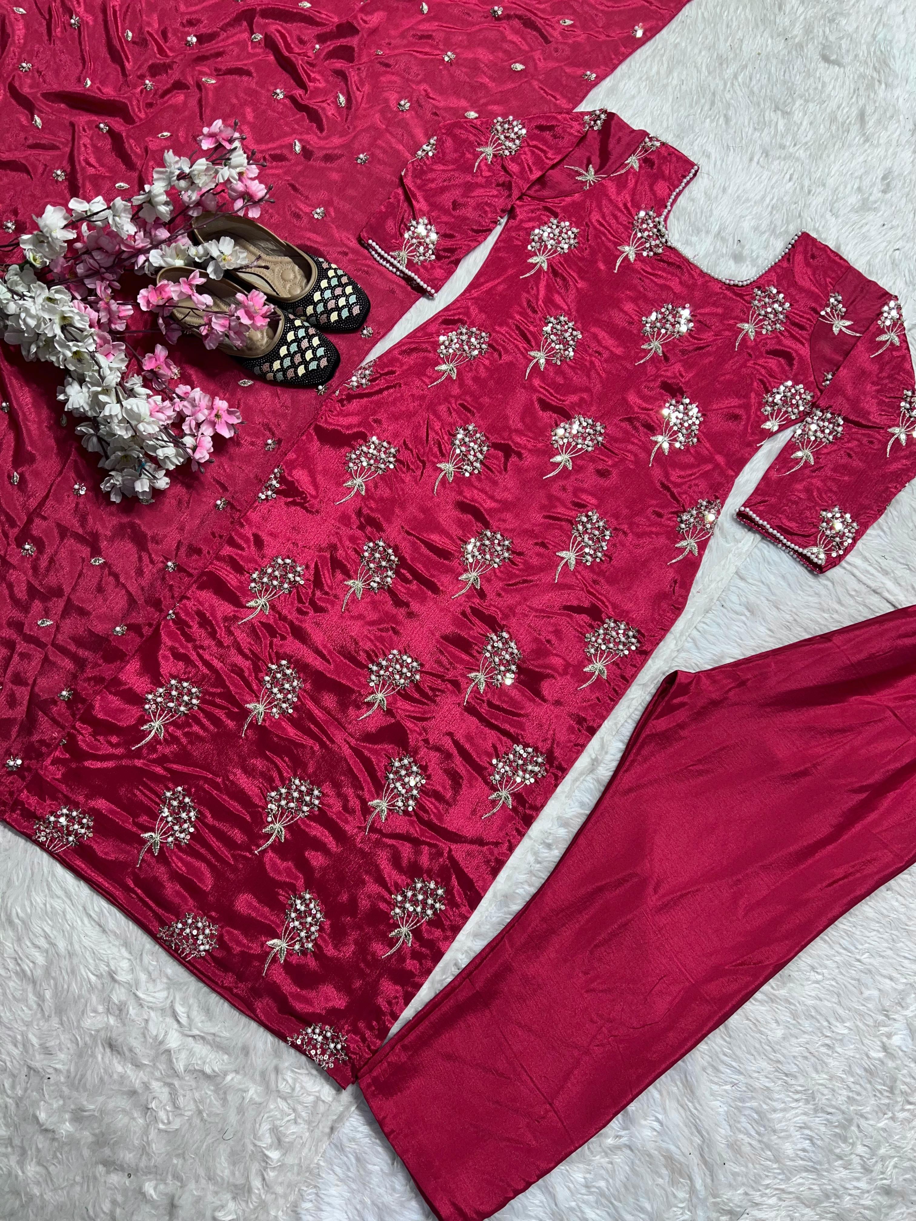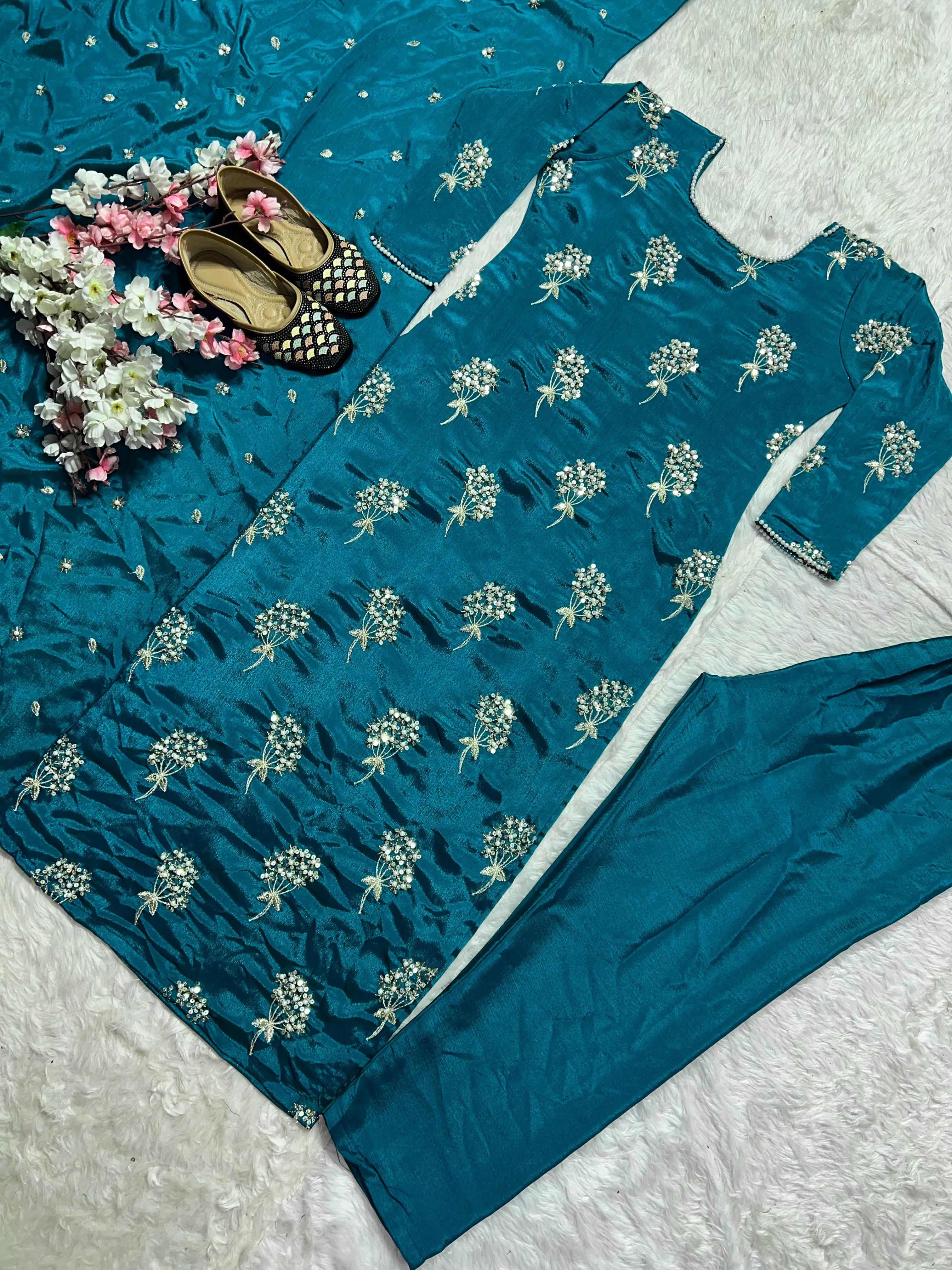 Presenting the elegant Aarzoo Designer Chinon Long Kurti Set, a stylish ethnic ensemble crafted for women who love graceful fashion with a modern touch. Made from premium heavy Chinon fabric, the long kurti features beautiful 5mm sequin embroidery work with moti latkan detailing, giving it a rich and festive appeal.