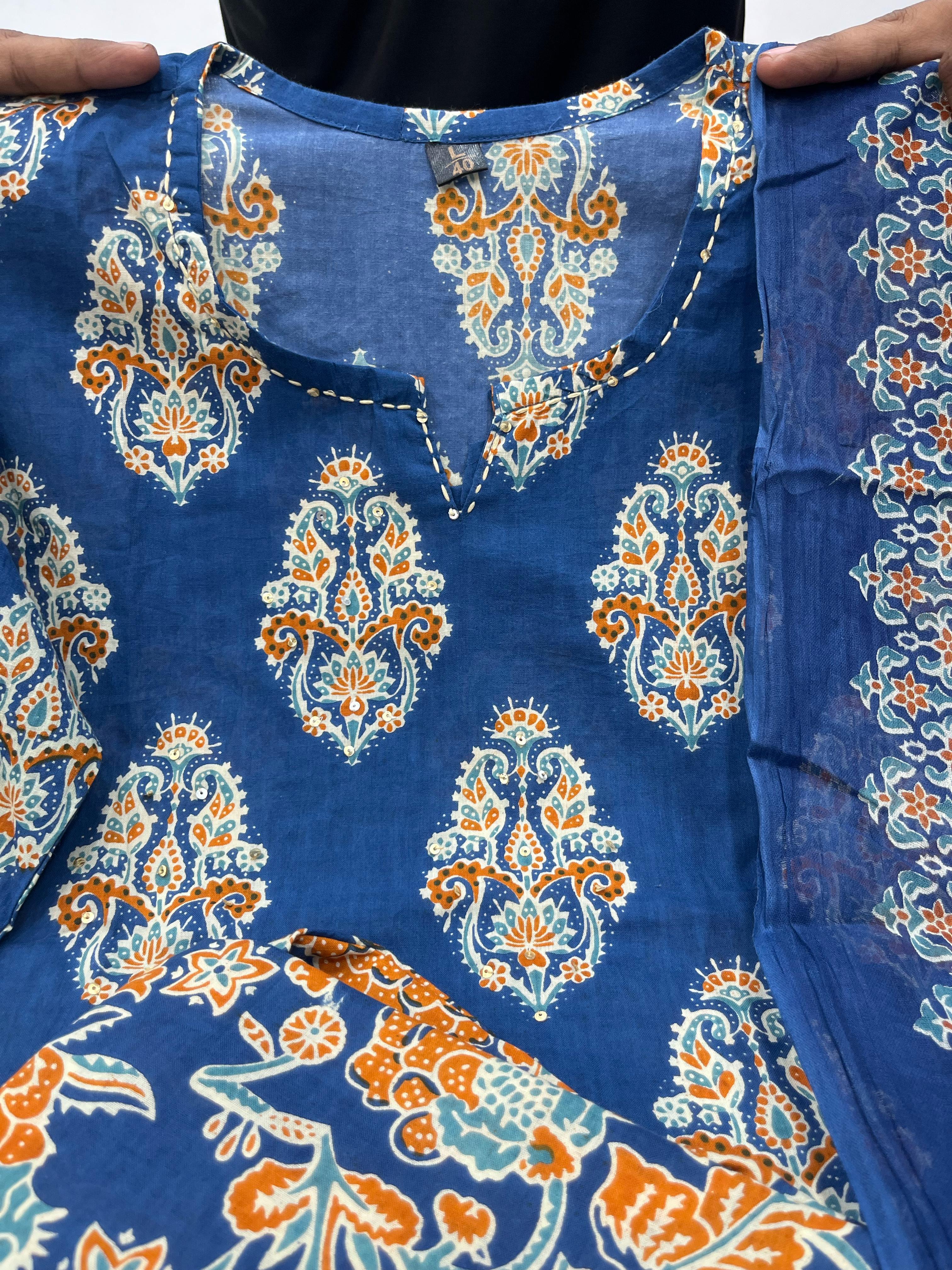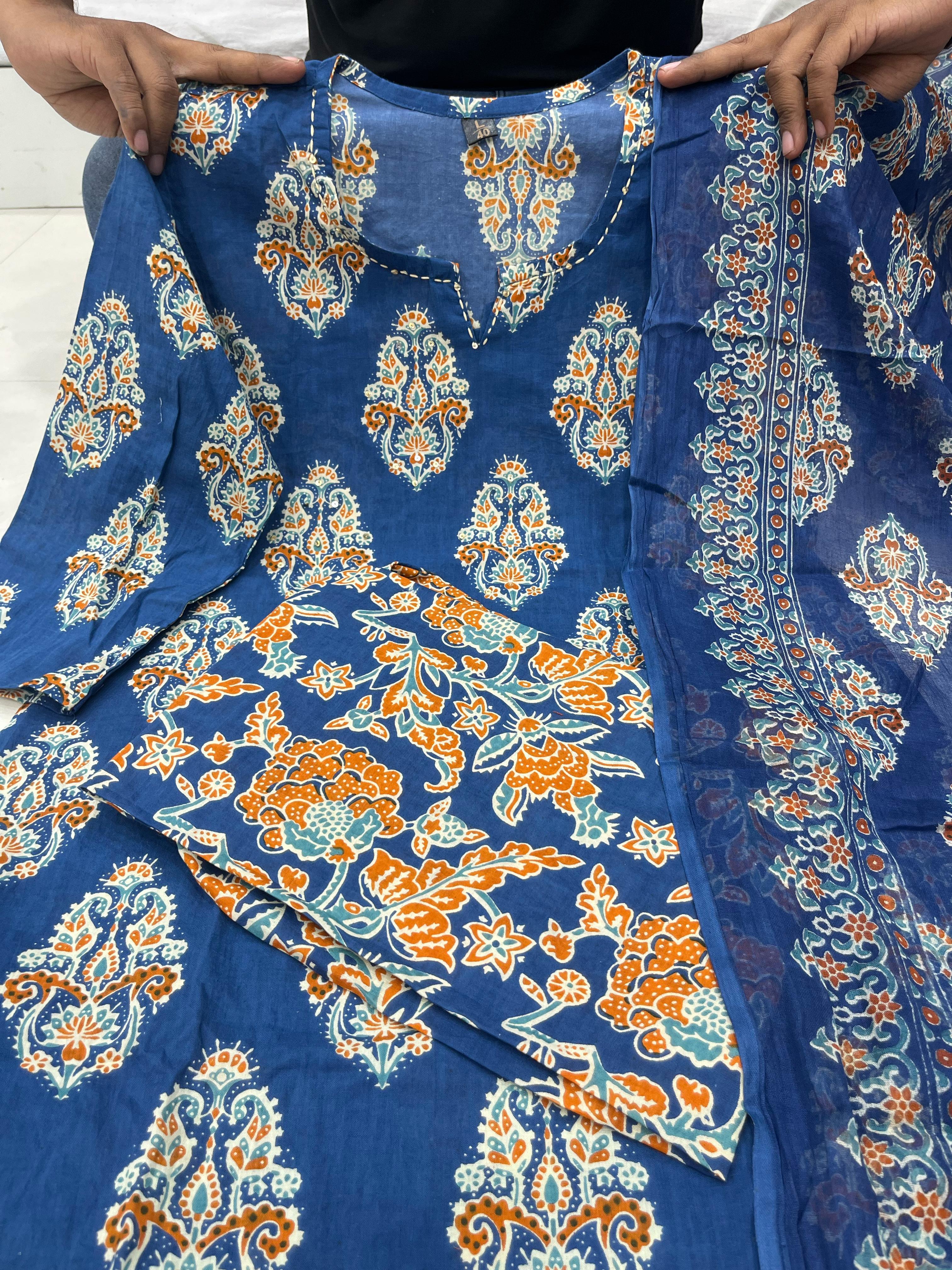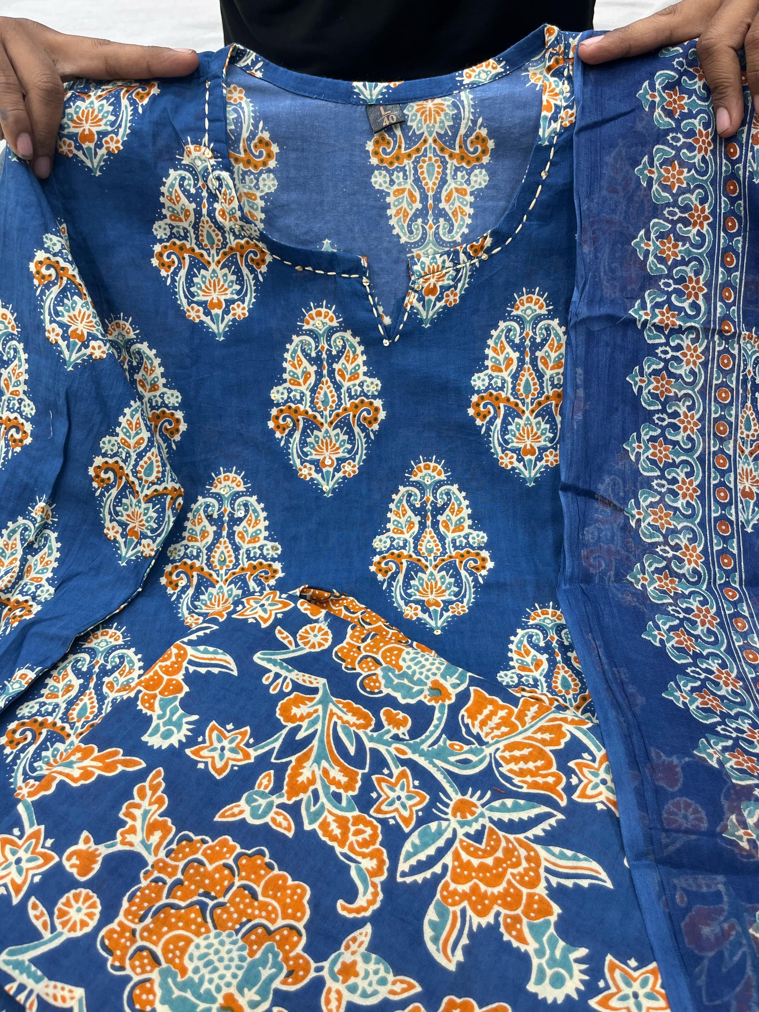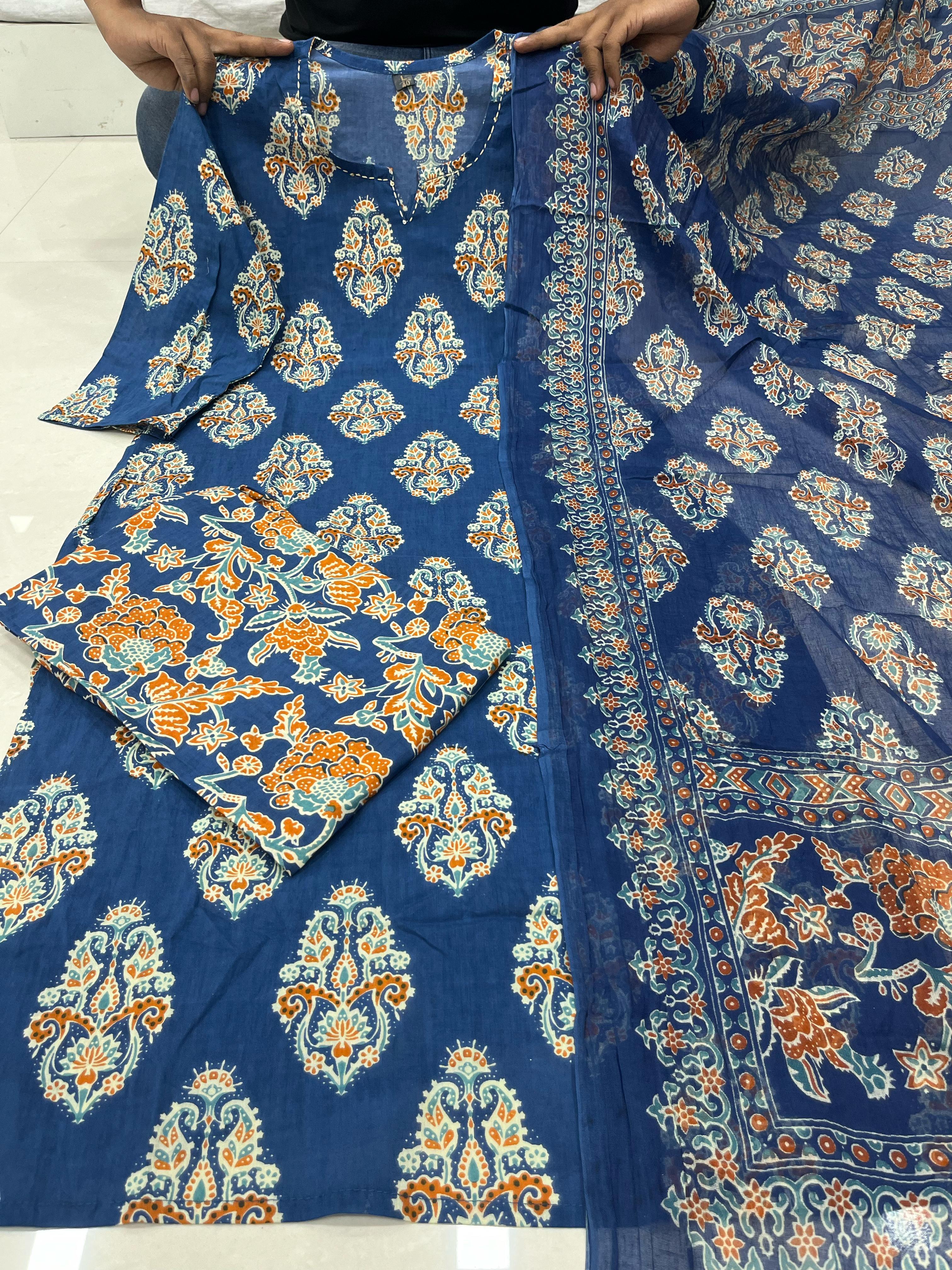 Introducing “Ajarakh Grace” – a beautiful fusion of heritage art and modern elegance. Crafted in pure cambric cotton, this 3-piece suit set showcases traditional Ajarakh-inspired prints in two rich shades: Royal Purple and Teal Blue. Soft, breathable, and lightweight – it's perfect for daily wear, festive gatherings, or semi-formal outings.
