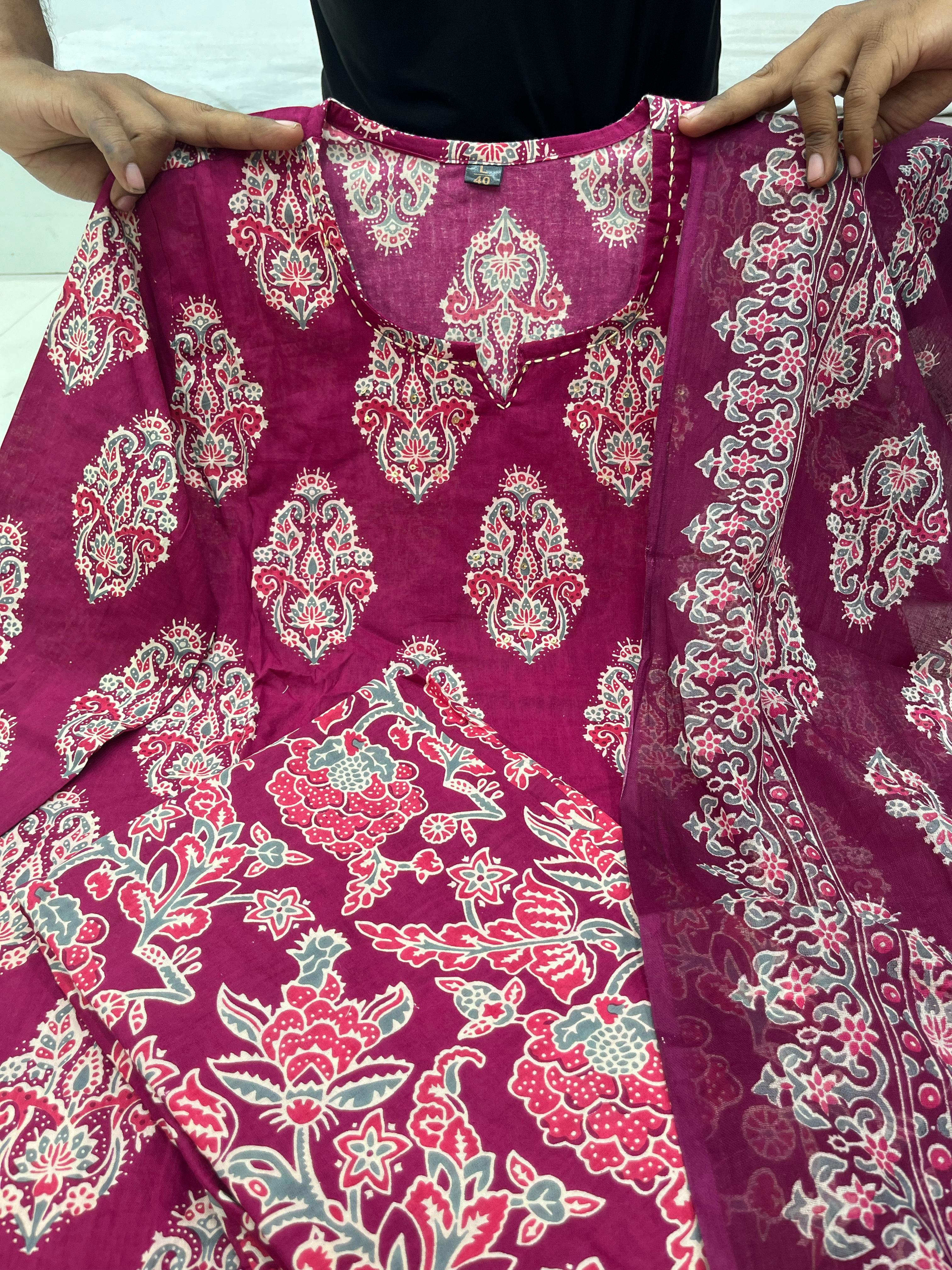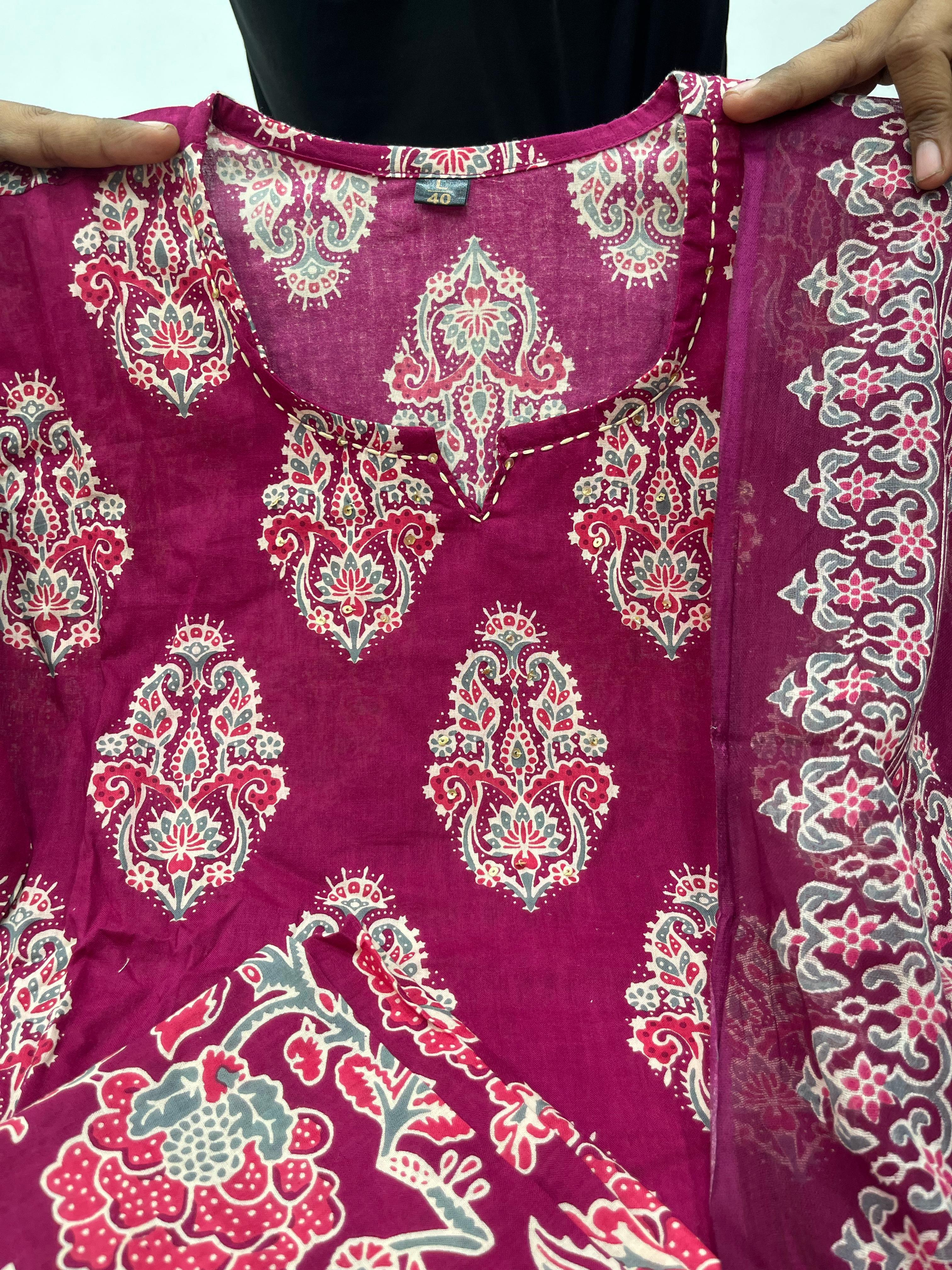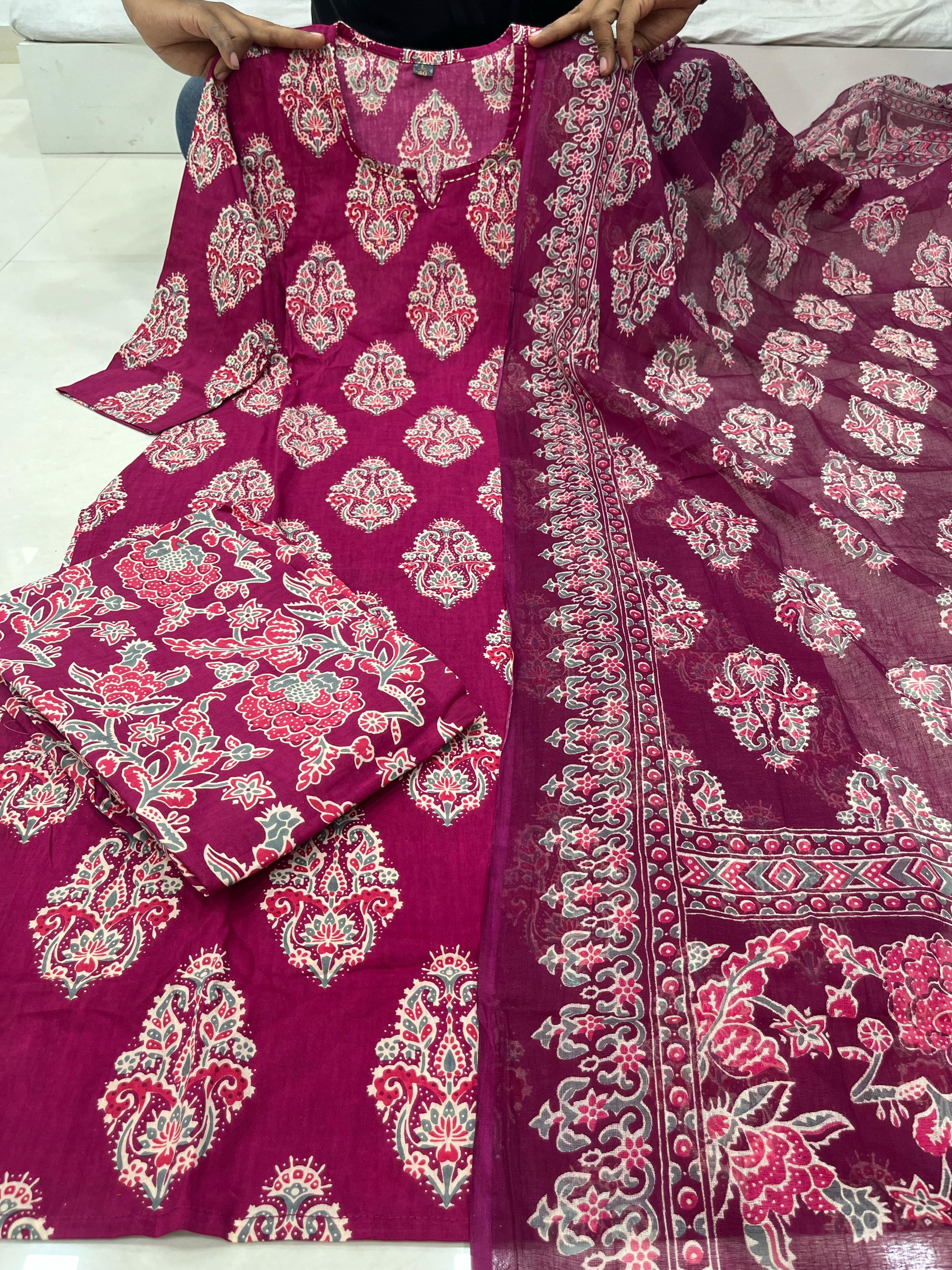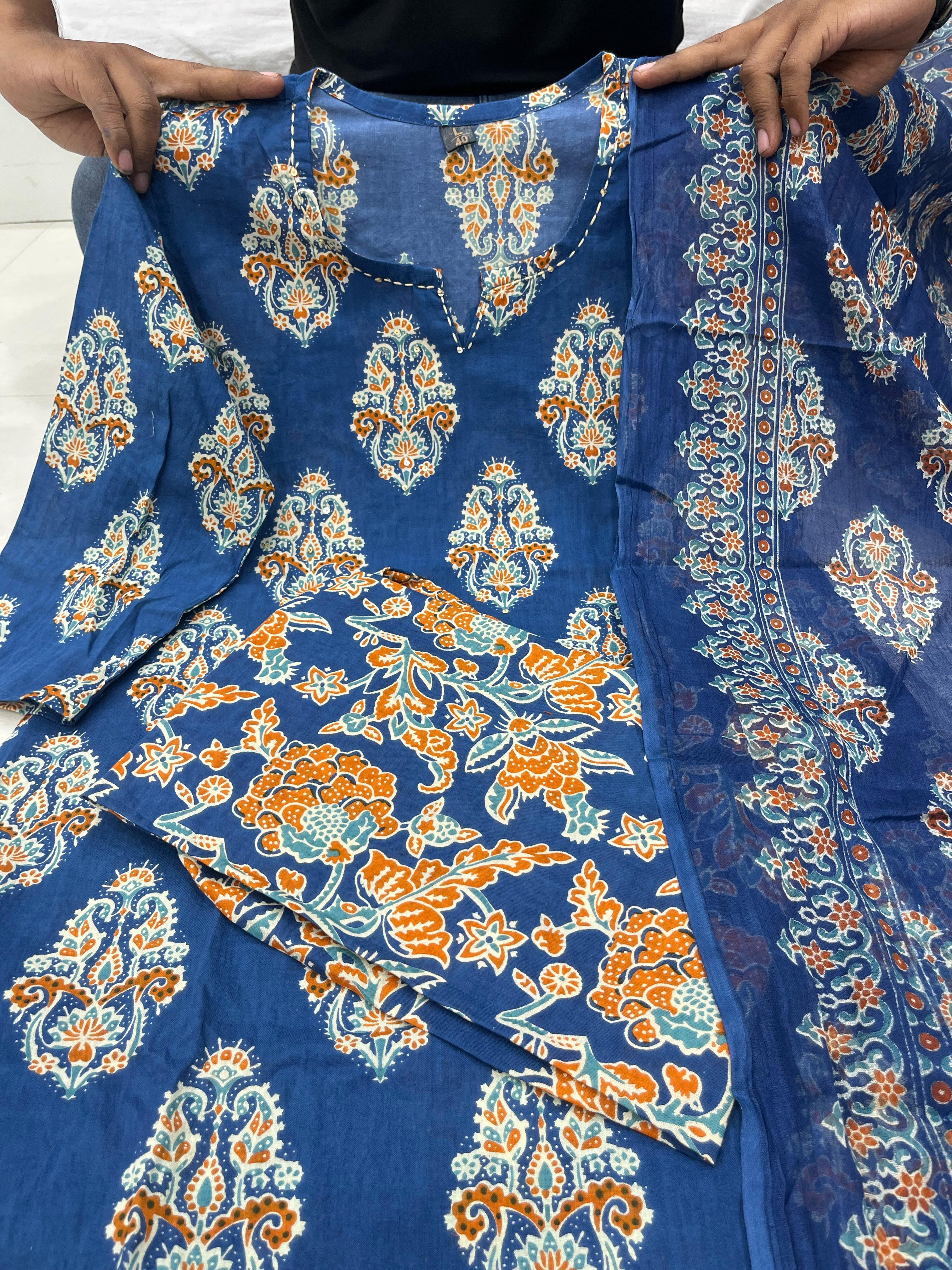 Introducing “Ajarakh Grace” – a beautiful fusion of heritage art and modern elegance. Crafted in pure cambric cotton, this 3-piece suit set showcases traditional Ajarakh-inspired prints in two rich shades: Royal Purple and Teal Blue. Soft, breathable, and lightweight – it's perfect for daily wear, festive gatherings, or semi-formal outings.