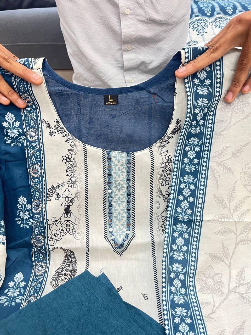 Step into elegance with this Berry Silk Suit Set, a blend of grace, tradition, and contemporary design. Featuring a sophisticated Teal Blue & Ivory palette, the kurti is designed with a unique cut and intricate hand mirror work, enhanced by delicate floral and paisley prints.