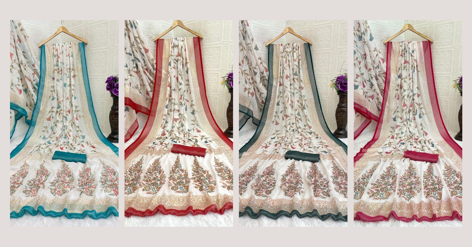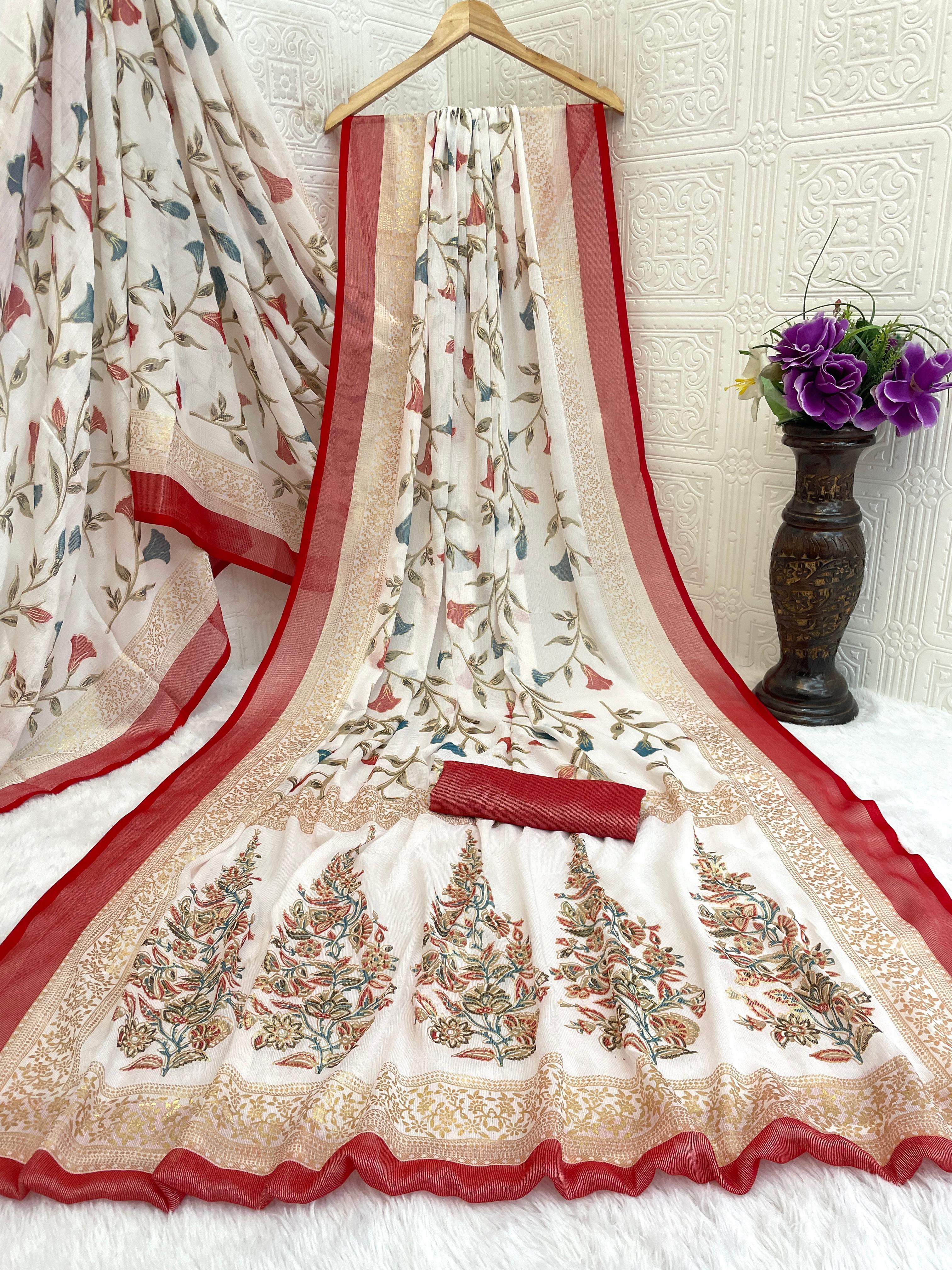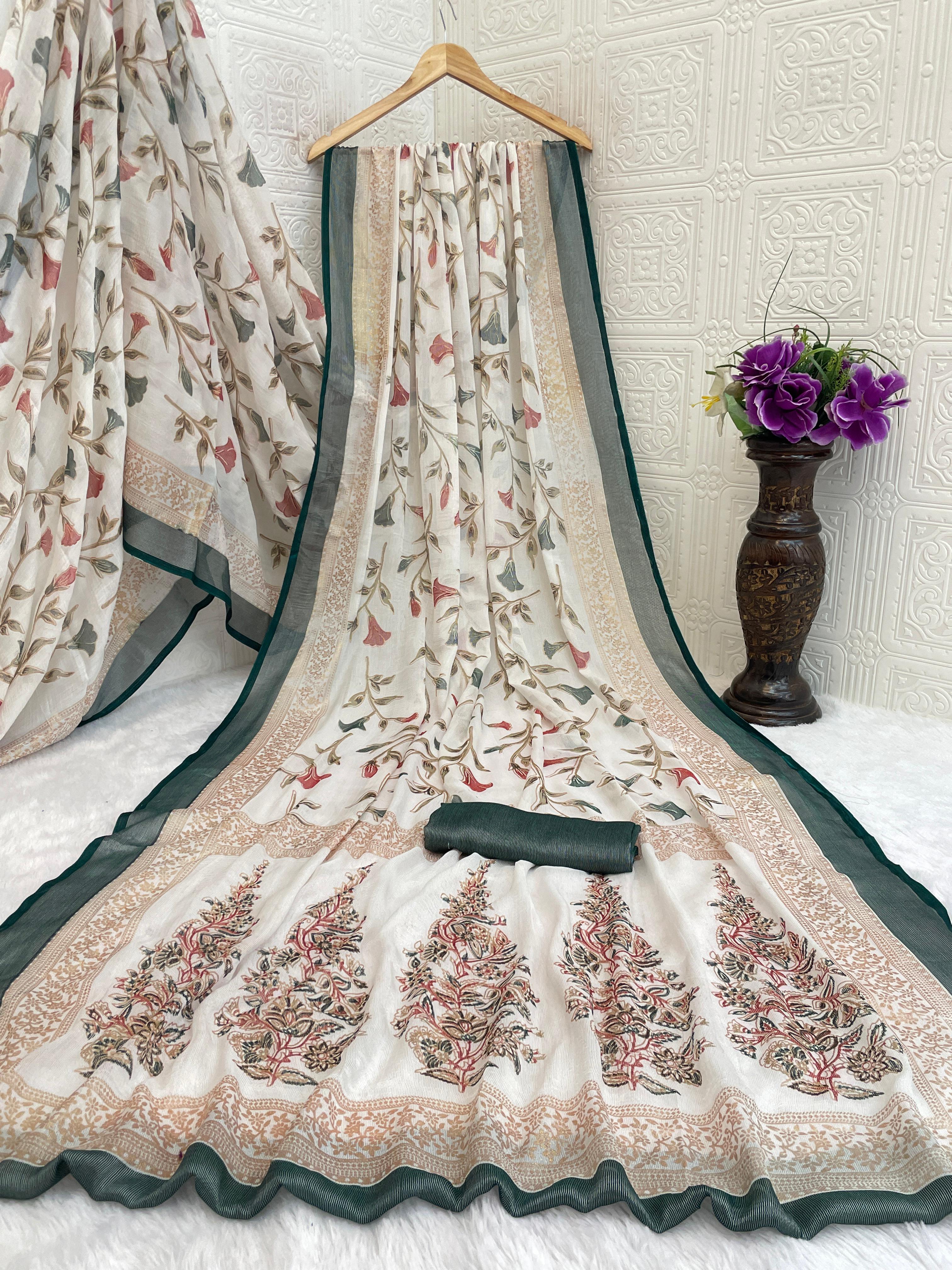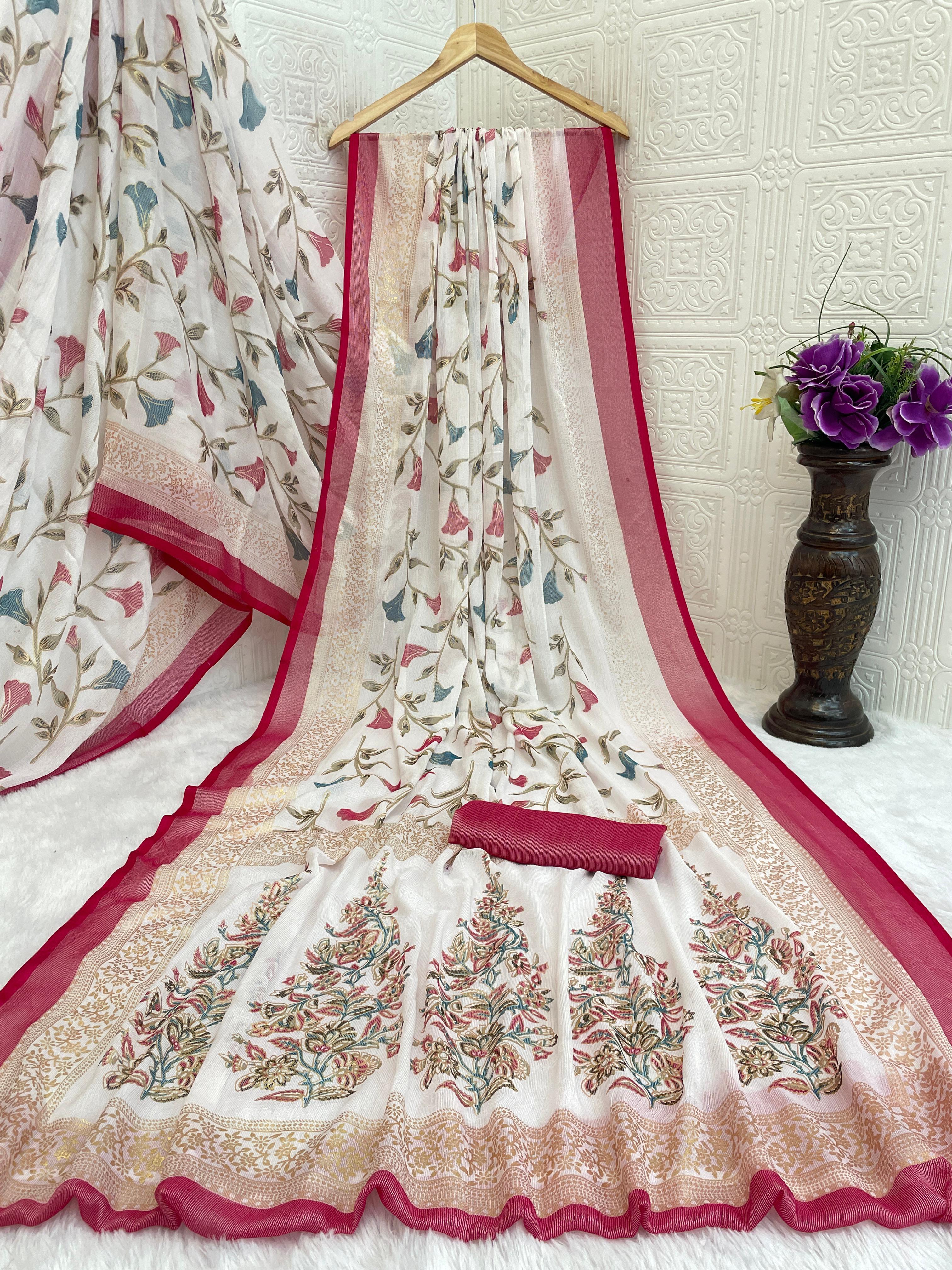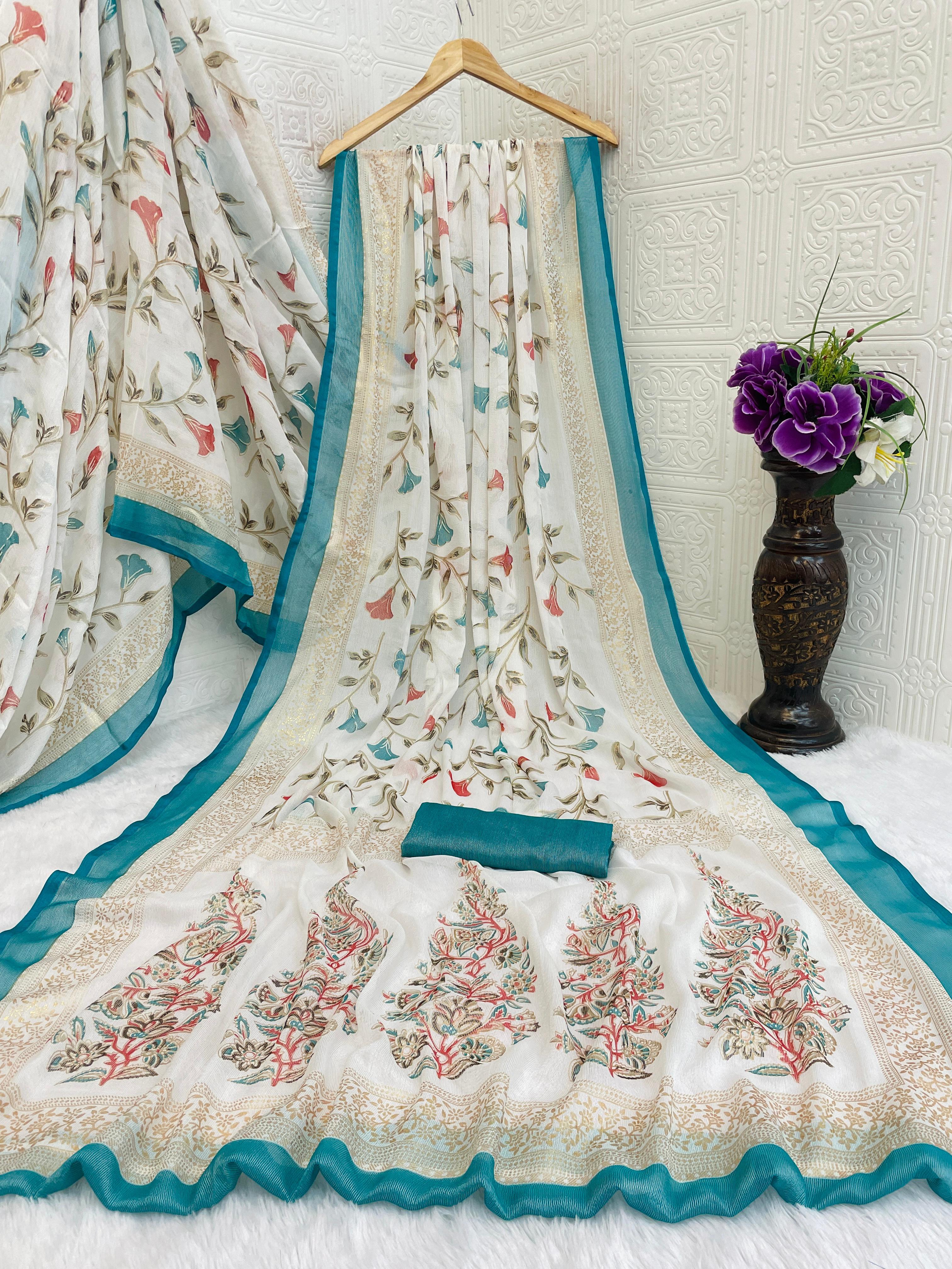 Tags: #BrassoSaree #FloralPrint #ContrastBorder #DesignerSaree #FestiveWear