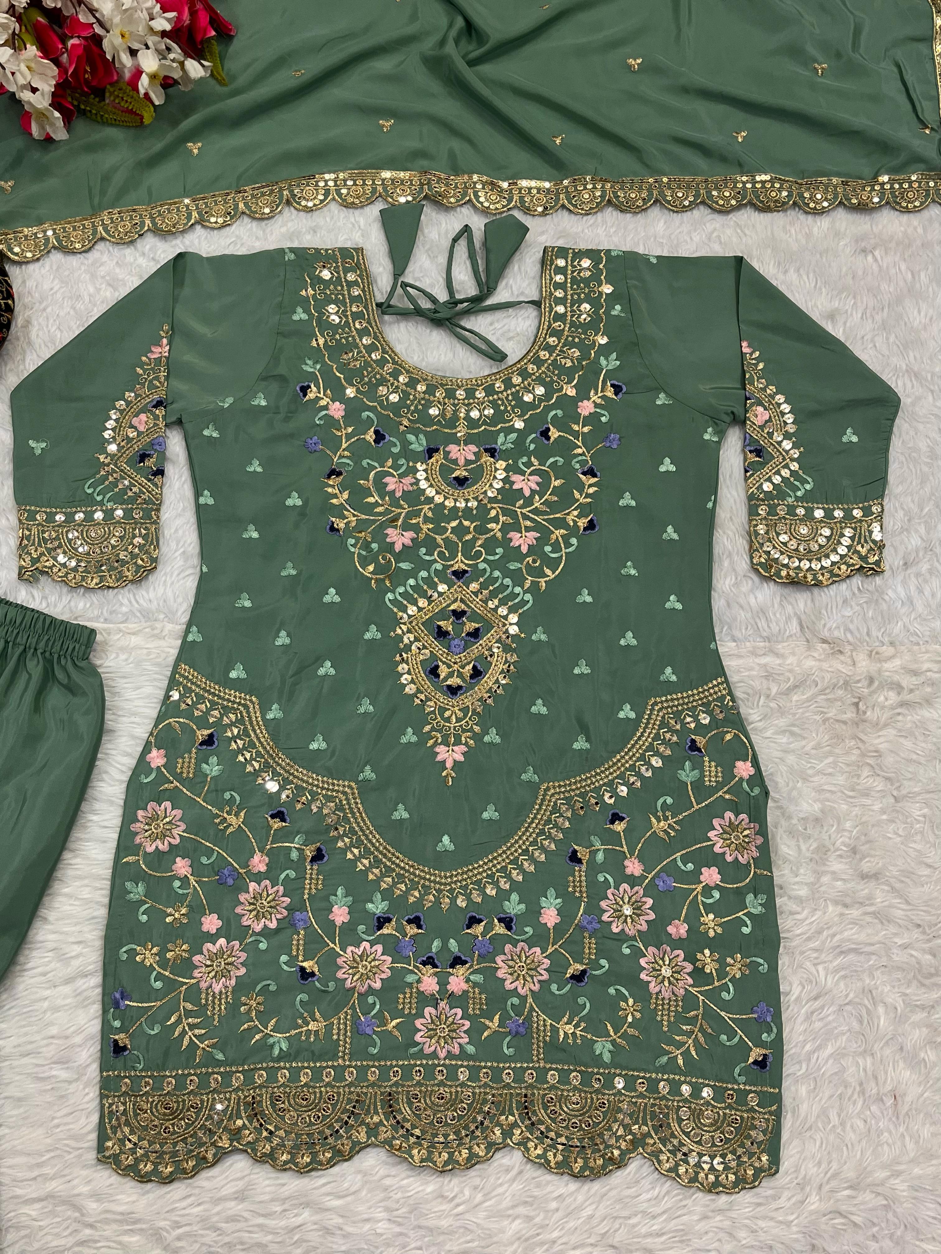 Introducing our stunning new designer ensemble – perfect for festive occasions, weddings, and special events. This premium 3-piece set includes a beautifully embroidered top, stylish sharara palazzo, and a matching dupatta – all crafted from luxurious Natural Crepe fab