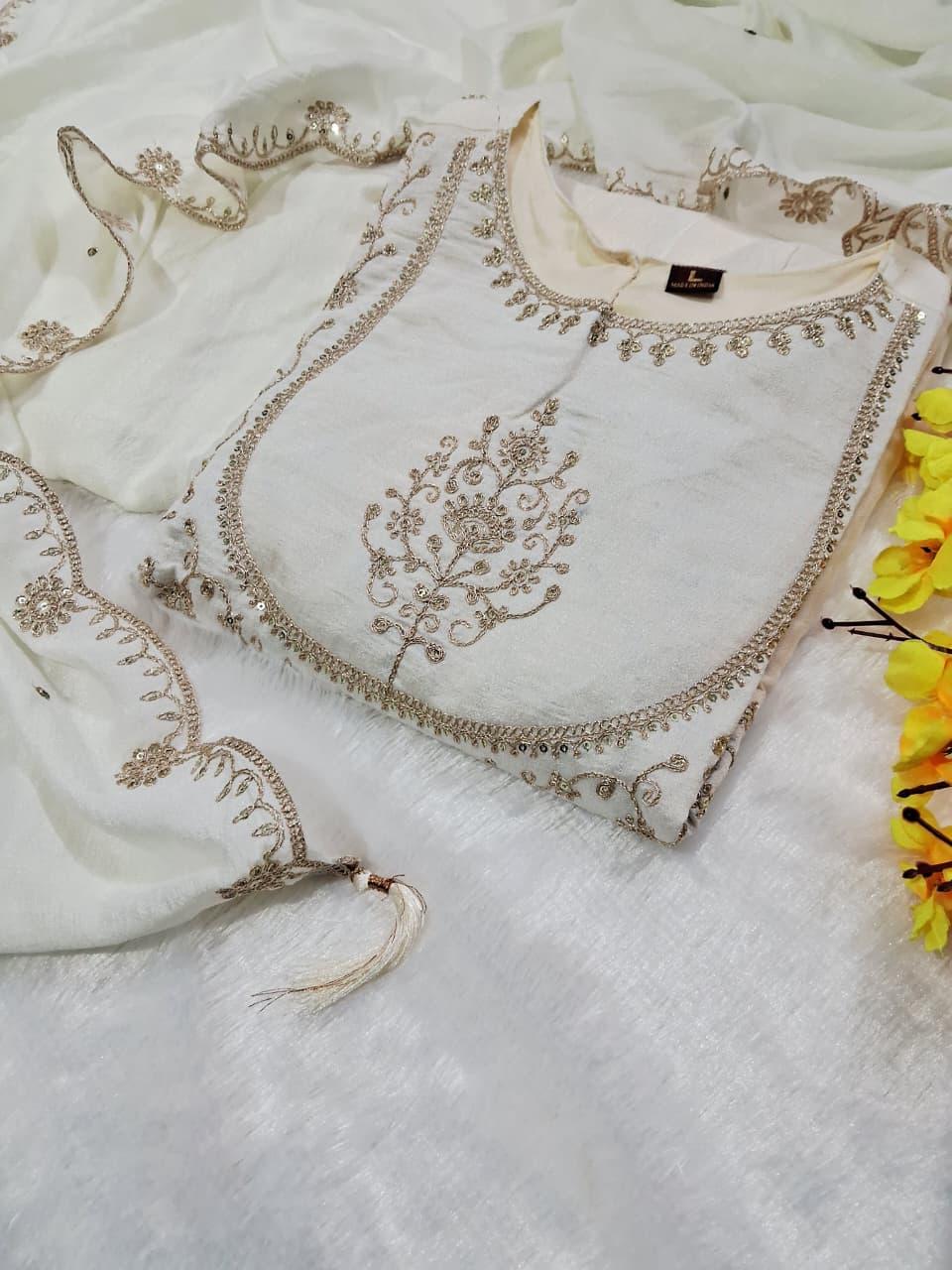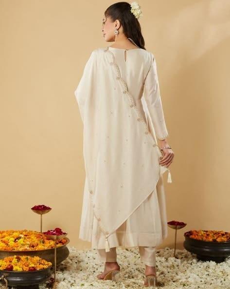 The Anarkali kurta is beautifully enhanced with embroidery sequence border cut work, finished with charming latkan detailing, giving it a luxurious designer touch.
