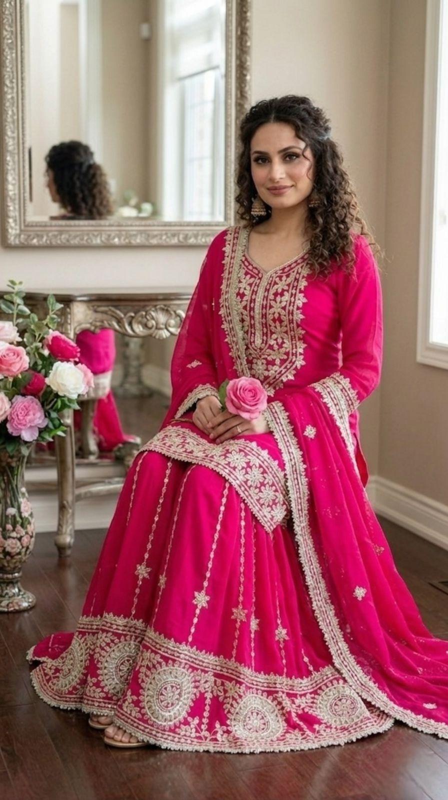 The beautifully designed top paired with a fully flared sharara palazzo and an embroidered dupatta with lace border creates a complete ethnic ensemble. Perfect for weddings, festive occasions, and evening parties.