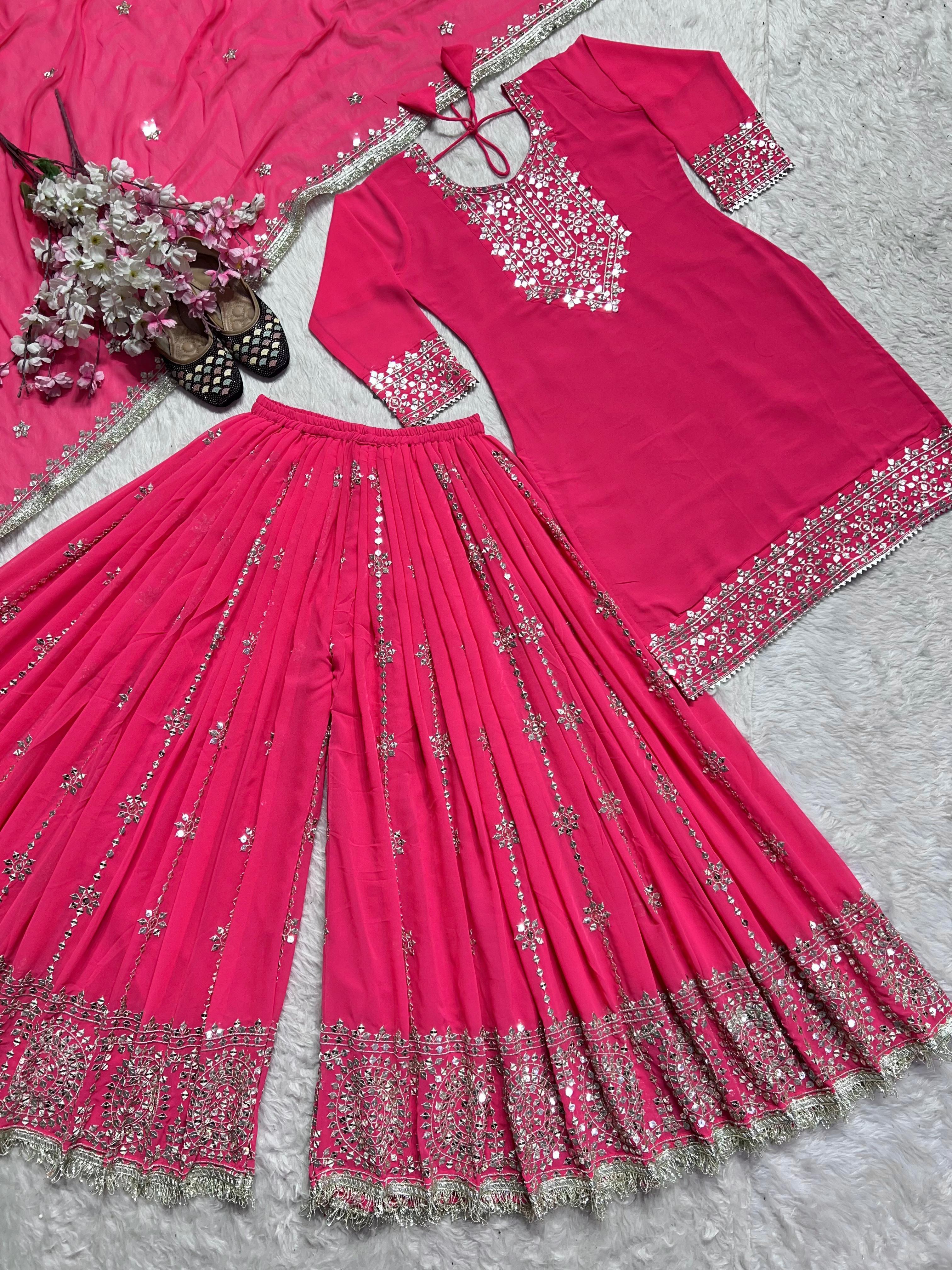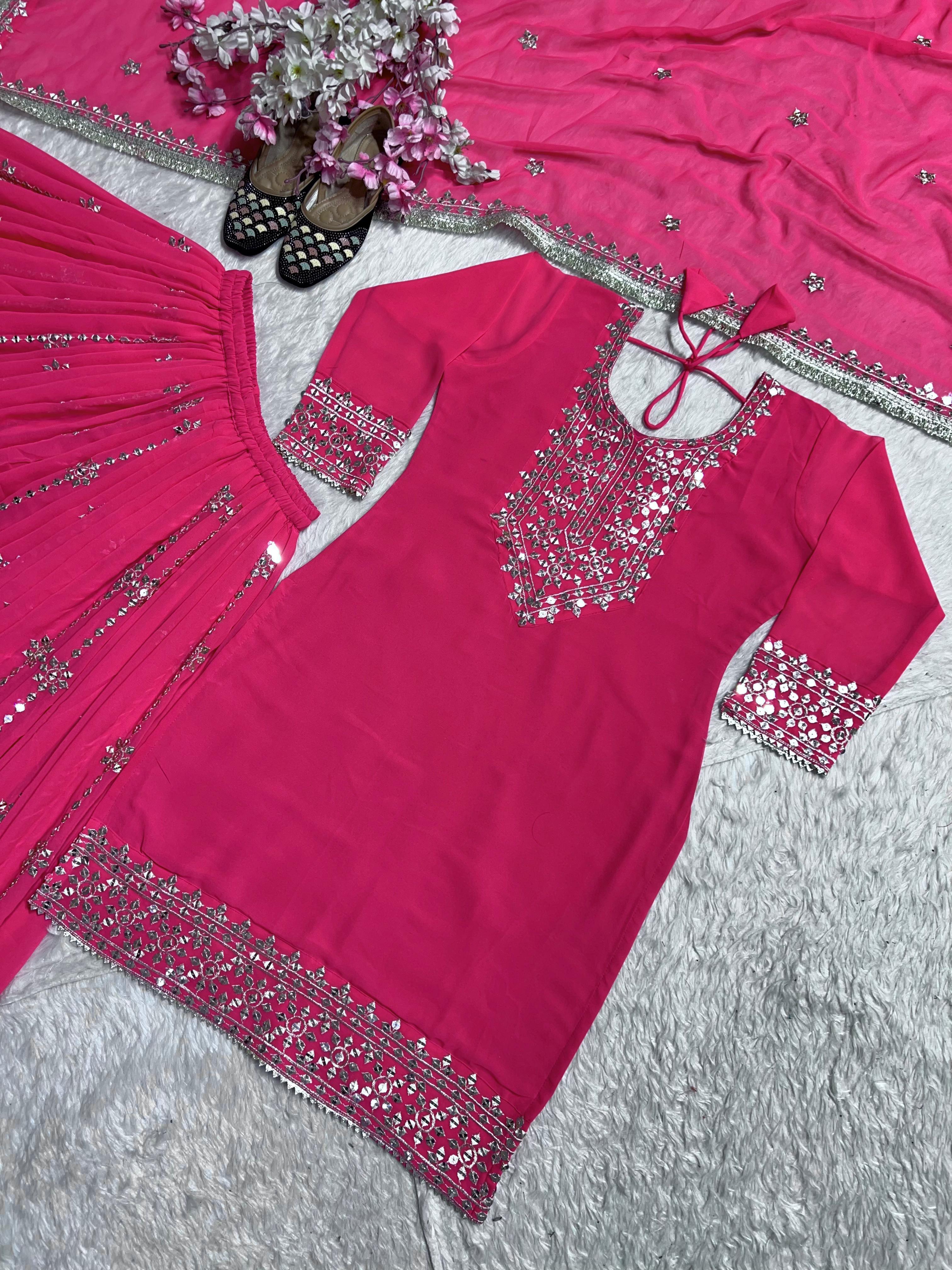 Step into elegance with this stunning designer party wear set crafted from heavy faux georgette fabric. Featuring rich 9mm embroidery sequence work, this outfit delivers a luxurious festive look with a graceful silhouette.