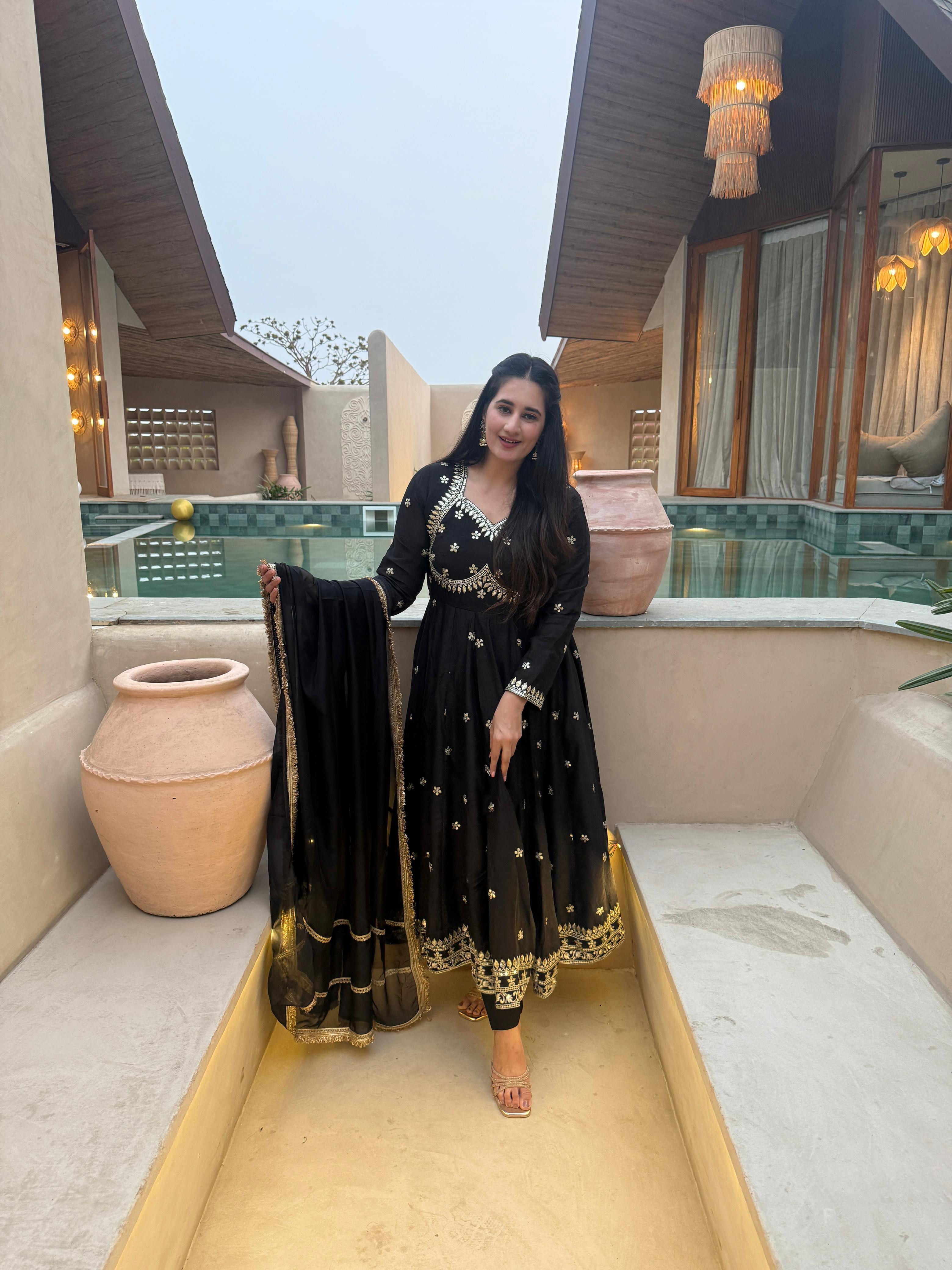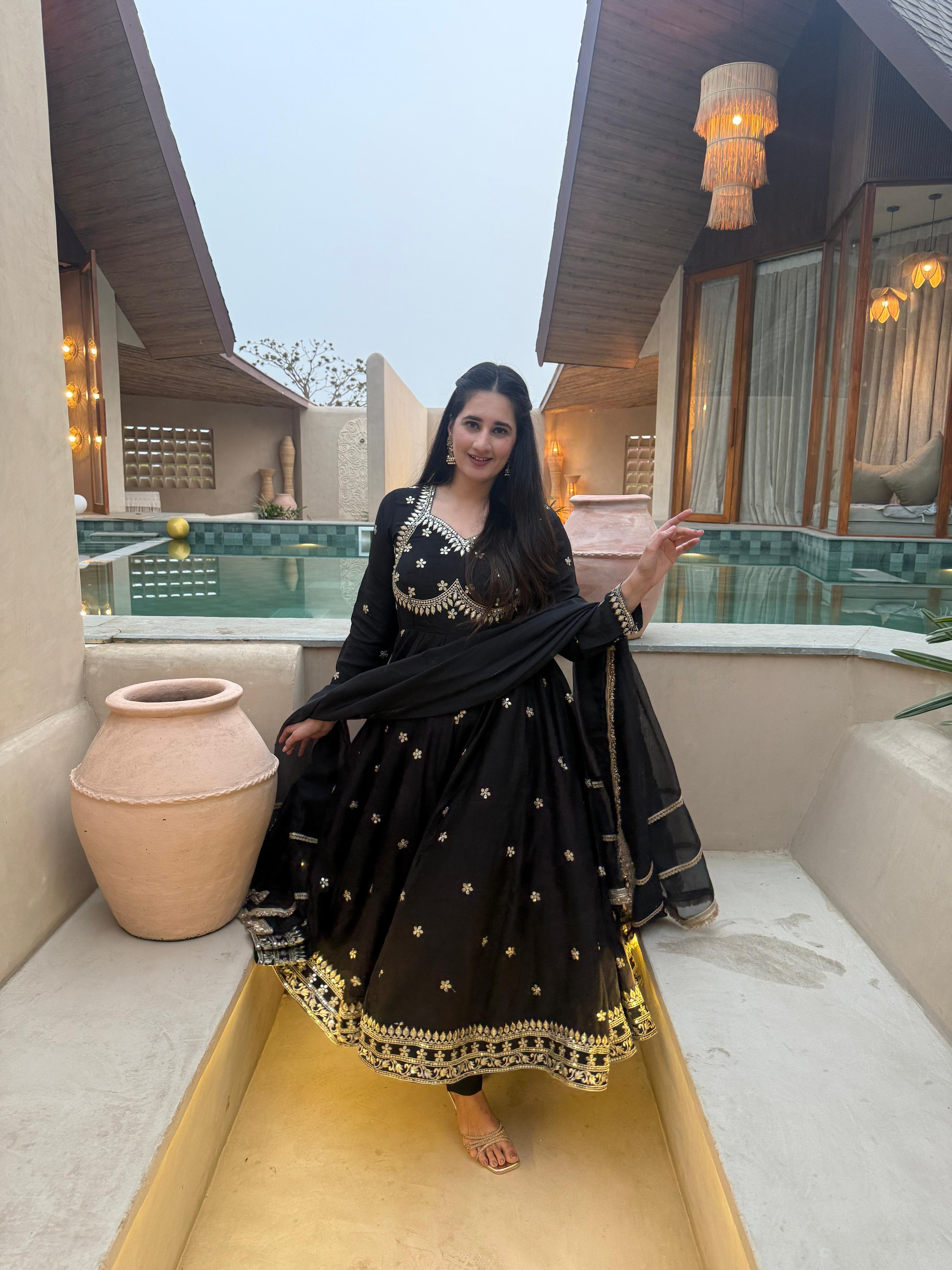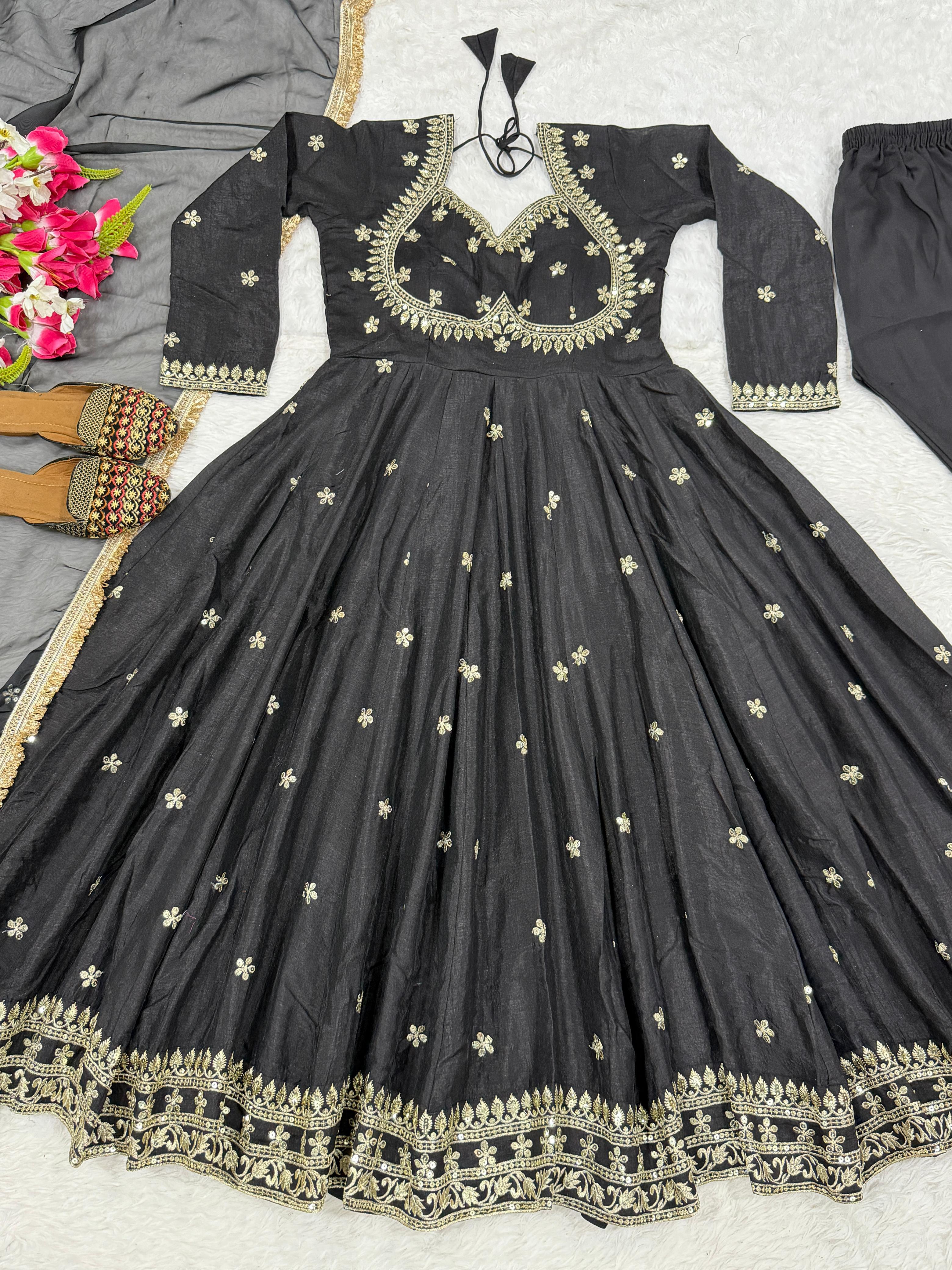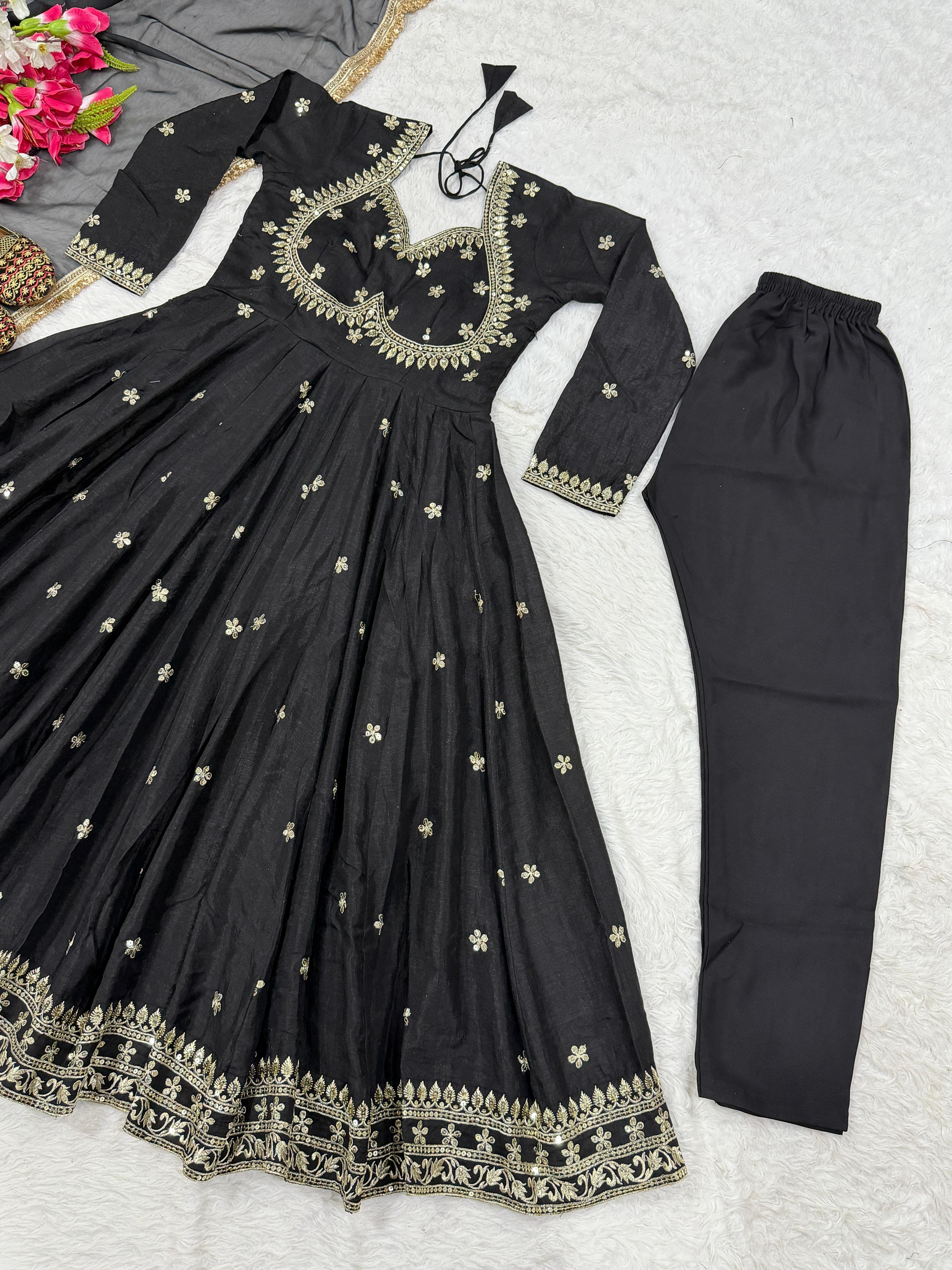 Step into timeless elegance with this designer Anarkali suit crafted from premium Vichitra silk. Featuring delicate embroidery with 5mm sequins work, this outfit offers a rich festive appeal with a graceful and flowy silhouette.
