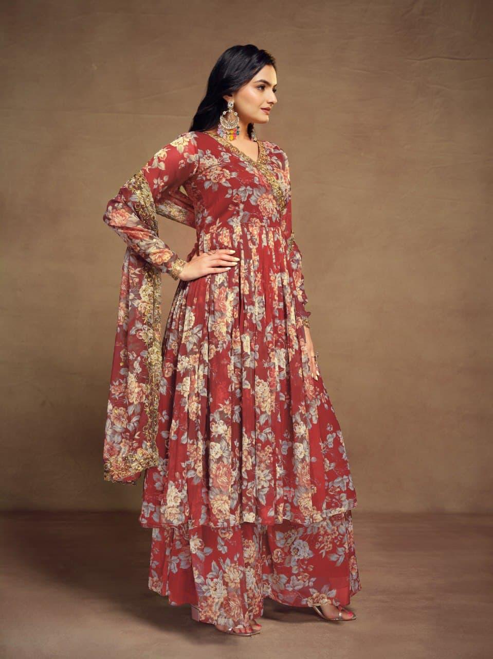 Elevate your ethnic wardrobe with the timeless elegance of our TF-297 Top Palazzo Suit, crafted with delicate chiffon fabric and adorned with beautiful zari embroidery. This sophisticated three-piece ensemble includes a flattering ready-to-wear top, a breezy georgette palazzo, and a graceful lace-bordered dupatta – perfect for festive gatherings, weddings, or special occasions.