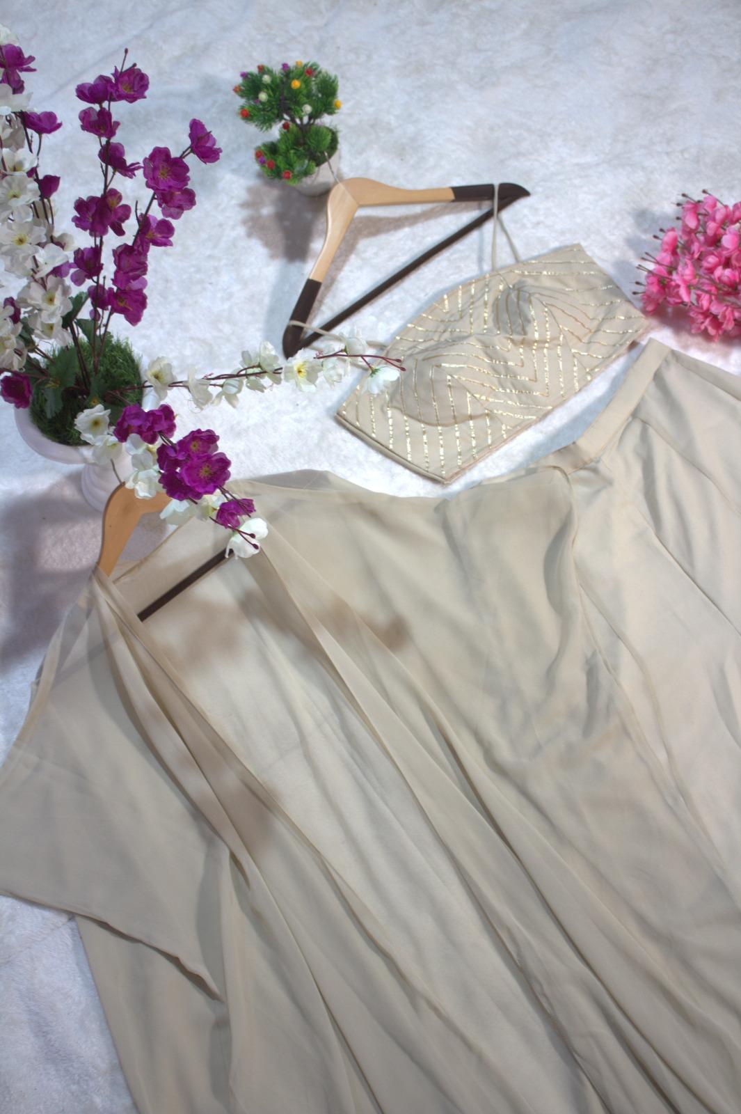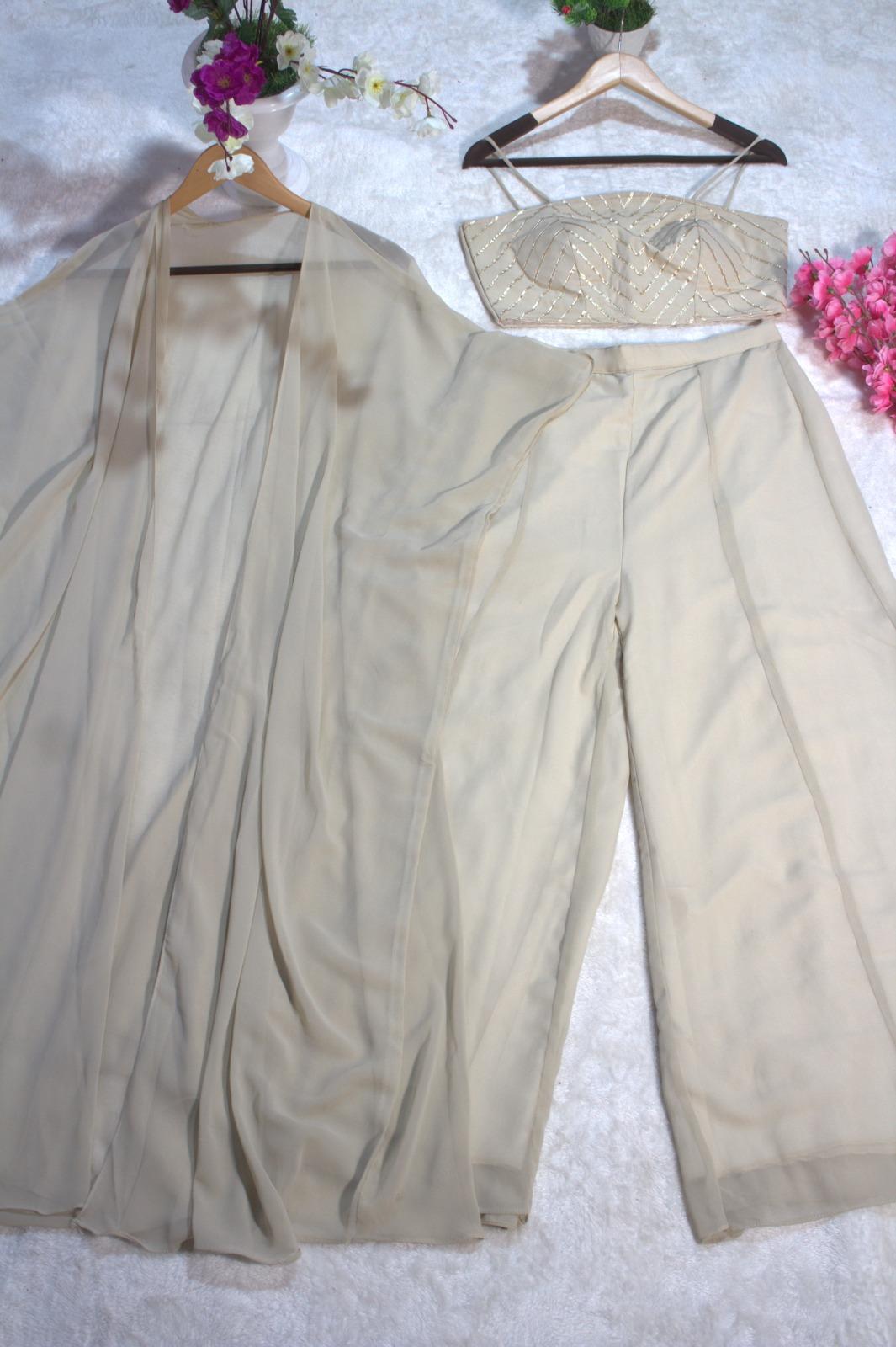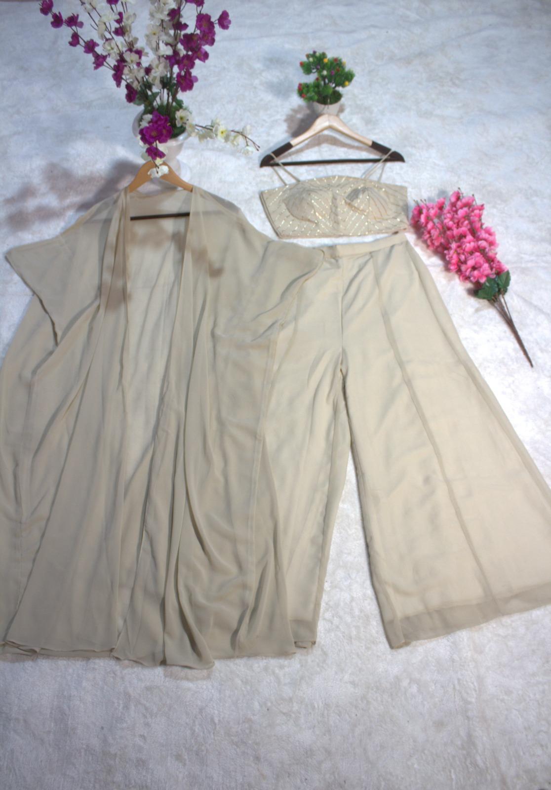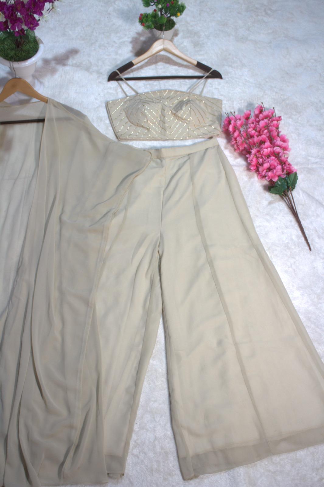 Product Description Glow in style with the TF-366 Georgette Ensemble, a ready-to-wear 3-piece set that blends comfort with couture. This elegant outfit features a gorgeous gotta patti work top, flowy palazzo, and a stylish shrug, all crafted in lightweight Georgette for a graceful drape and timeless appeal. Designed for effortless style, this set ensures you shine at festive gatherings, parties, and casual celebrations alike.