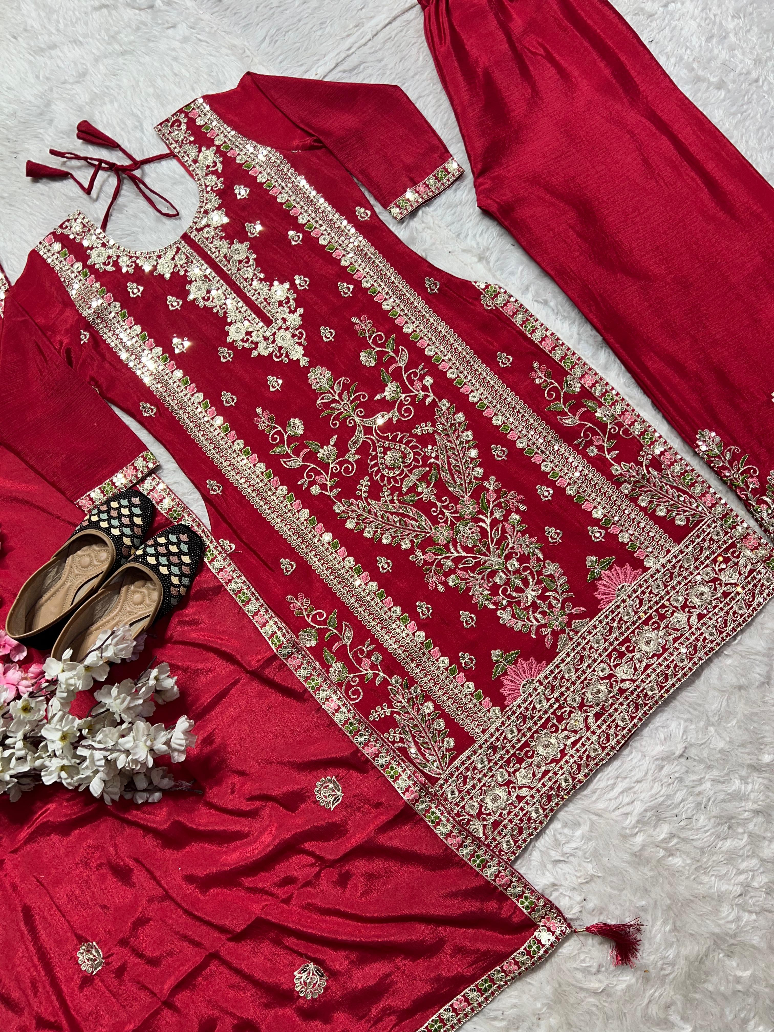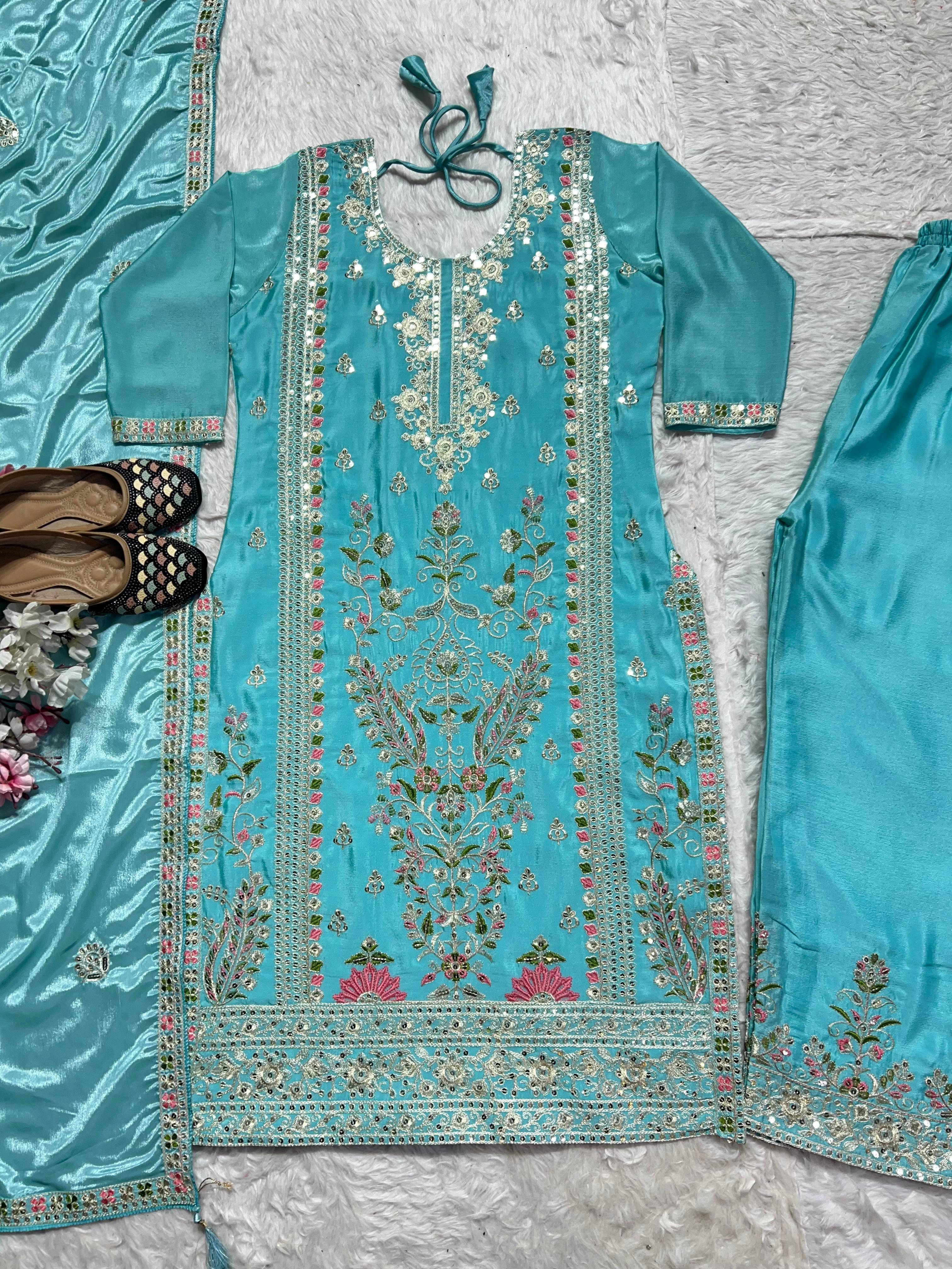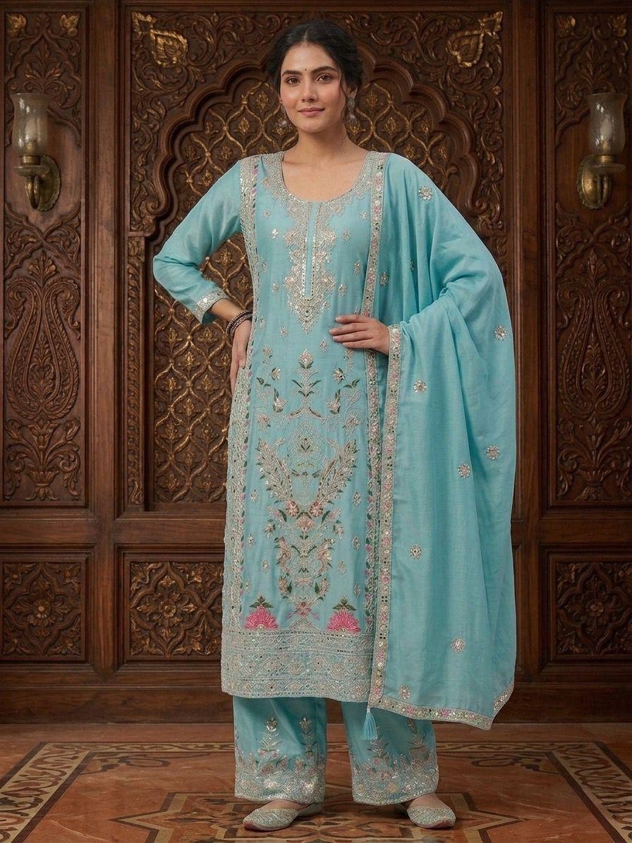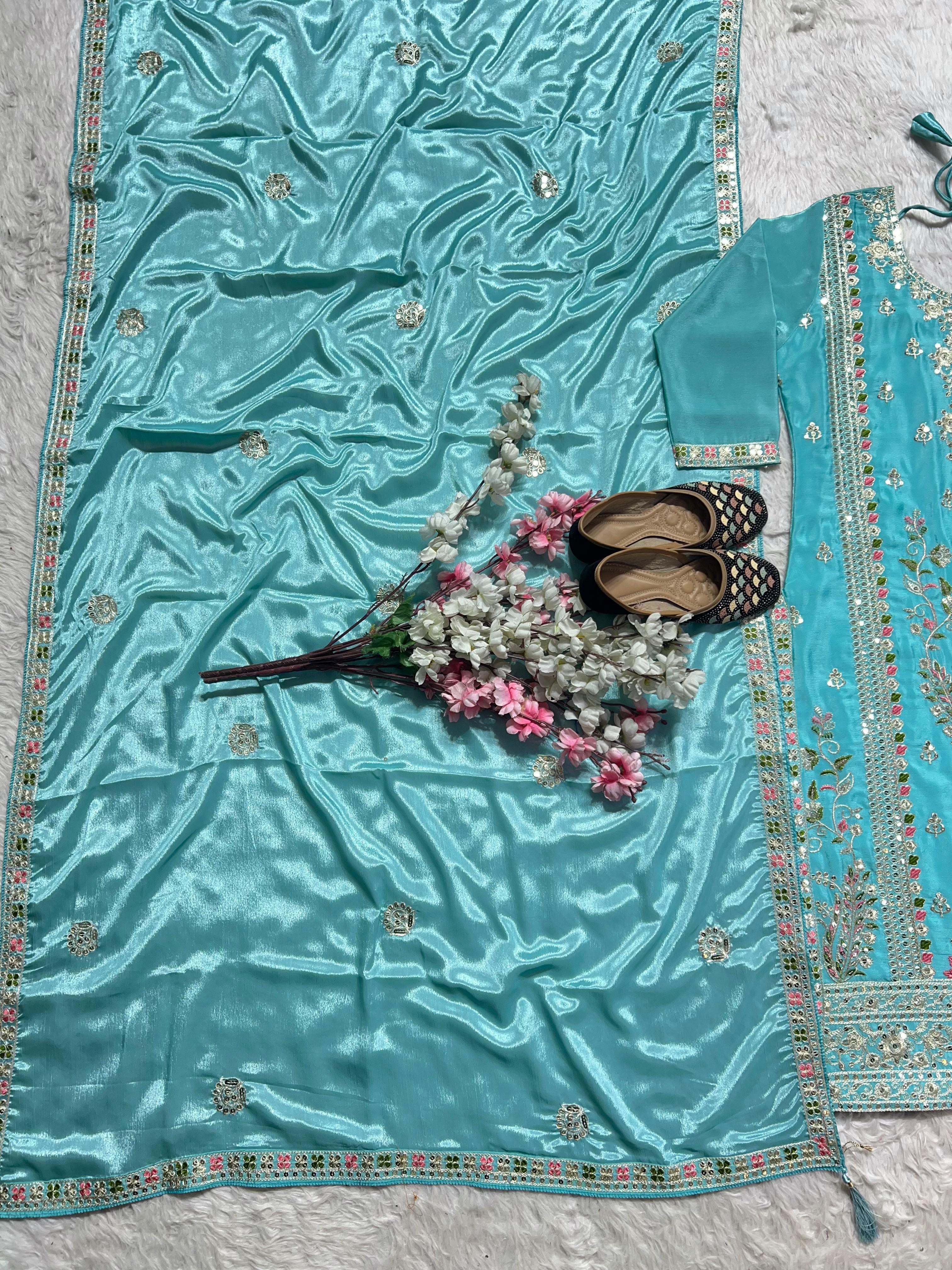 Elevate your ethnic wardrobe with this beautifully crafted Chinon silk suit set, designed to offer both elegance and comfort. Featuring intricate embroidery coding with sequins work, this outfit delivers a rich festive look with a graceful silhouette.