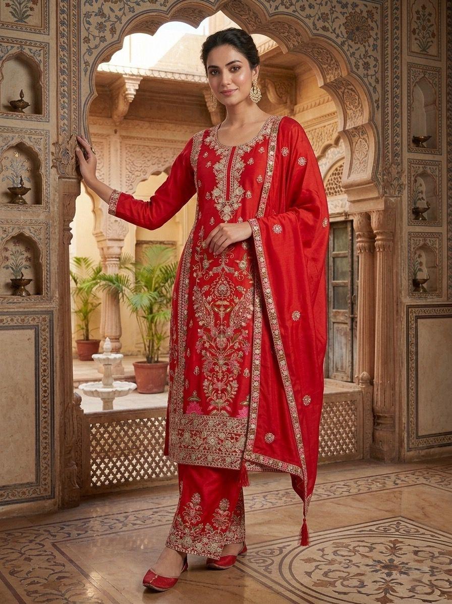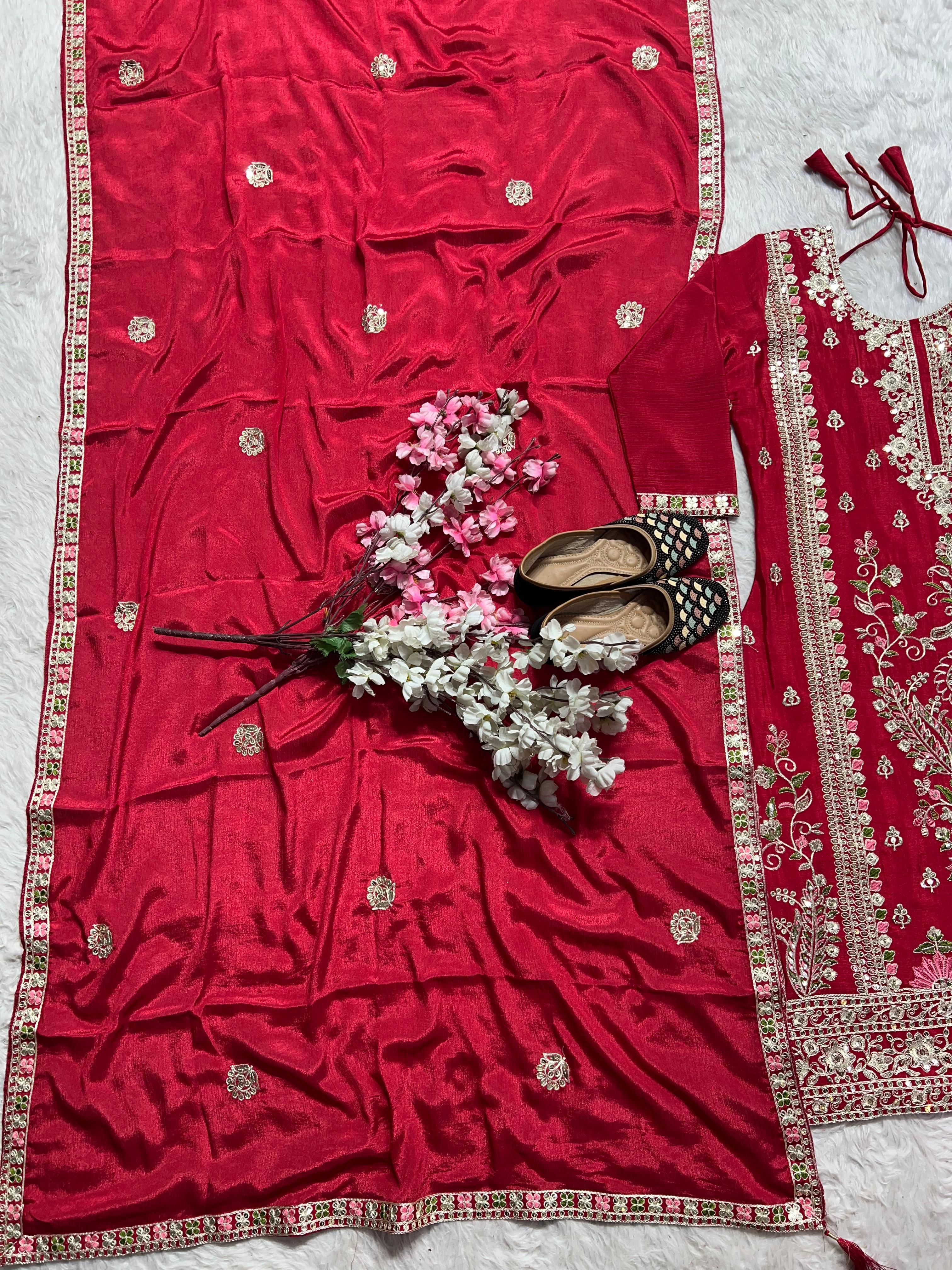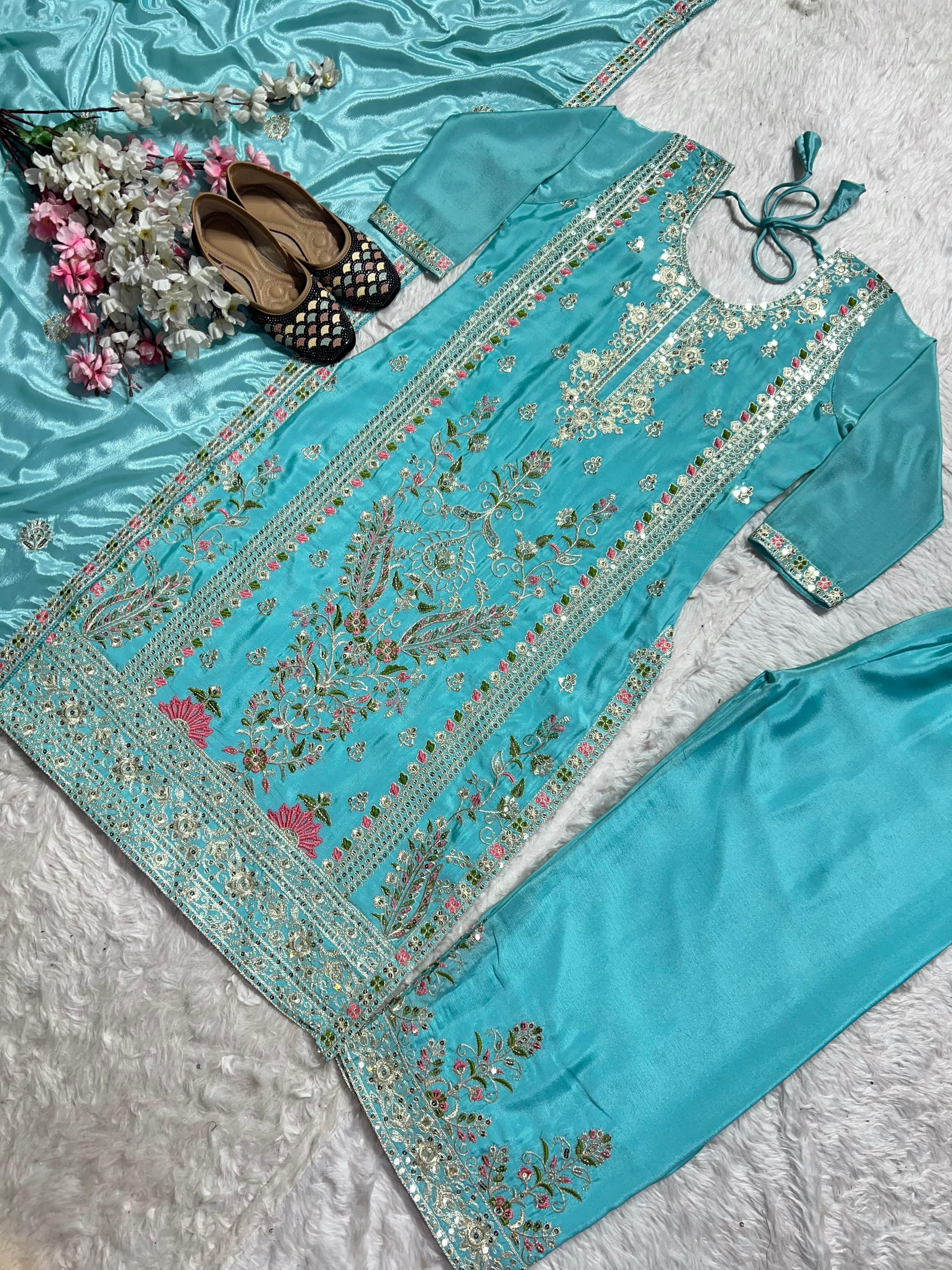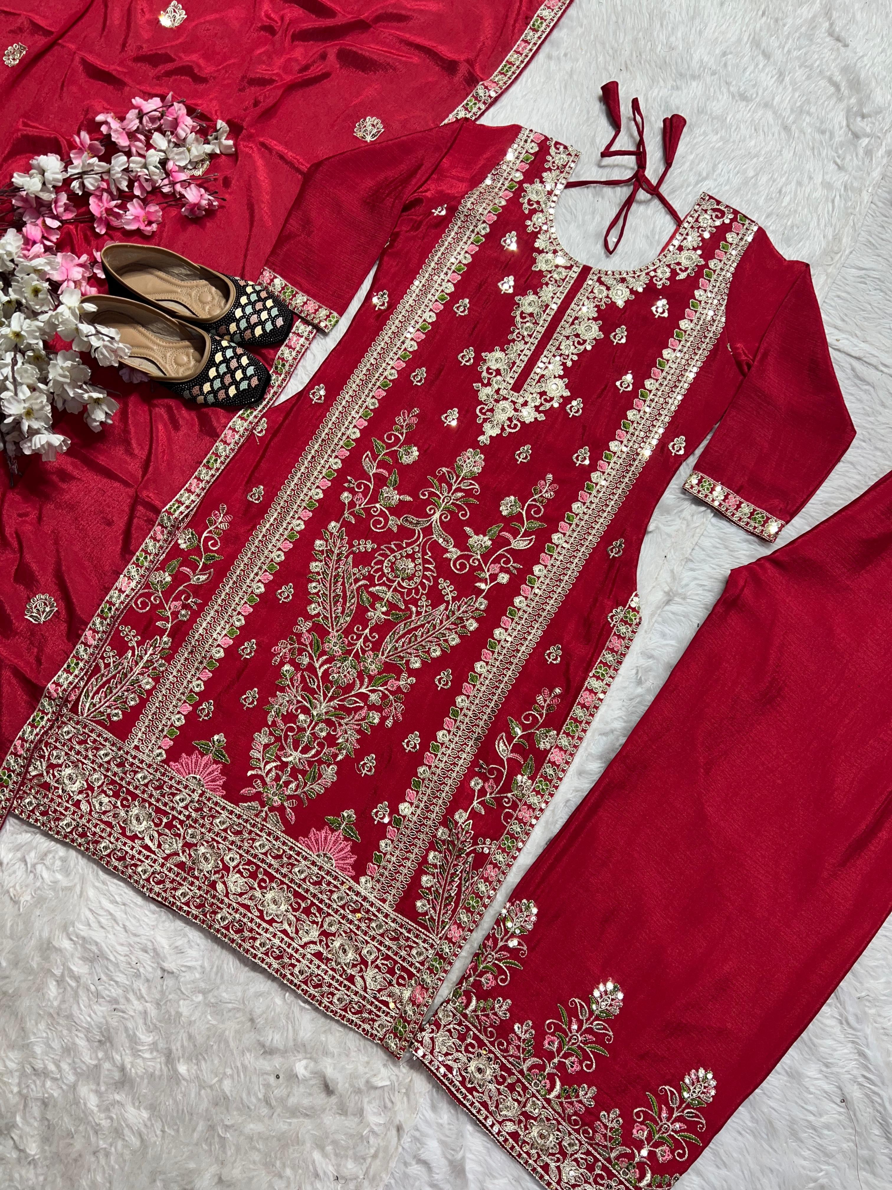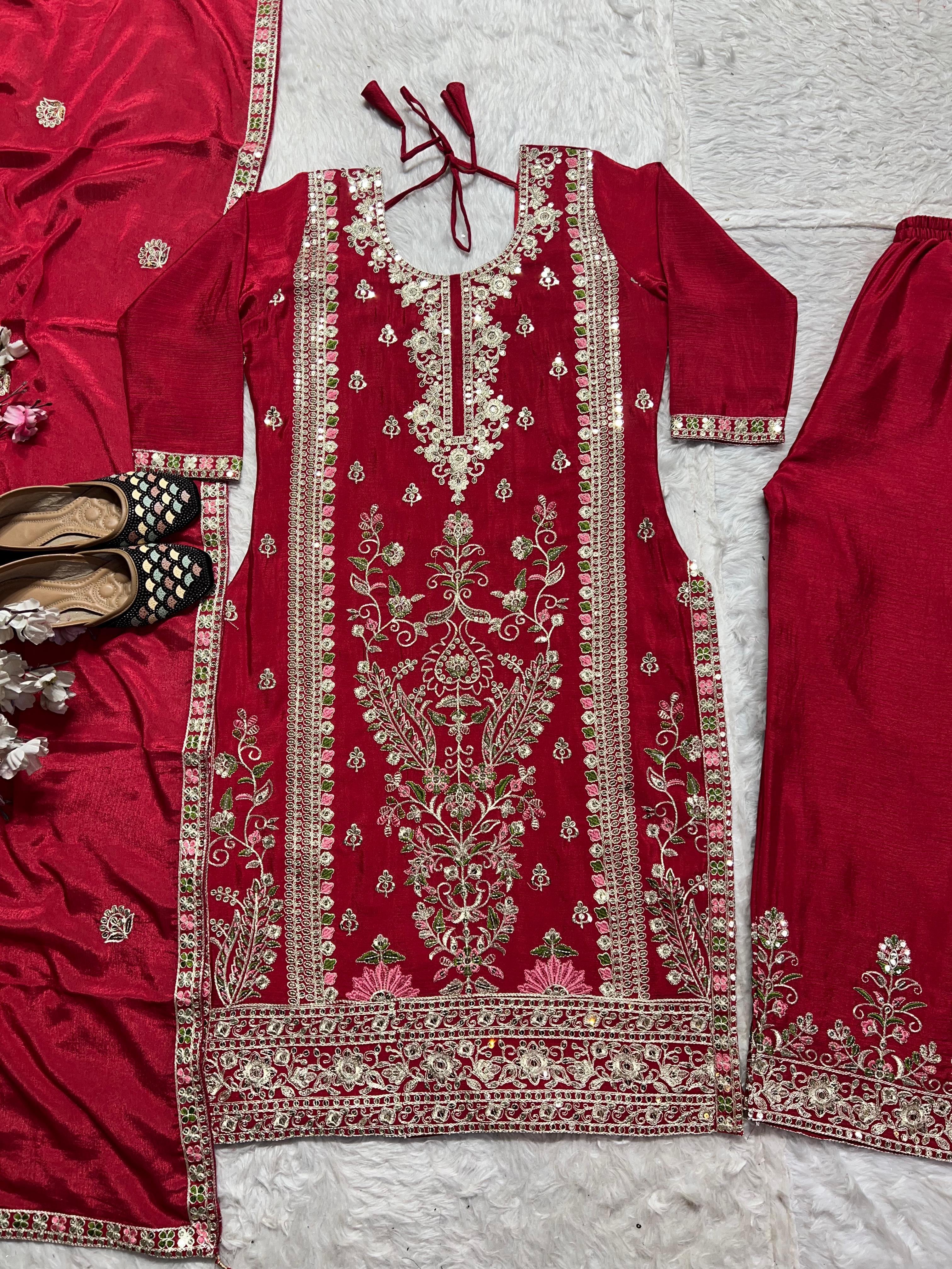 Elevate your ethnic wardrobe with this beautifully crafted Chinon silk suit set, designed to offer both elegance and comfort. Featuring intricate embroidery coding with sequins work, this outfit delivers a rich festive look with a graceful silhouette.