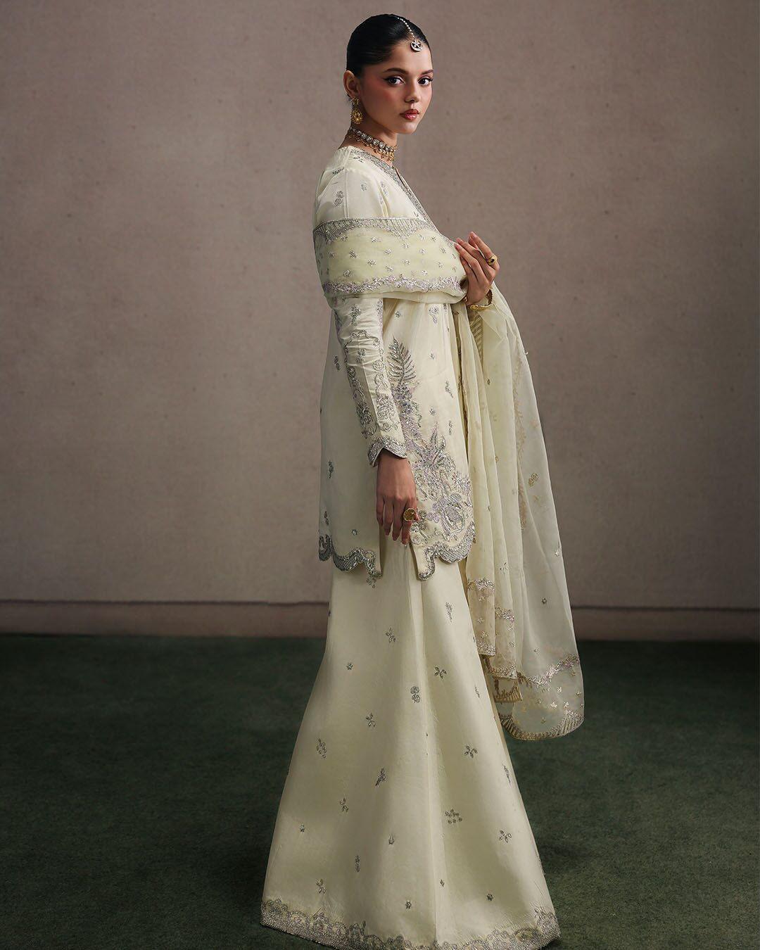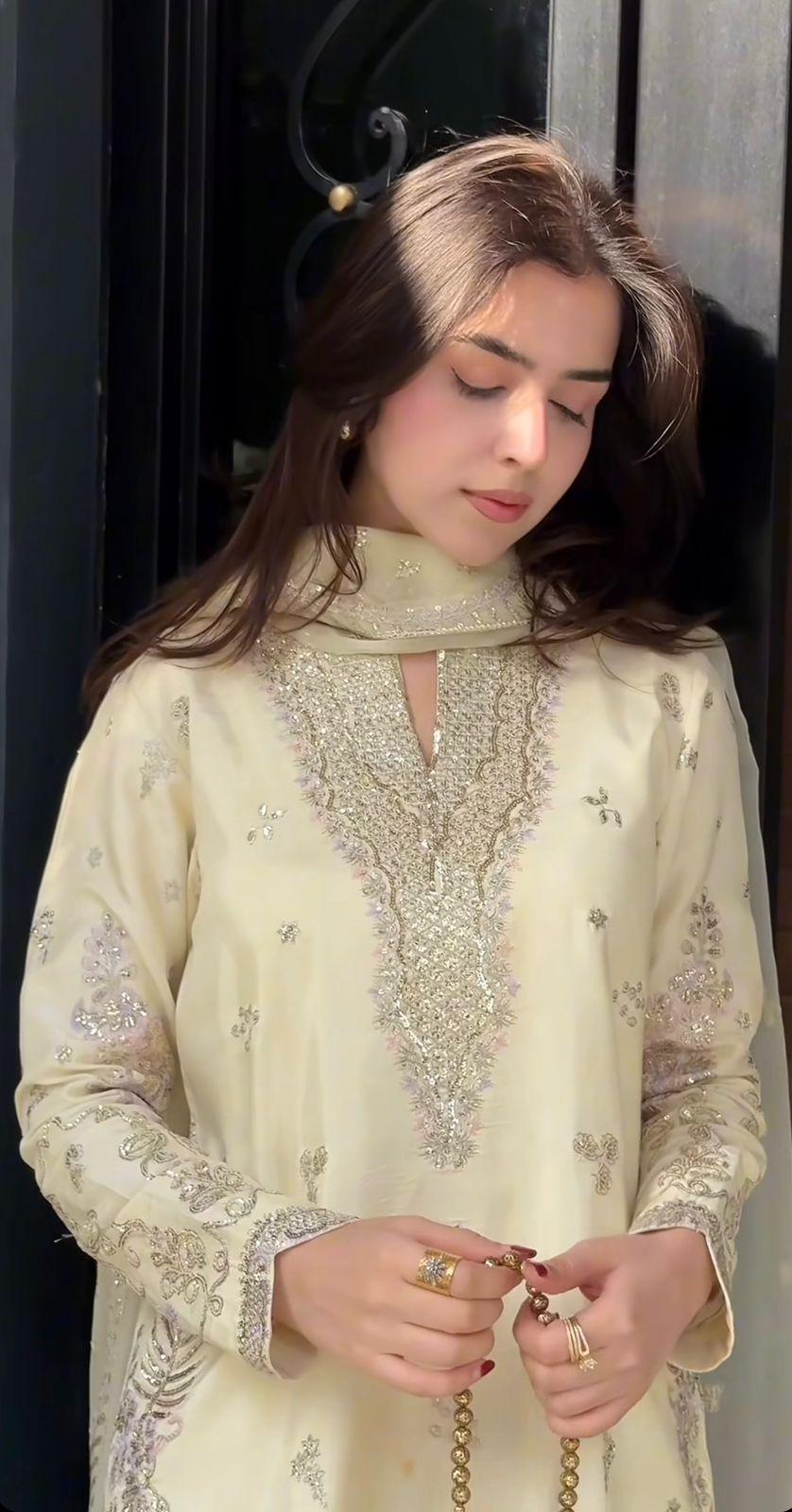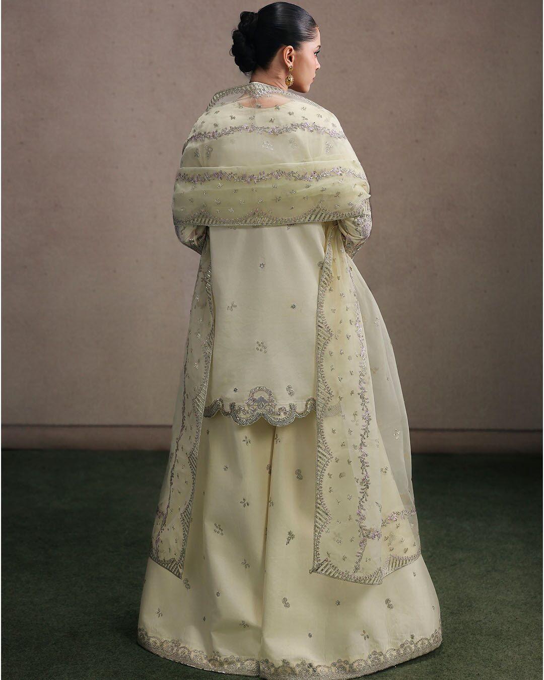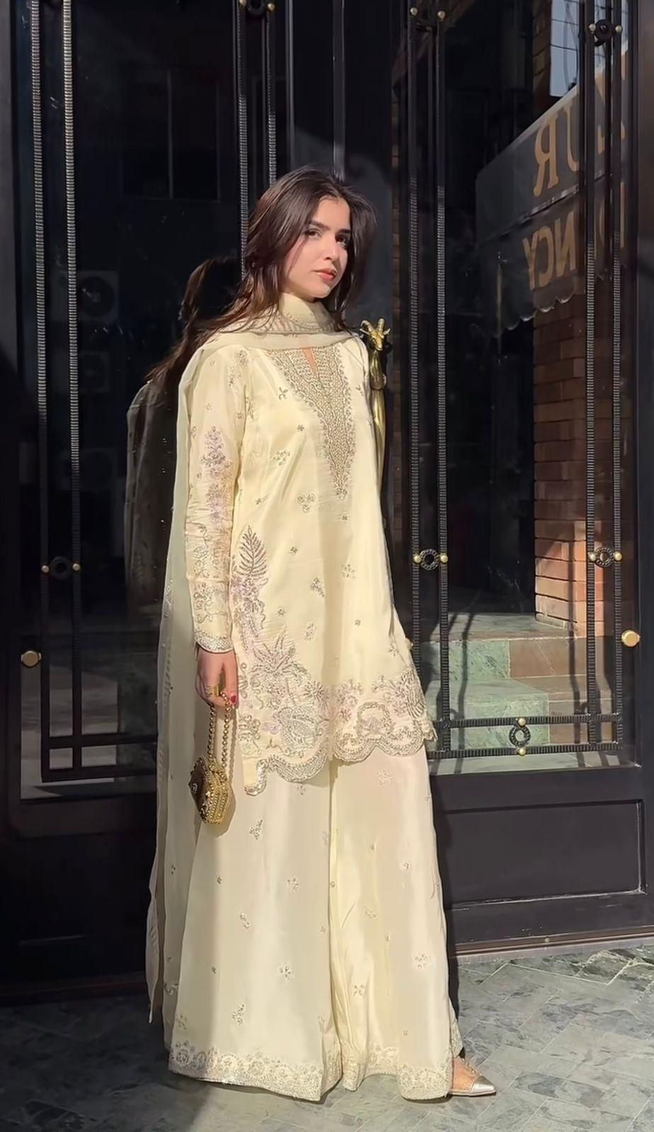 The outfit is paired with a fully stitched sharara palazzo with matching embroidery work, creating a beautifully flared silhouette. Completing the look is a pure tabby organza silk dupatta with detailed embroidery, adding a lightweight and sophisticated finish.