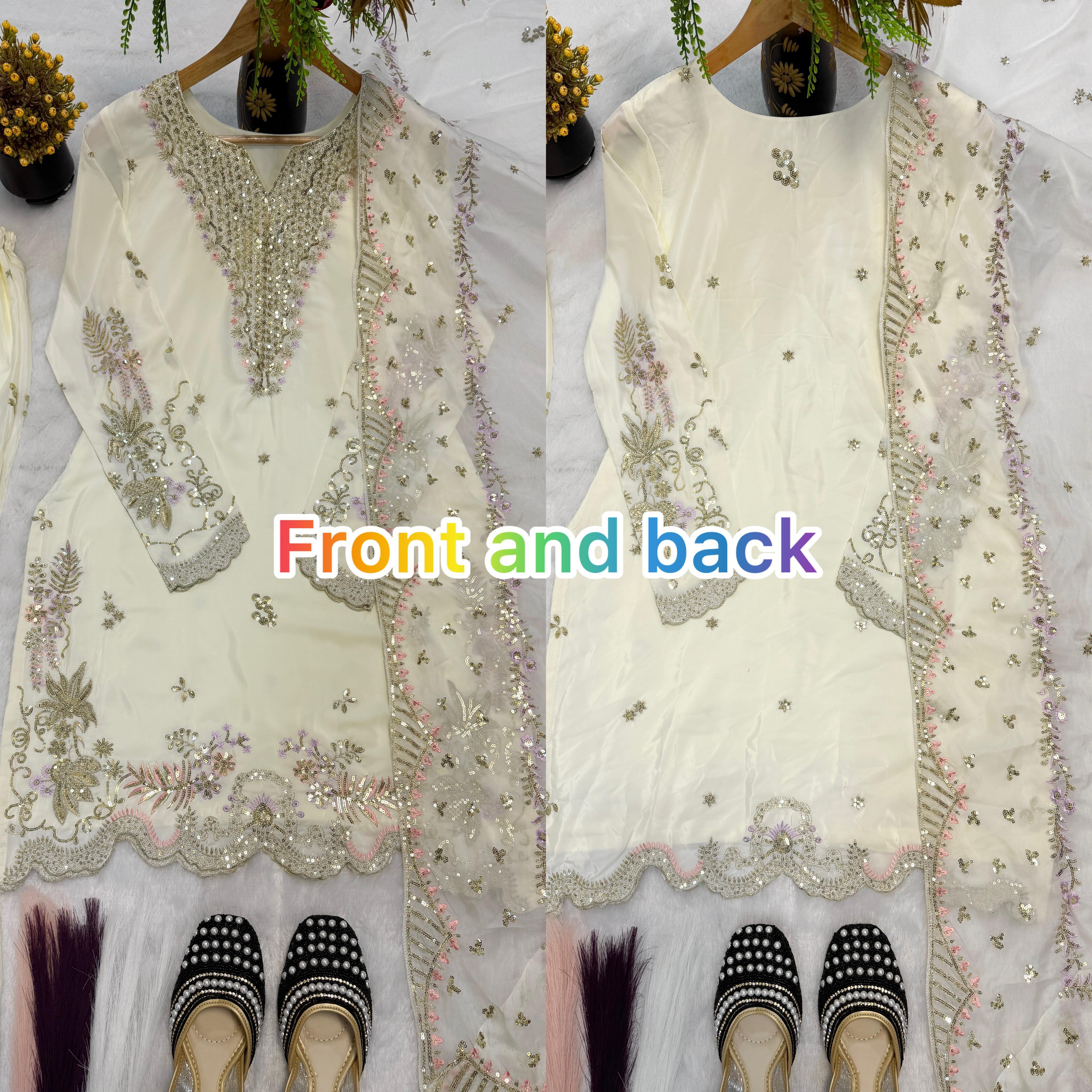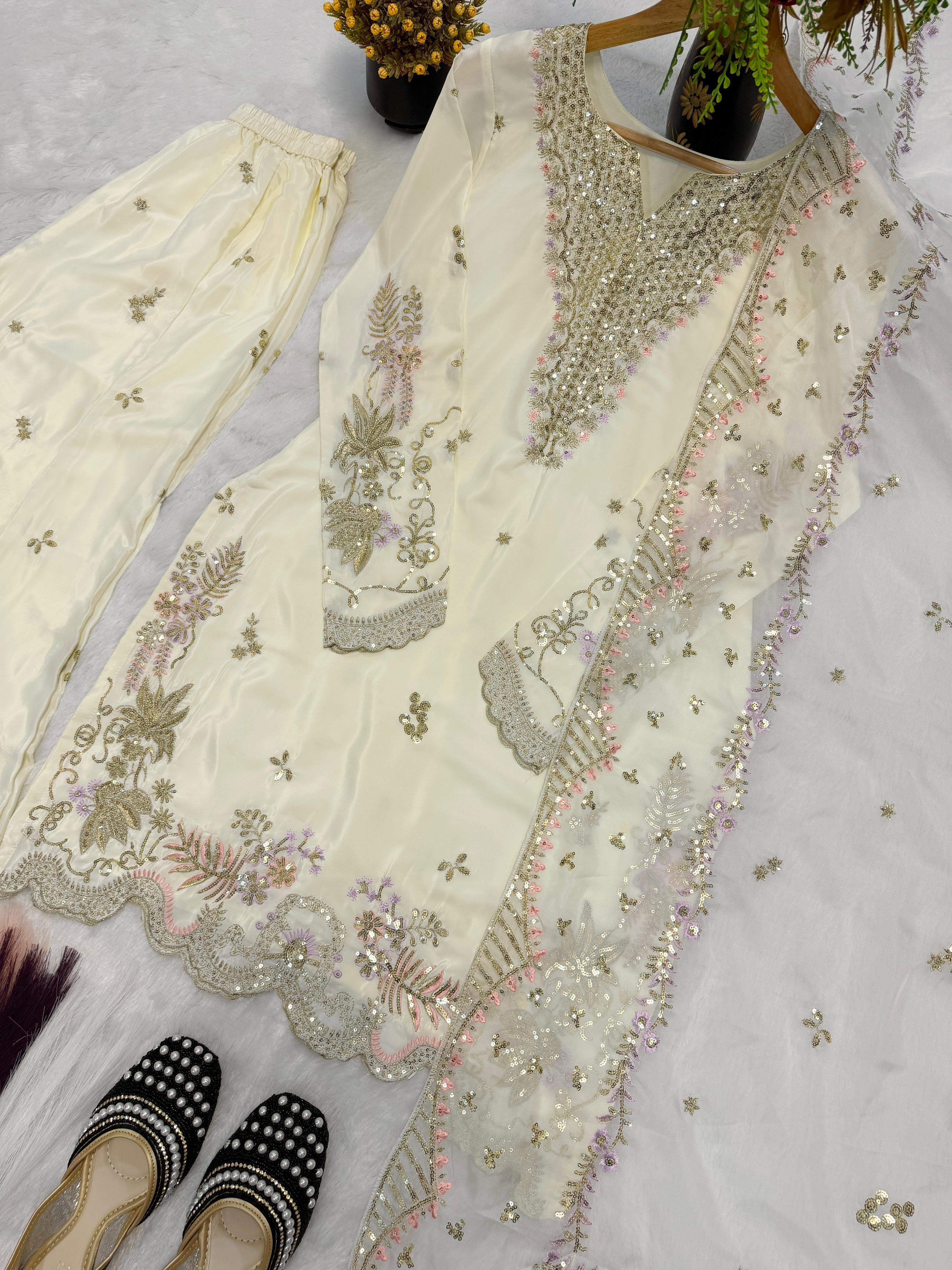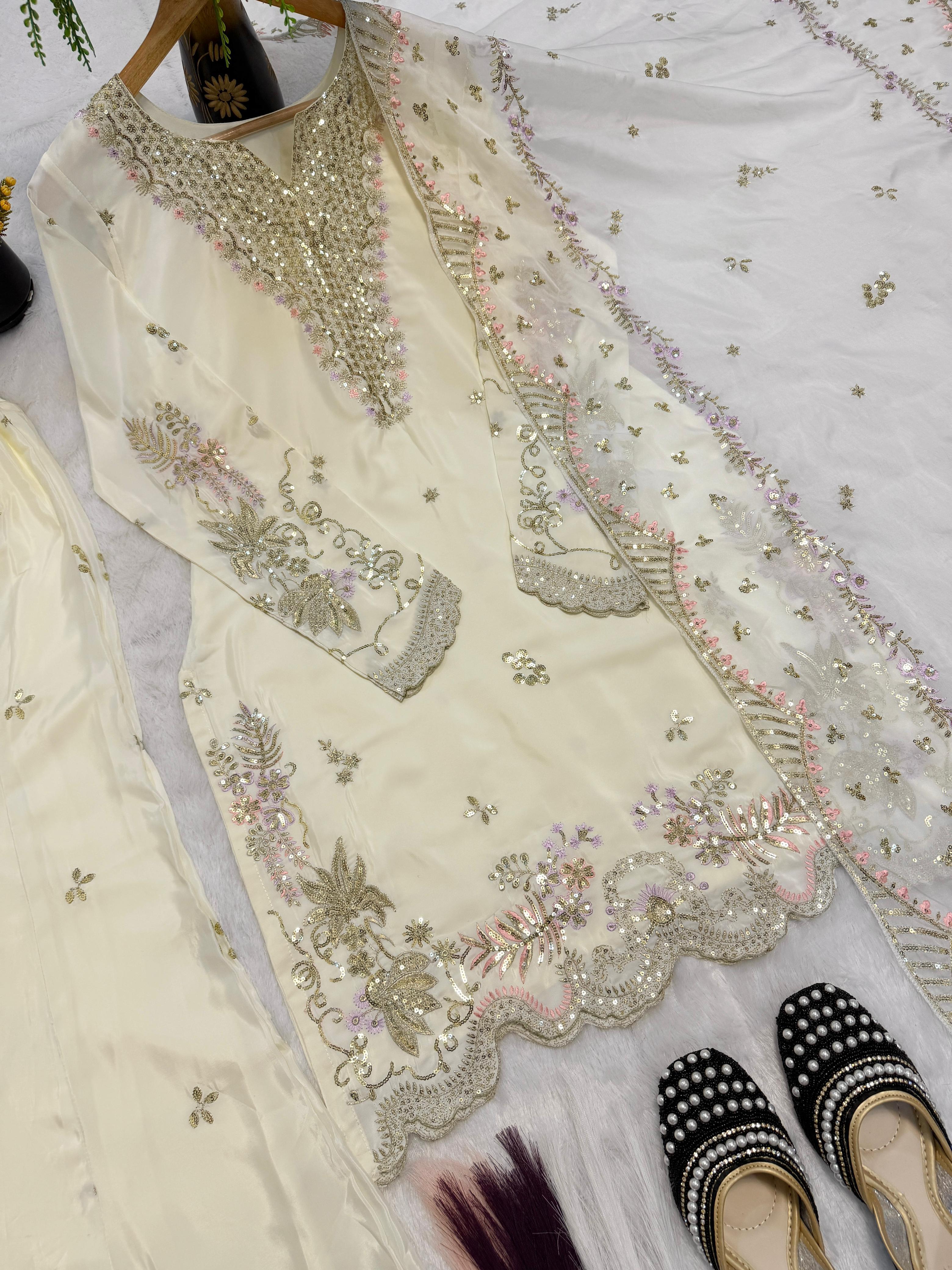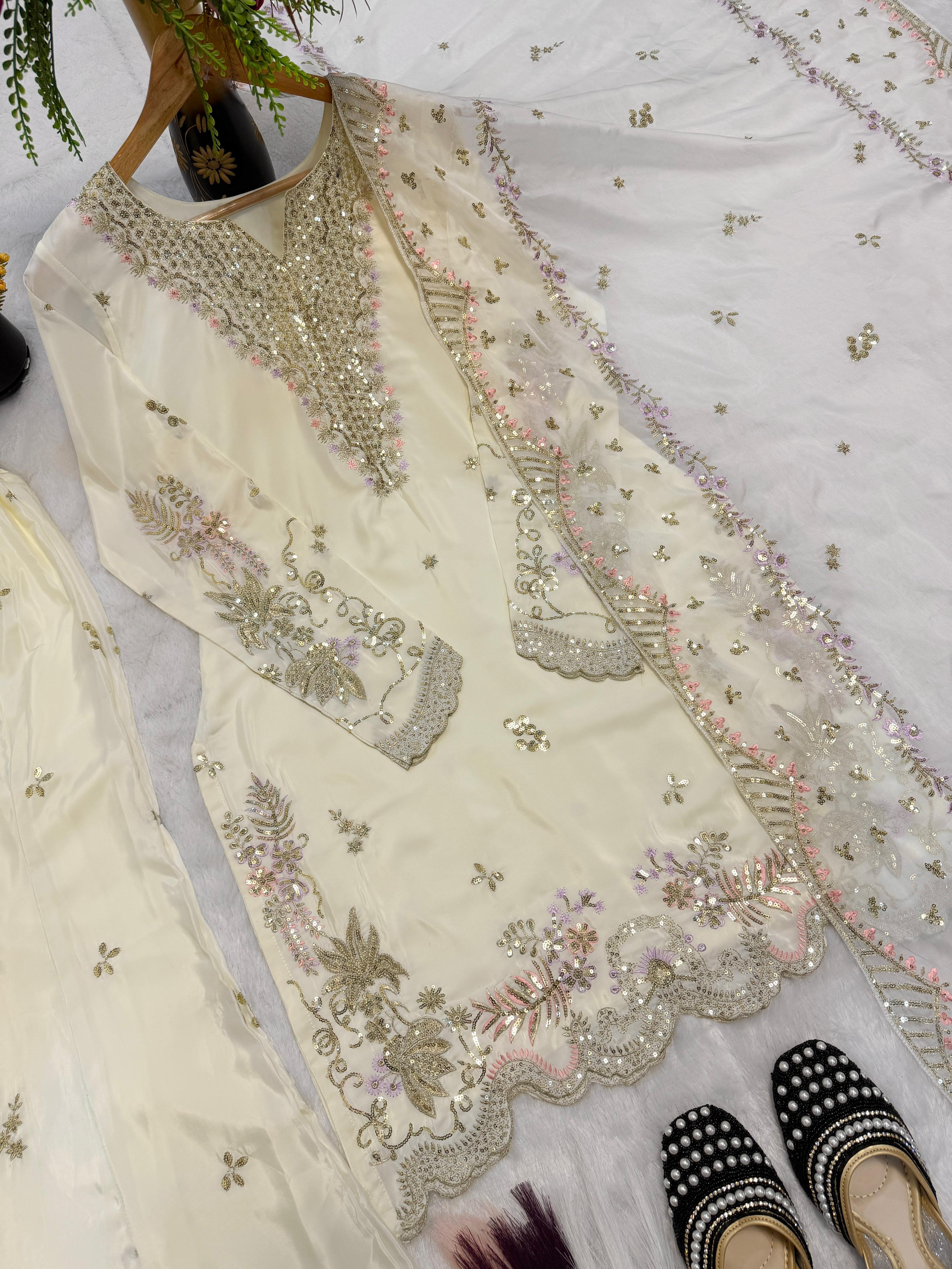 The outfit is paired with a fully stitched sharara palazzo with matching embroidery work, creating a beautifully flared silhouette. Completing the look is a pure tabby organza silk dupatta with detailed embroidery, adding a lightweight and sophisticated finish.