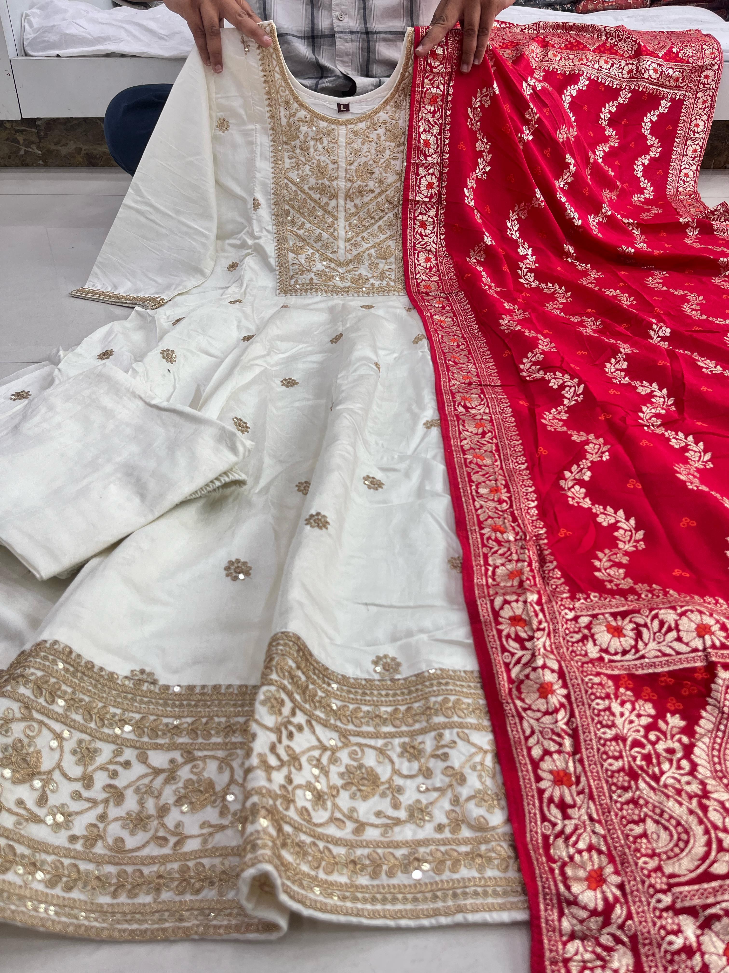 The Anarkali kurti features a graceful flare that cascades beautifully, creating a regal silhouette. Intricate golden zari detailing on the yoke adds a traditional touch, while the soft silk fabric ensures comfort throughout the day. The set comes with a complementary Banarasi silk dupatta to complete the look. Perfect for weddings, festivals, and special gatherings, this set embodies grace in every thread and tradition in every weave.