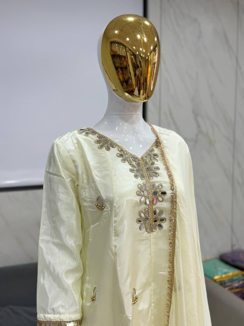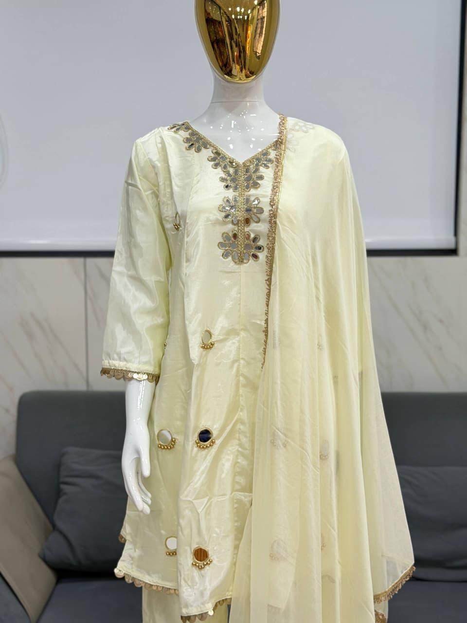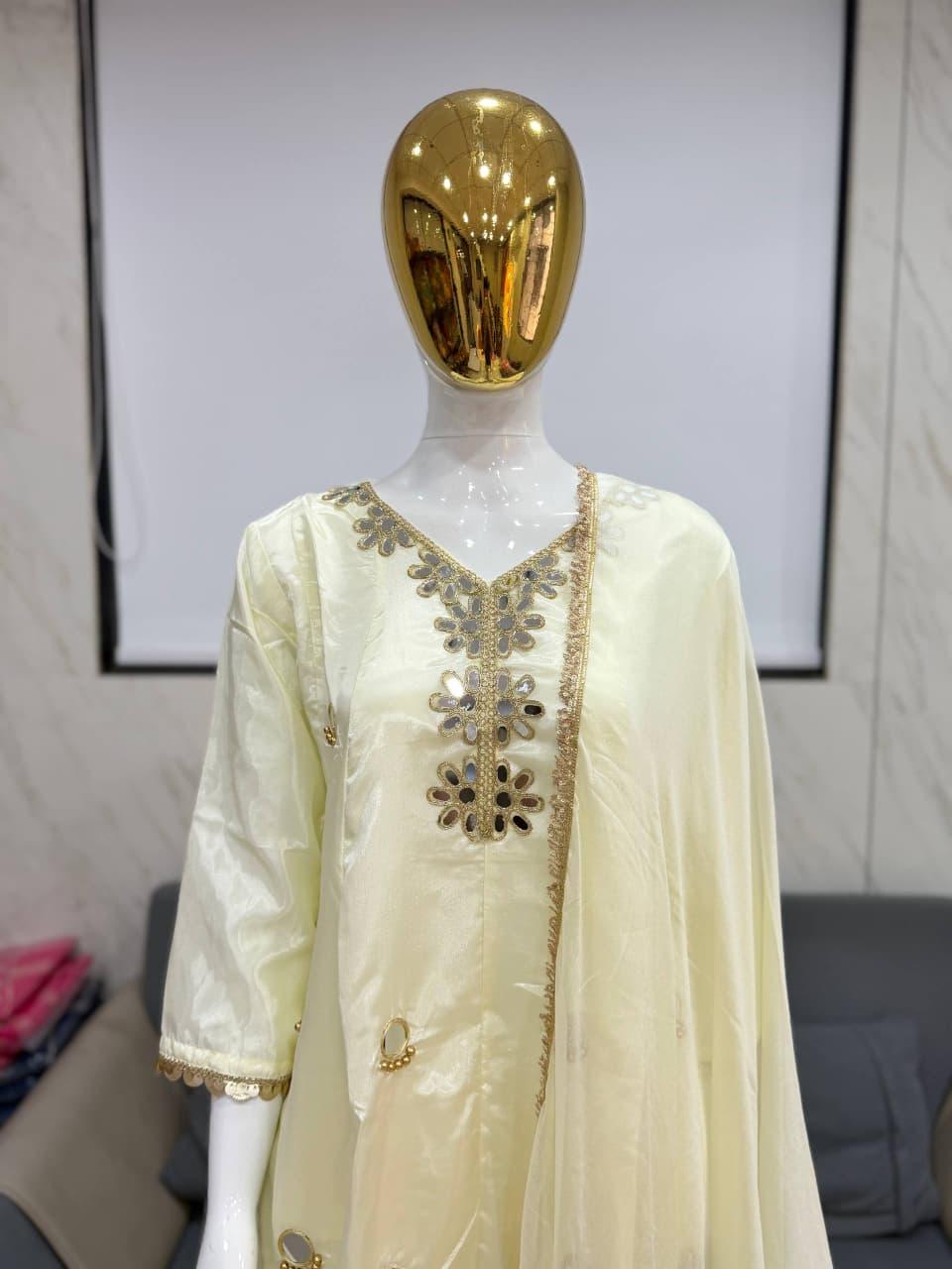 The soft ivory-cream hue radiates grace, while the premium tissue silk fabric adds a rich natural shine that enhances its luxurious appeal. Adorned with exquisite mirror work and refined floral embroidery, this ensemble beautifully reflects traditional craftsmanship blended with modern elegance.