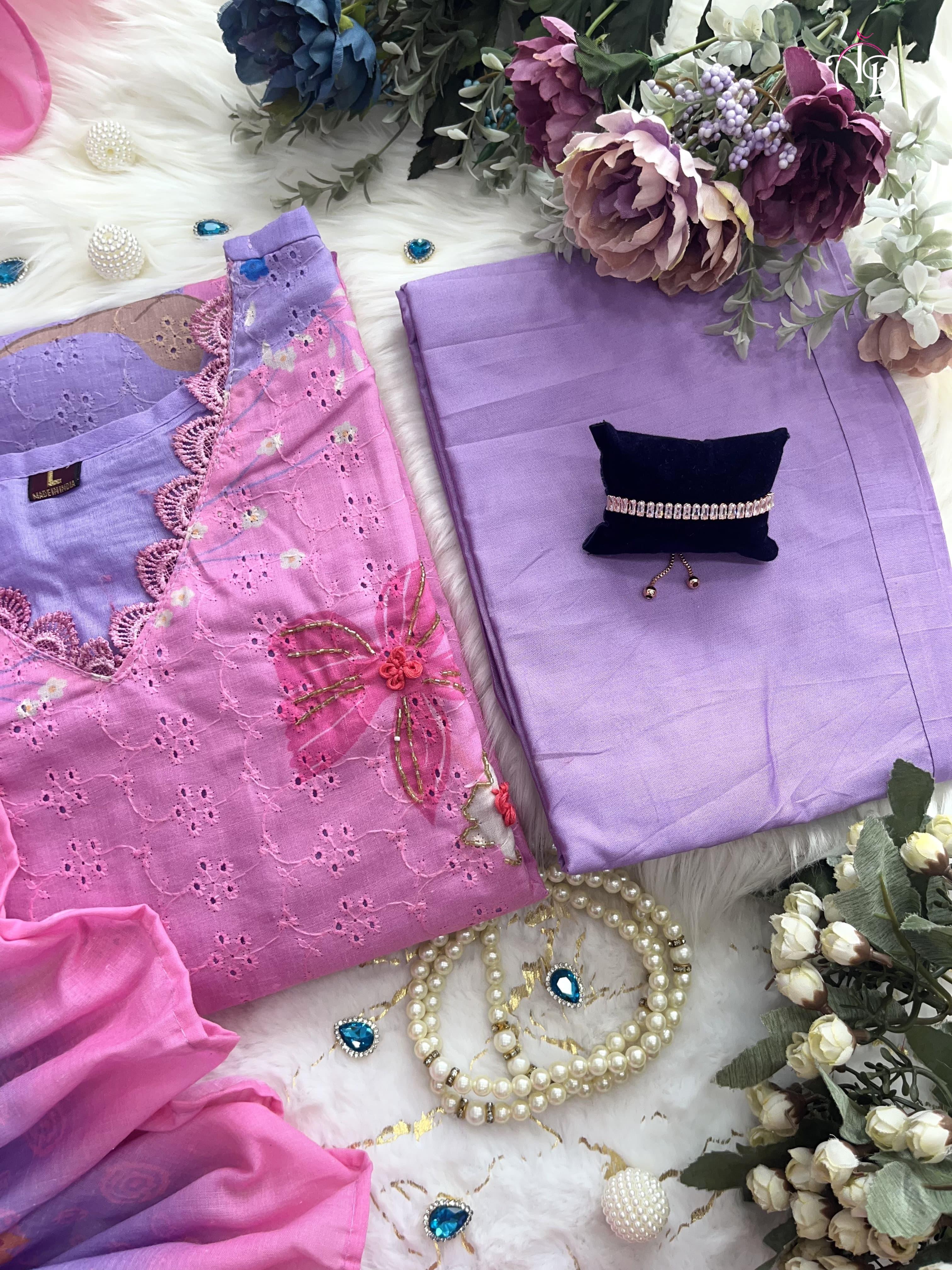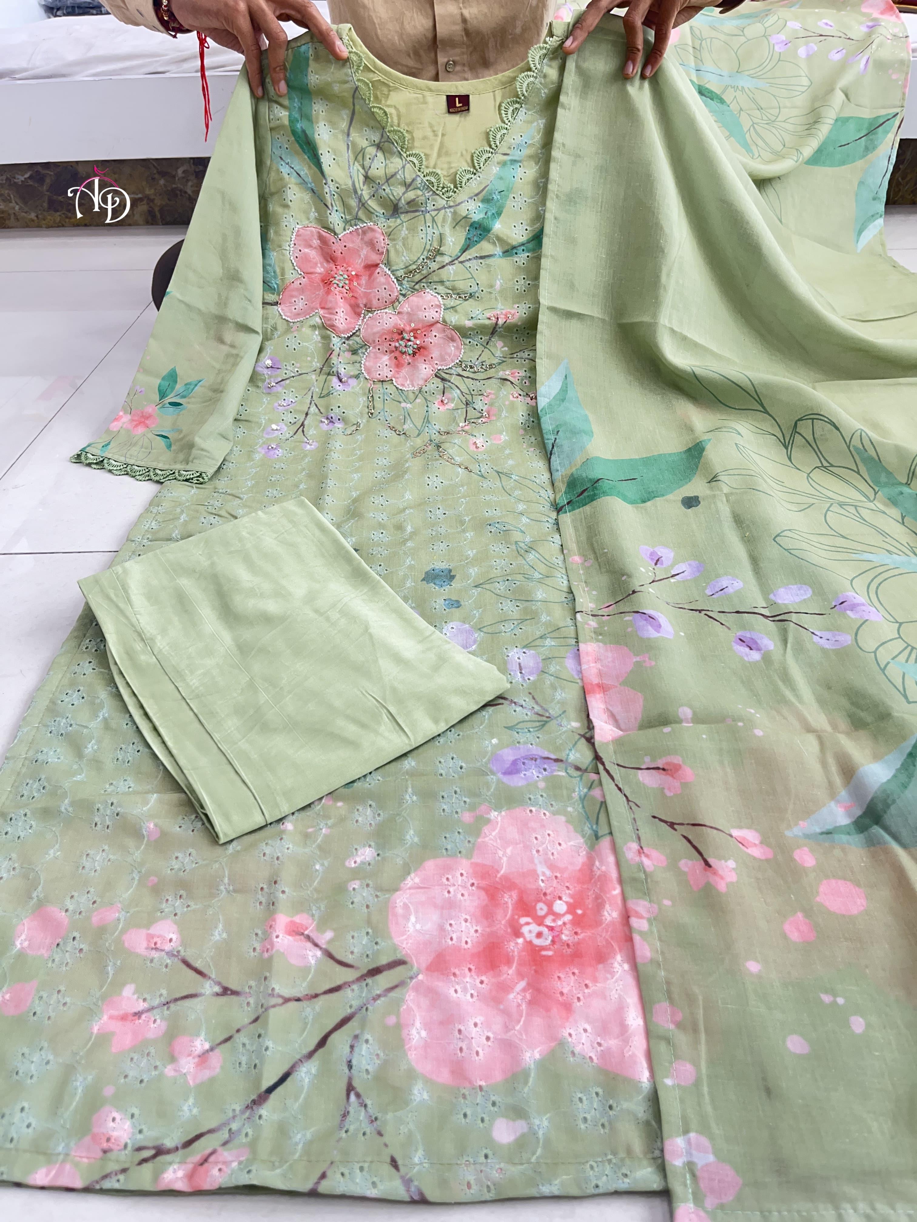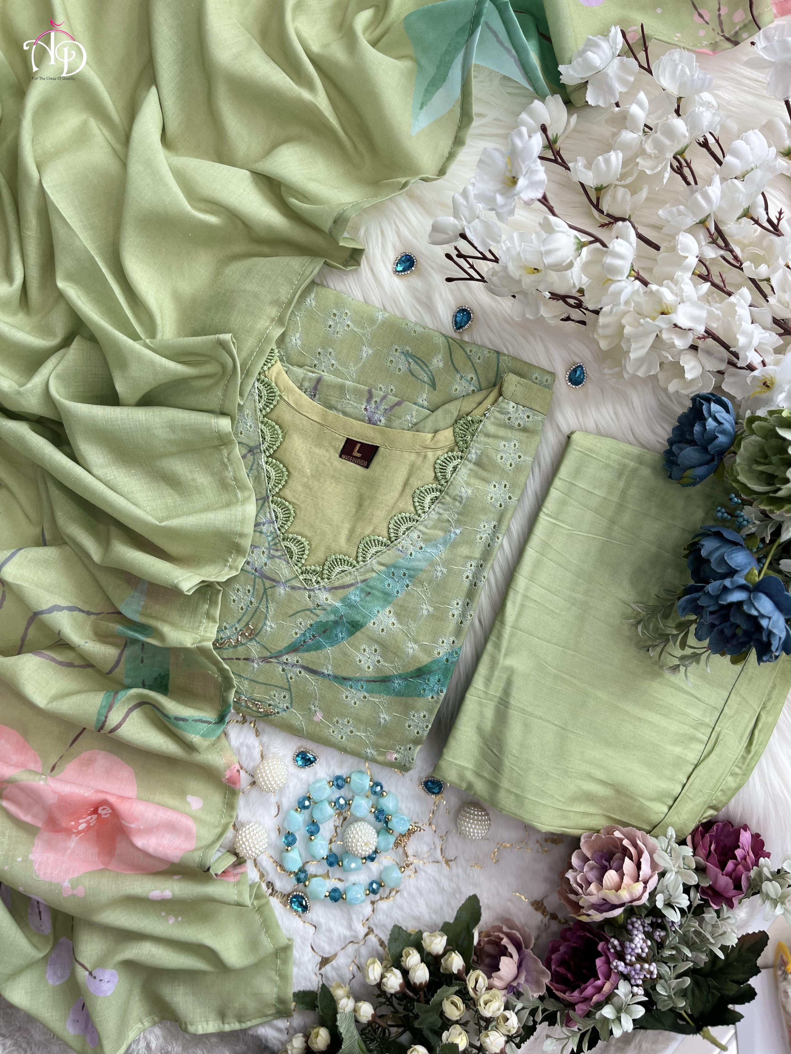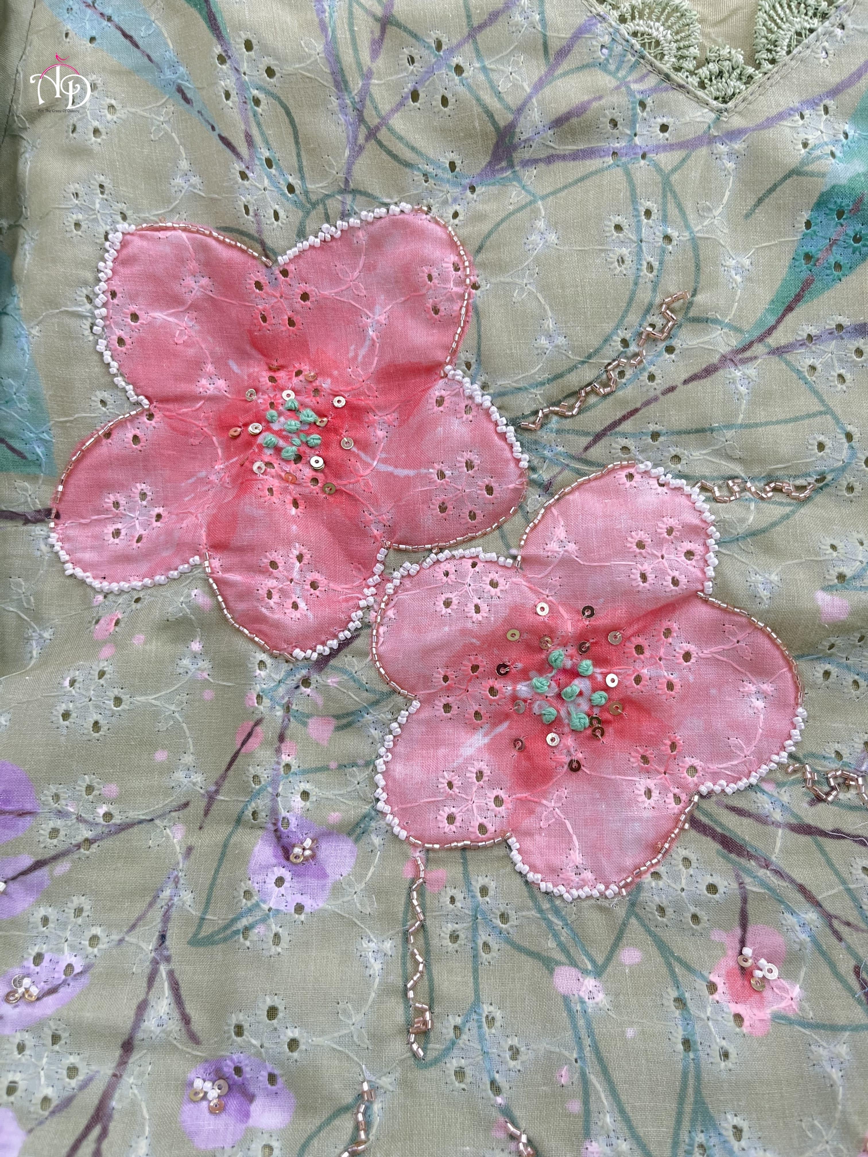Discover sophistication with our Heavy Shifli Linen Suit Set, showcasing exquisite digital printing and intricate handwork. This set features elegant hand embroidery, Zari weaving, and a stunning lace neckline, perfect for those special occasions.