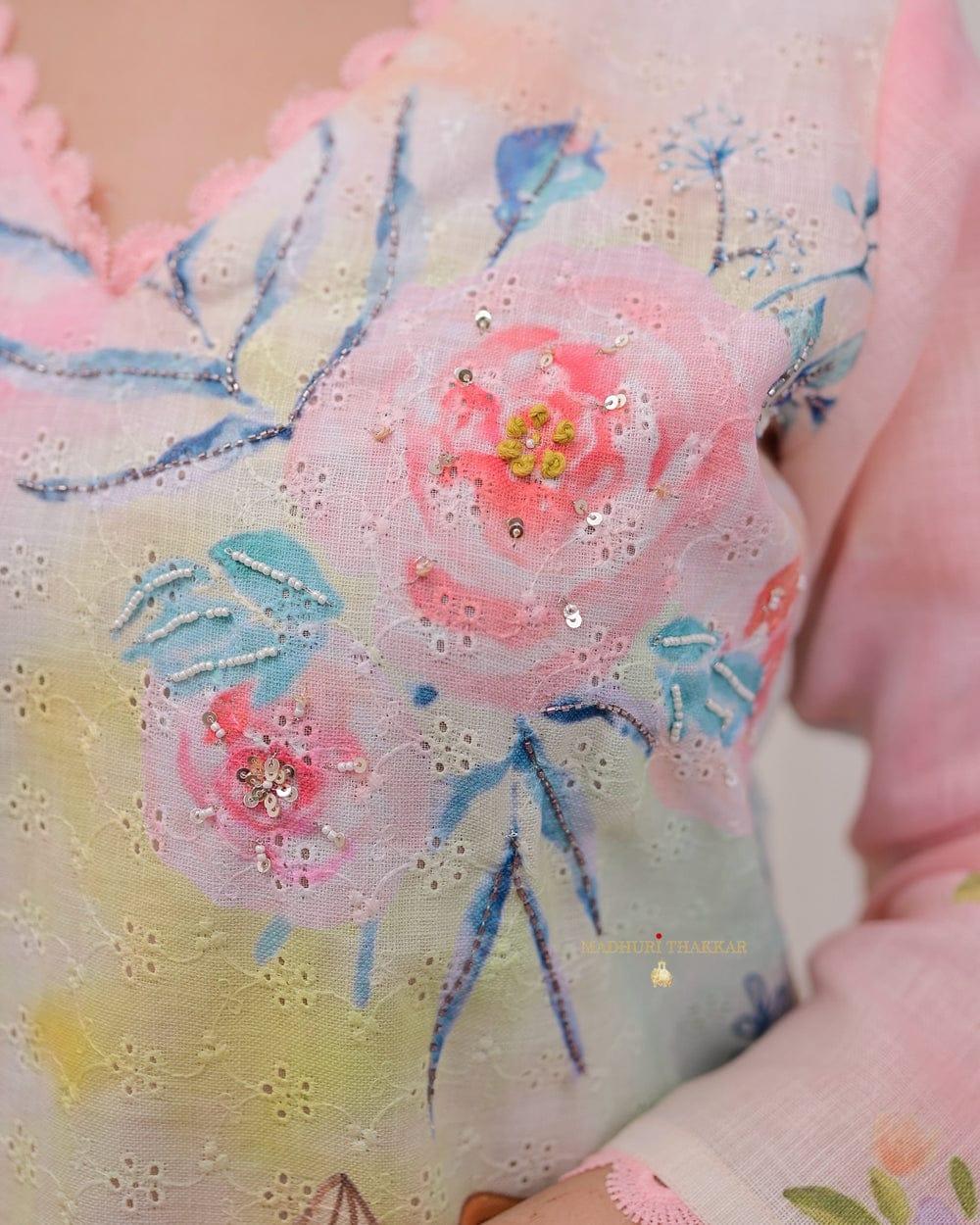 Experience unparalleled comfort and style with our newly launched linen suit set. The set features a comfortable silhouette with intricate hand embroidery and Shifli cutwork, adding an elegant touch. Beautiful floral summer prints enhance the sophistication of the ensemble.