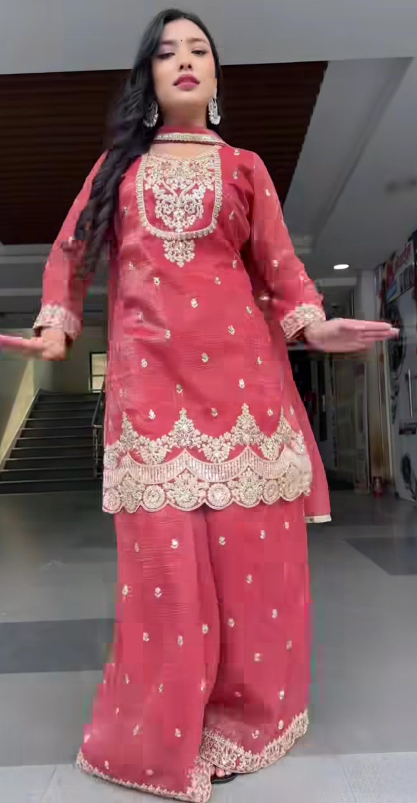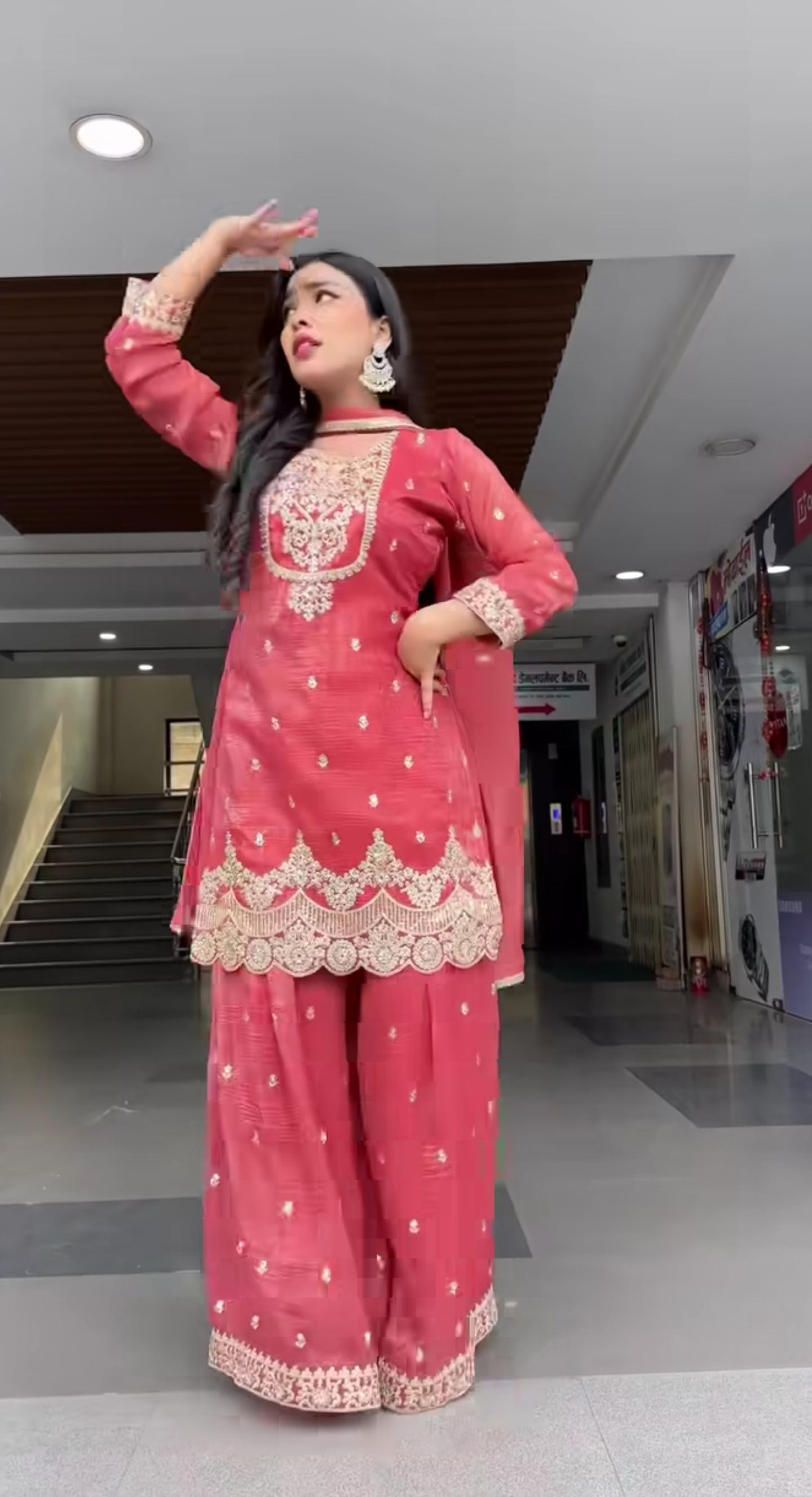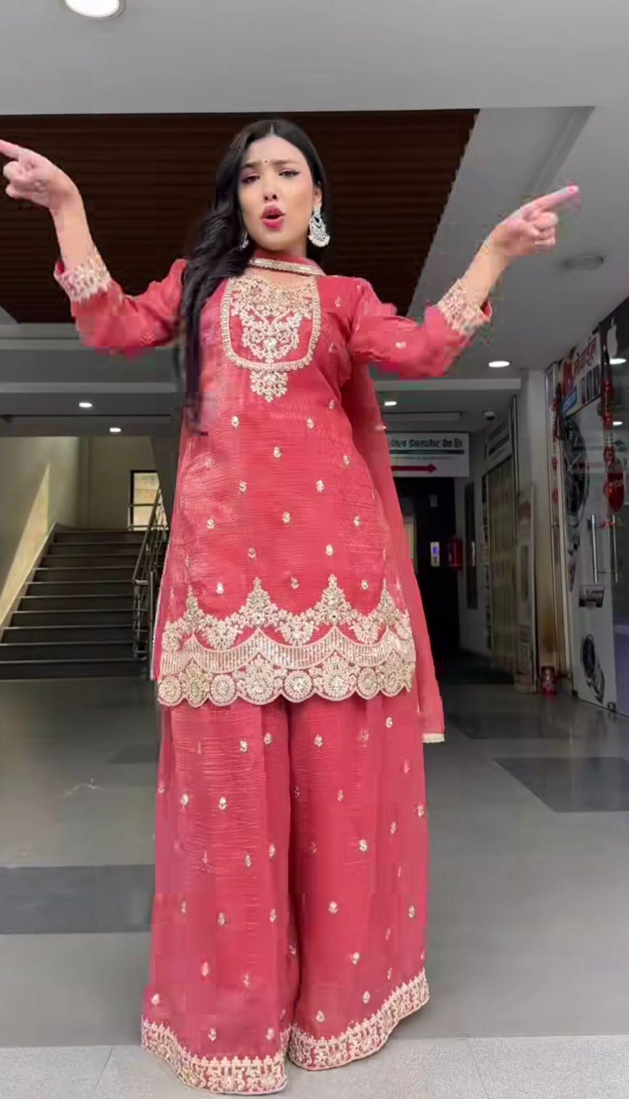 Step into festive elegance with the Noor Crunchy Silk Sharara Set, a stylish designer outfit crafted for modern ethnic wear lovers. Made from premium heavy crunchy silk fabric, the top features beautiful 5mm sequins embroidery work, giving it a rich and eye-catching look.