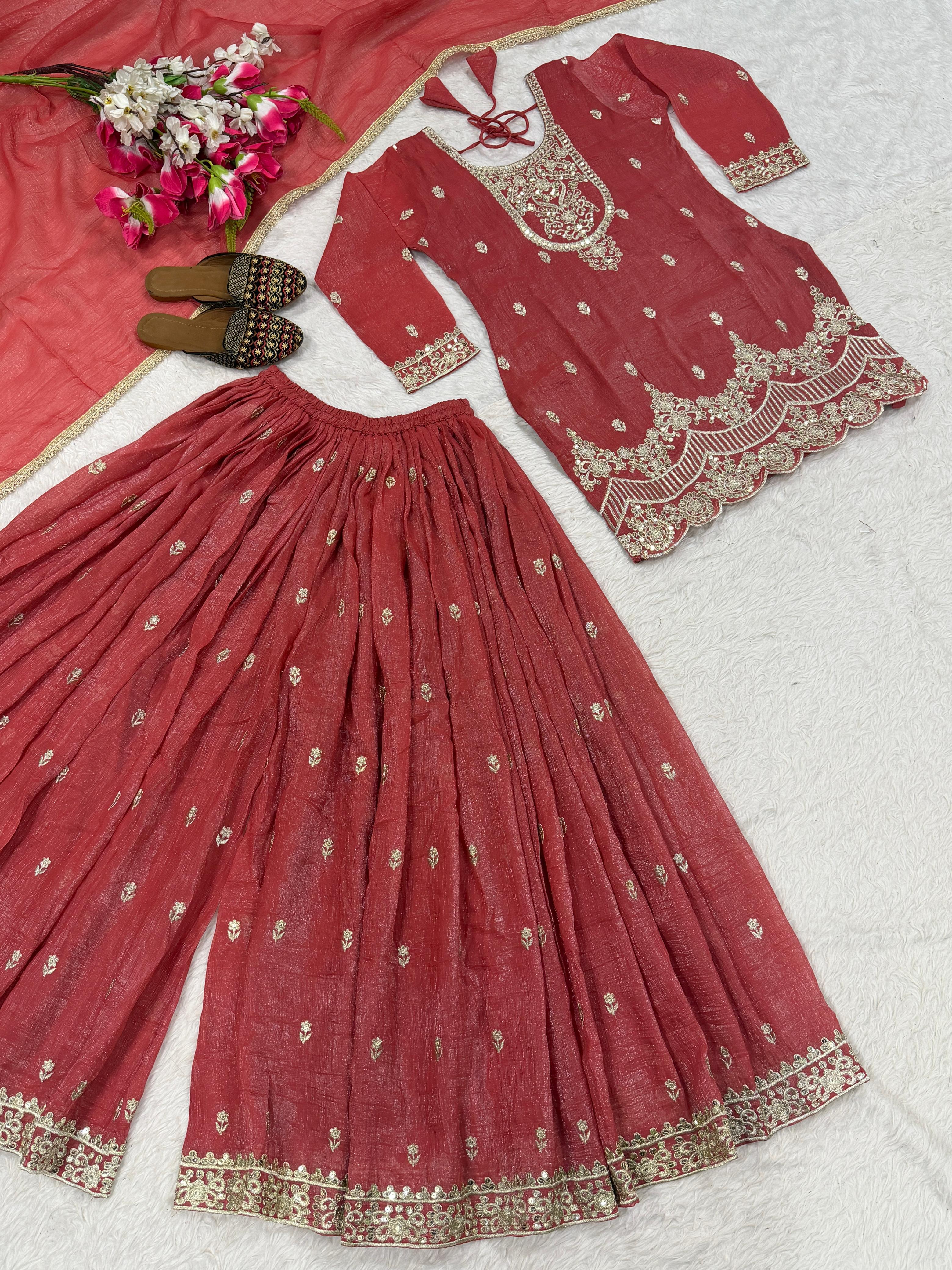 The outfit is paired with a fully stitched flared sharara palazzo with matching embroidery, adding volume and grace to your silhouette. Completing the look is a crunchy silk dupatta with elegant four-side lace border, enhancing the overall festive appeal.