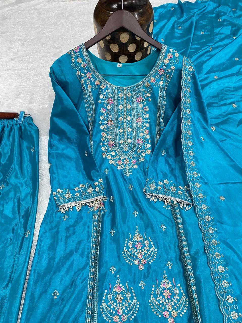 The stylish embroidered kurti paired with a comfortable Chinon palazzo and matching embroidered dupatta creates a flattering and sophisticated silhouette. With soft butter crepe inner lining for extra comfort, this fully stitched outfit ensures both style and ease of wear.
