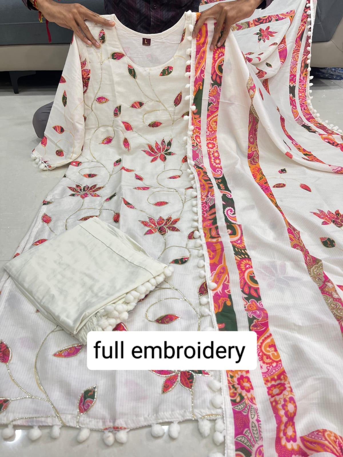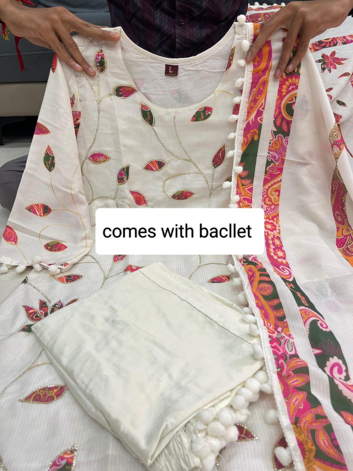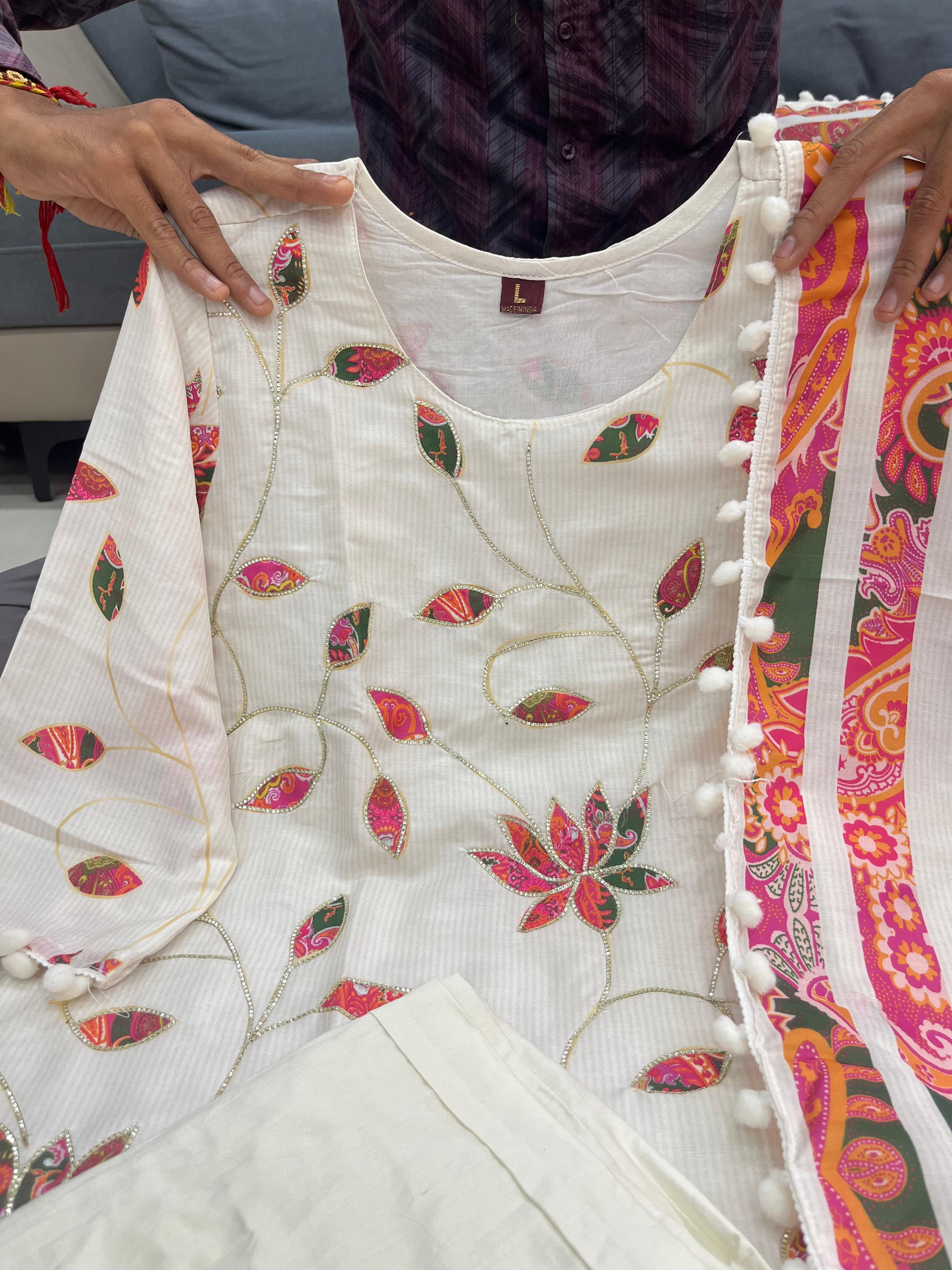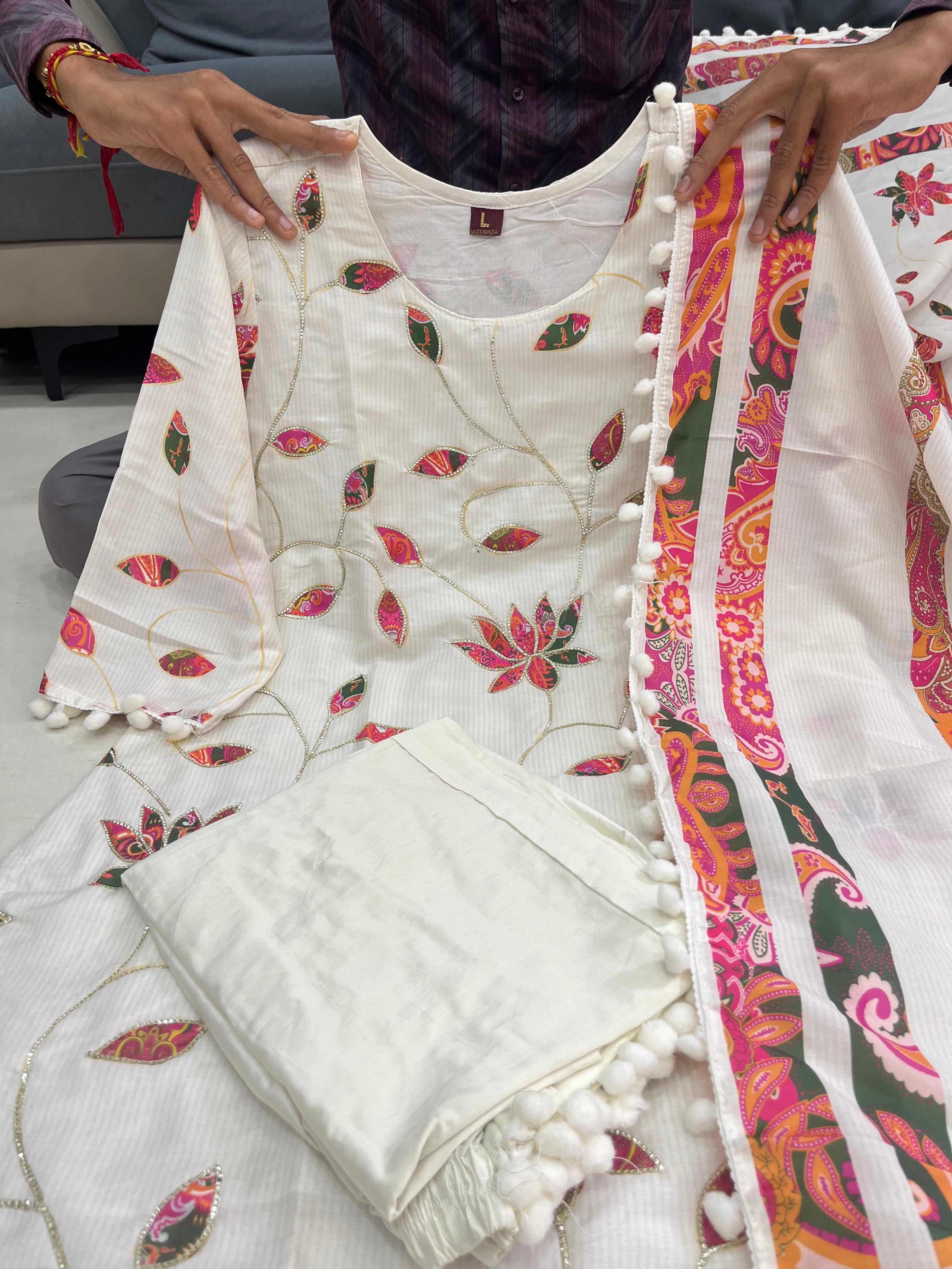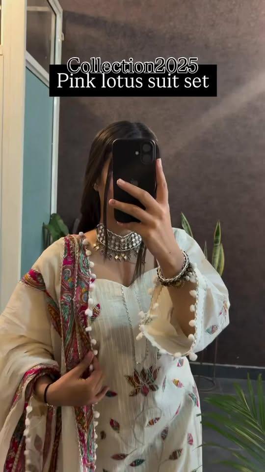 Introducing the Pink Lotus Suit Set, a beautifully crafted Mul Chanderi ensemble designed to bring out your graceful charm. This four-piece set includes a printed Kurti, matching pant, a delicate Mul Chanderi dupatta with pum-pum lace, and a Creamy Pearl Moti Mala to complete the festive look.