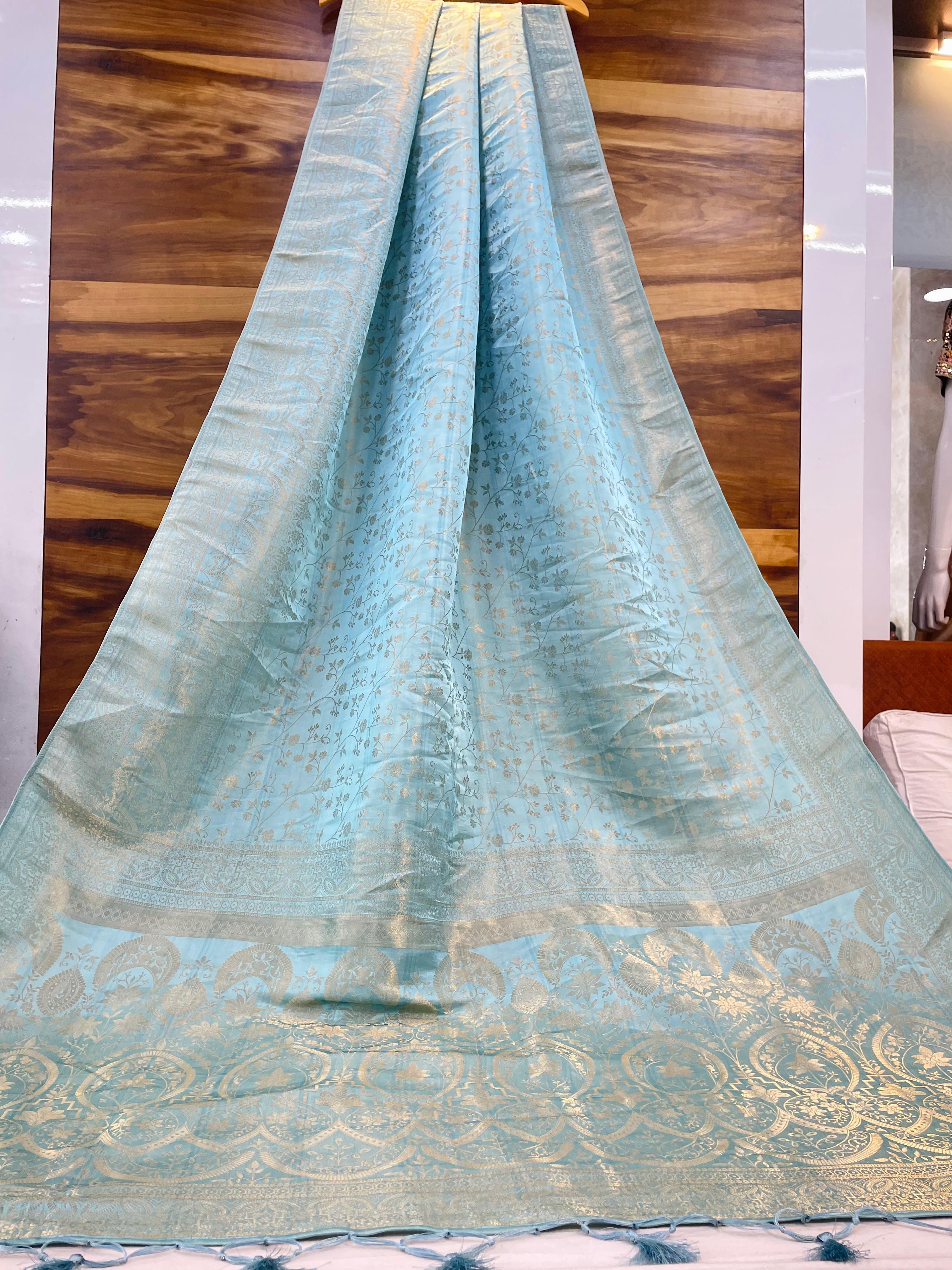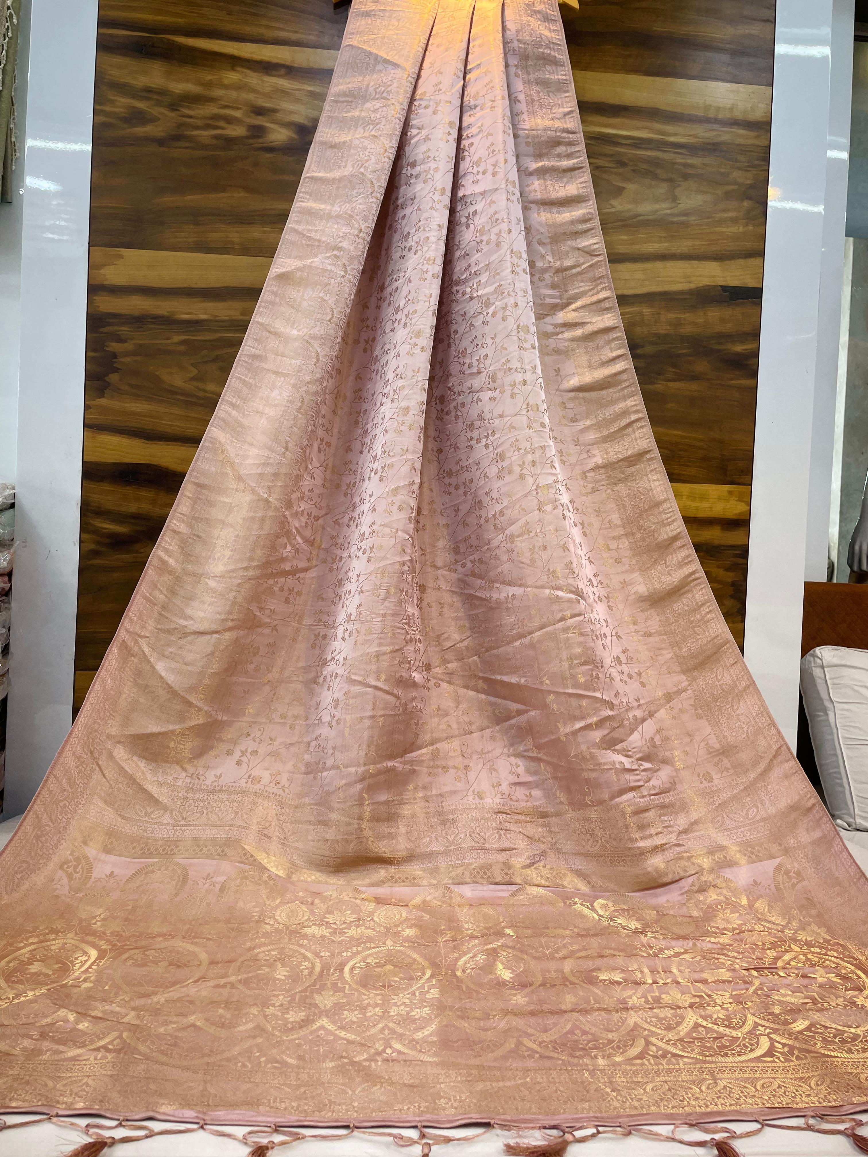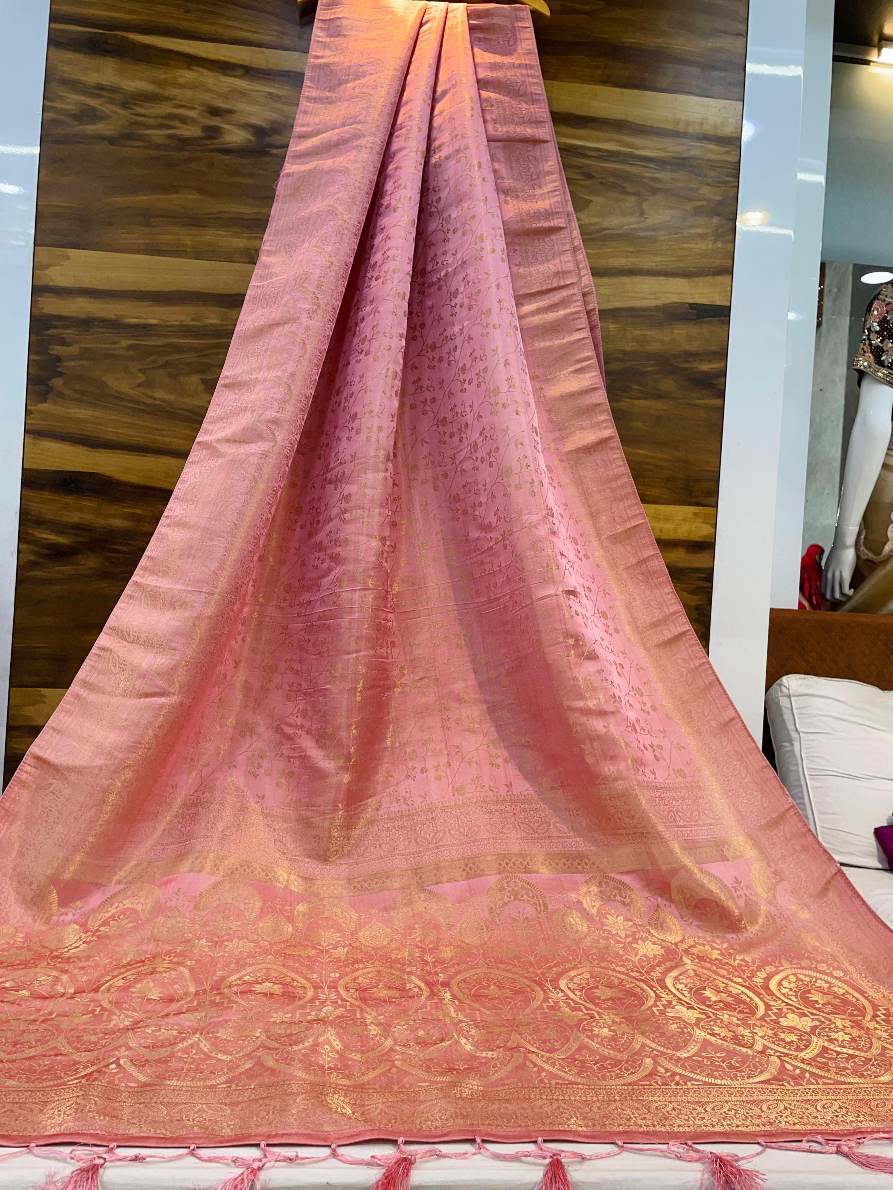 This stunning saree features pure tissue Banarasi jari weaving work on a soft Dola silk base, offering a perfect blend of sheen, drape, and comfort.
