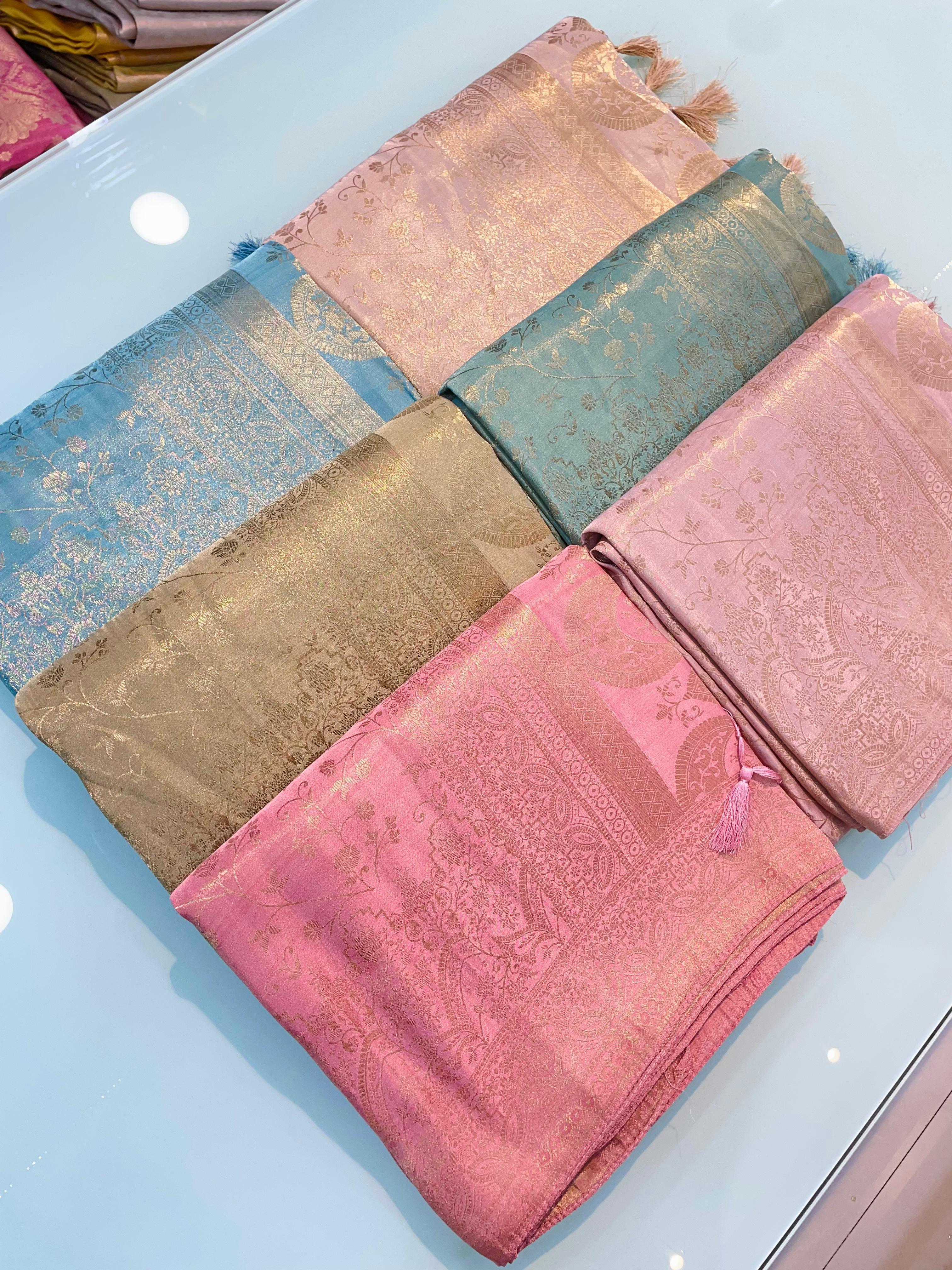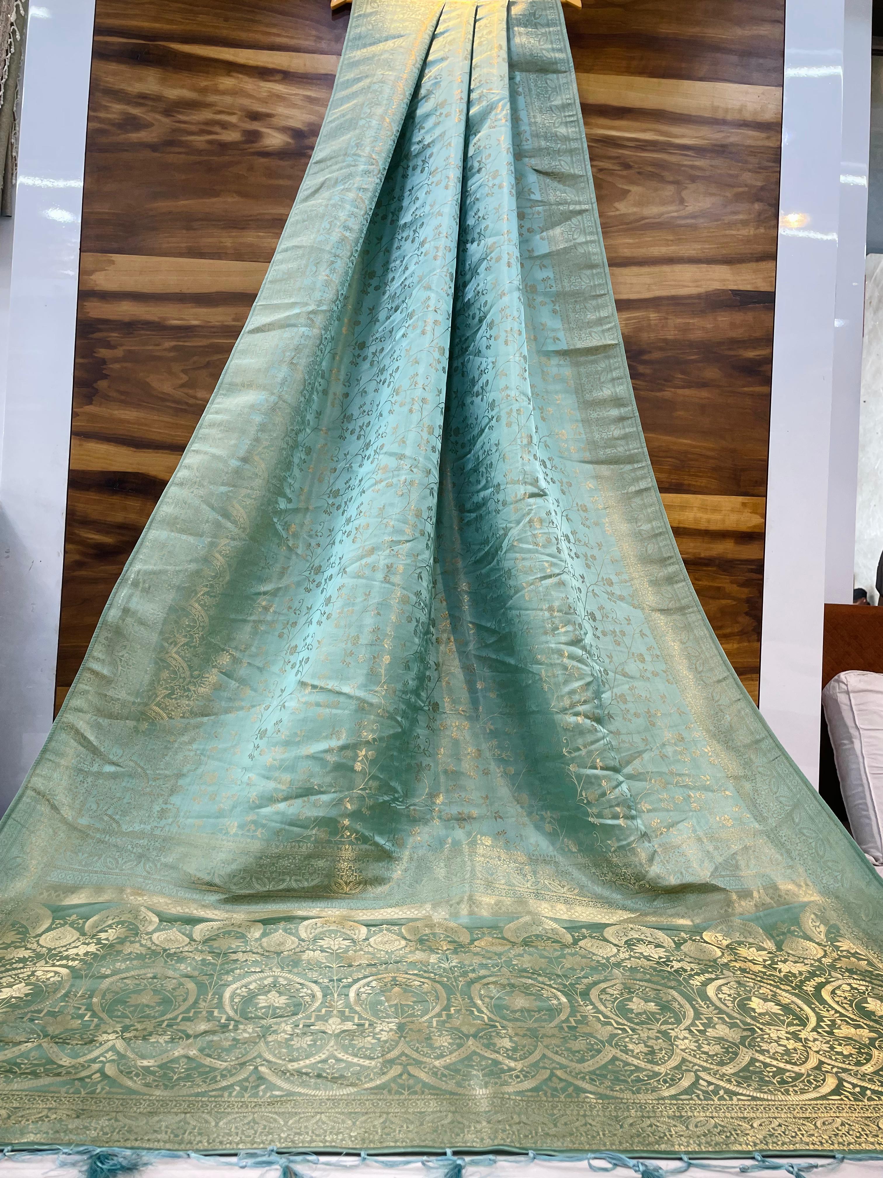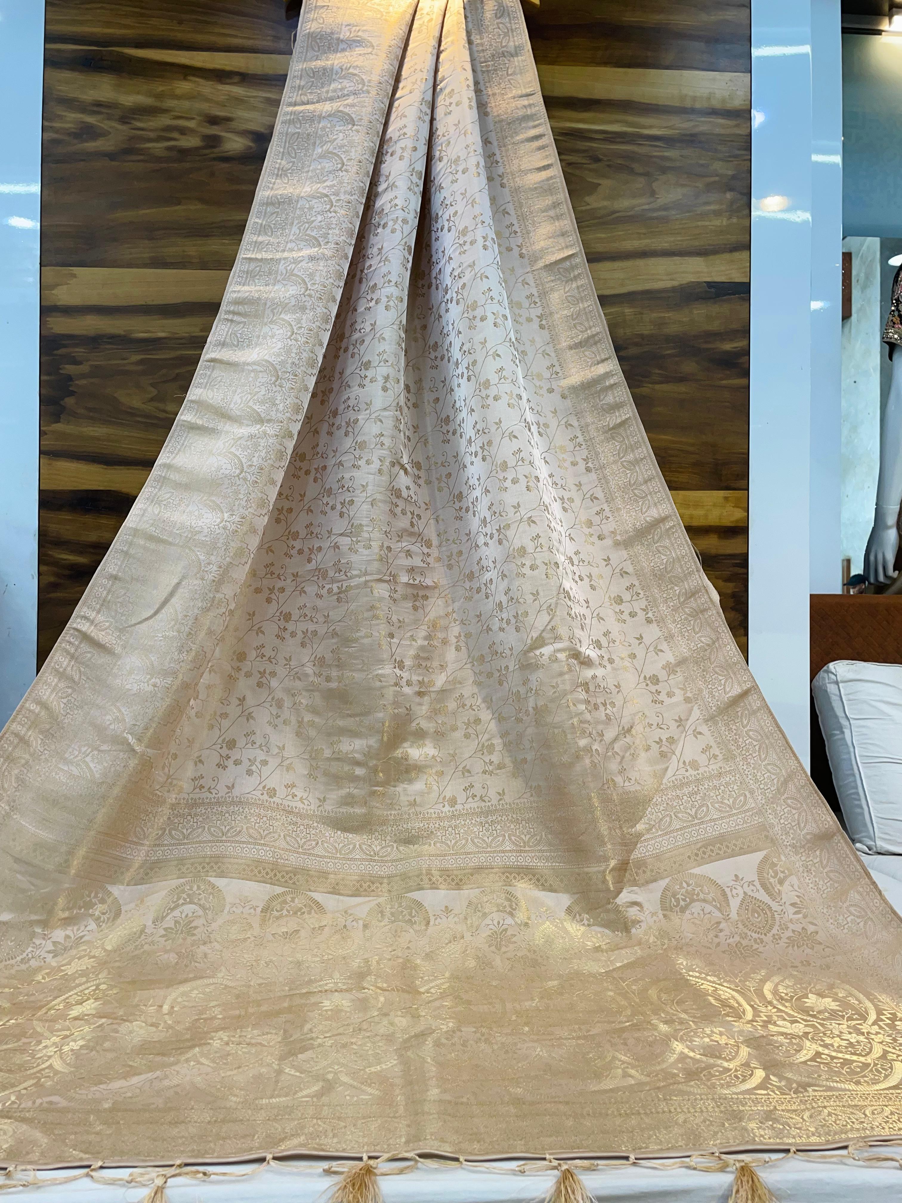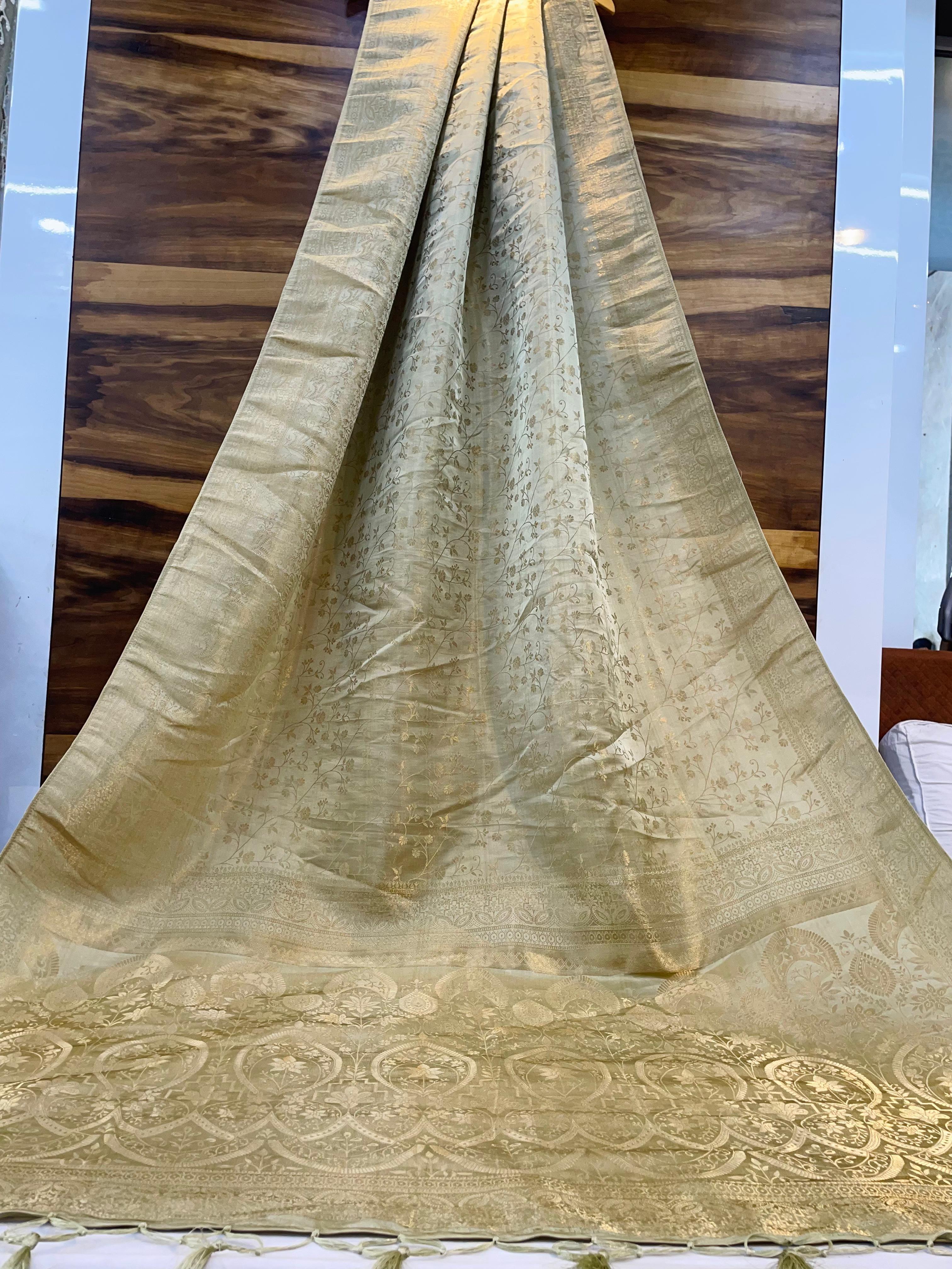 This stunning saree features pure tissue Banarasi jari weaving work on a soft Dola silk base, offering a perfect blend of sheen, drape, and comfort.