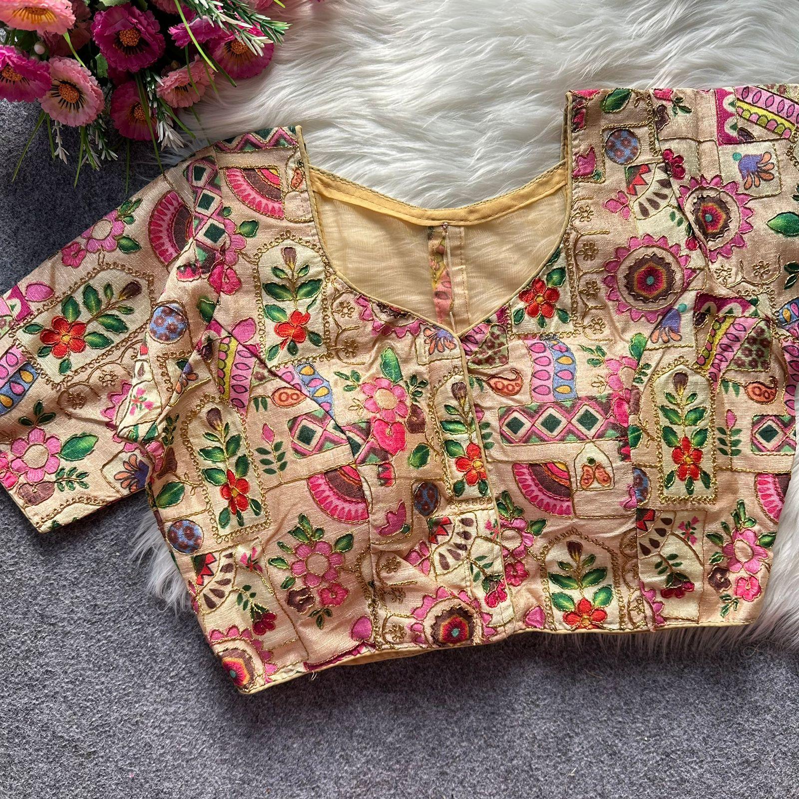 Elevate your ethnic style with this luxurious Malai Silk Designer Blouse, featuring intricate multi coding work that pairs beautifully with any designer saree. Designed with a stylish front-open pattern and an elegant netted back with fancy buttons, this blouse is a perfect blend of tradition and modern fashion.