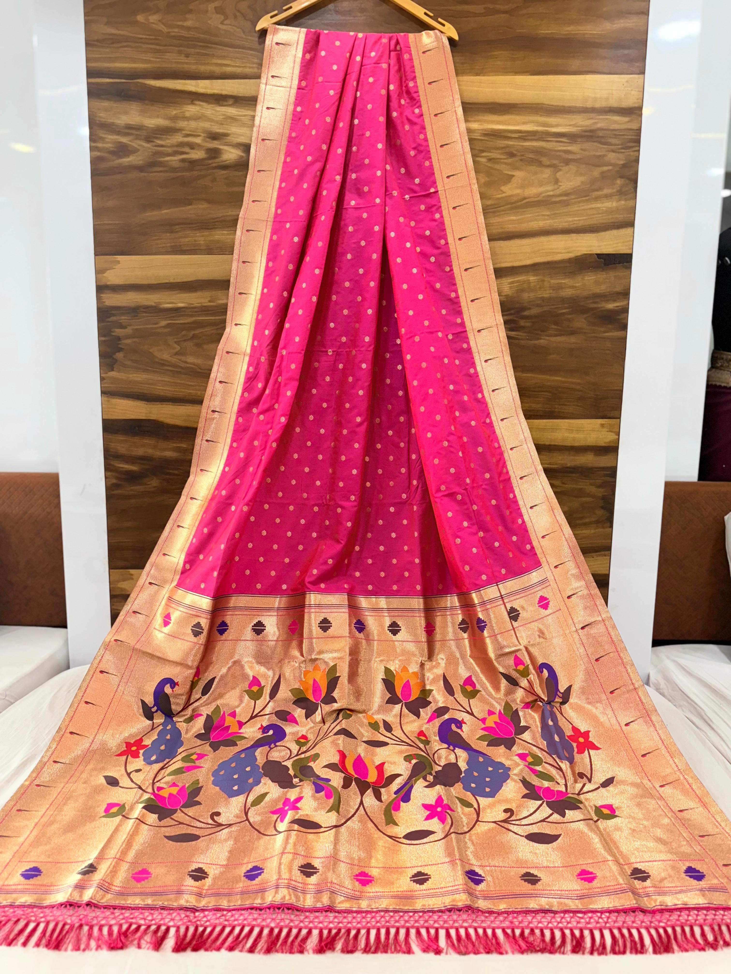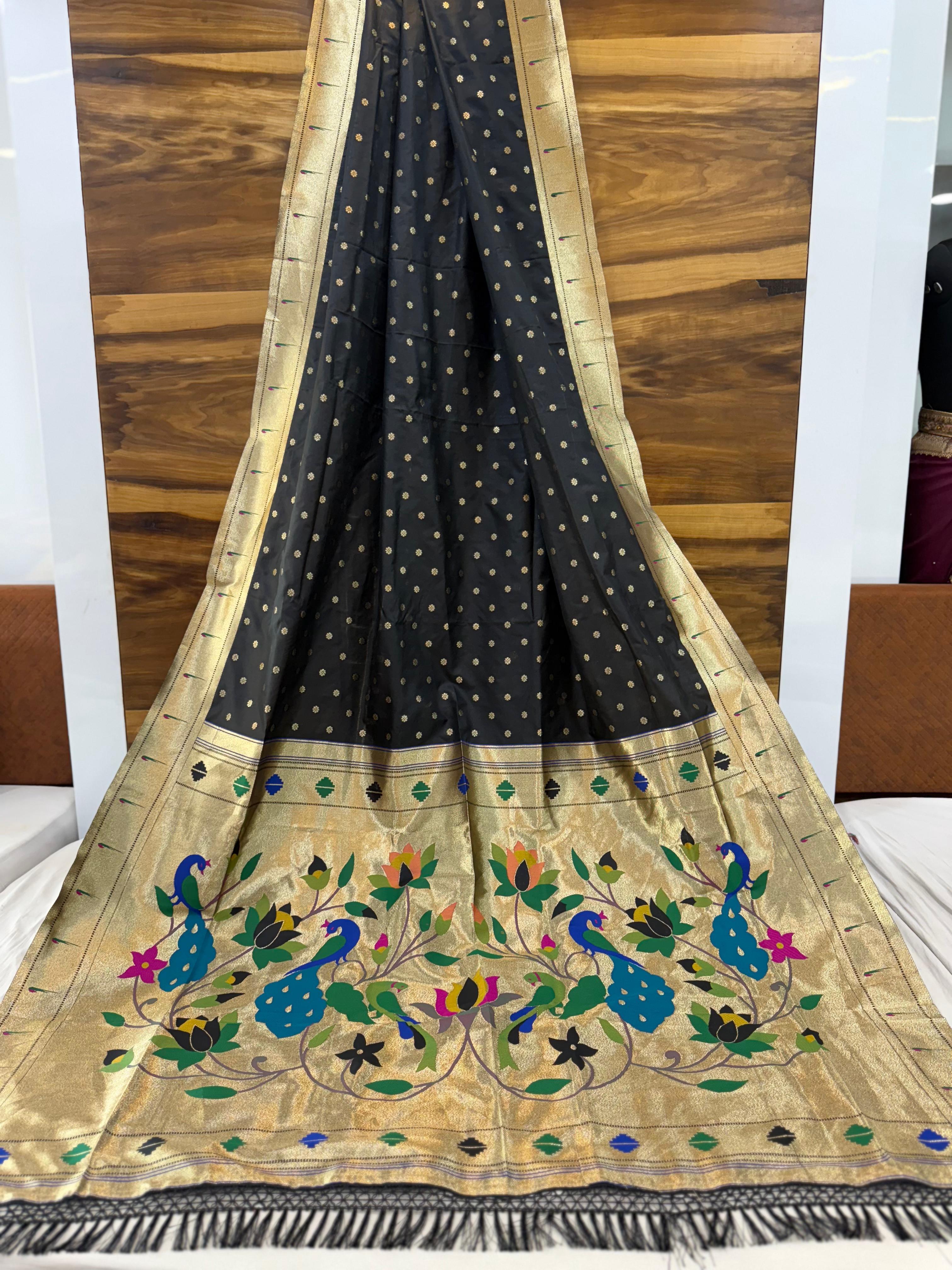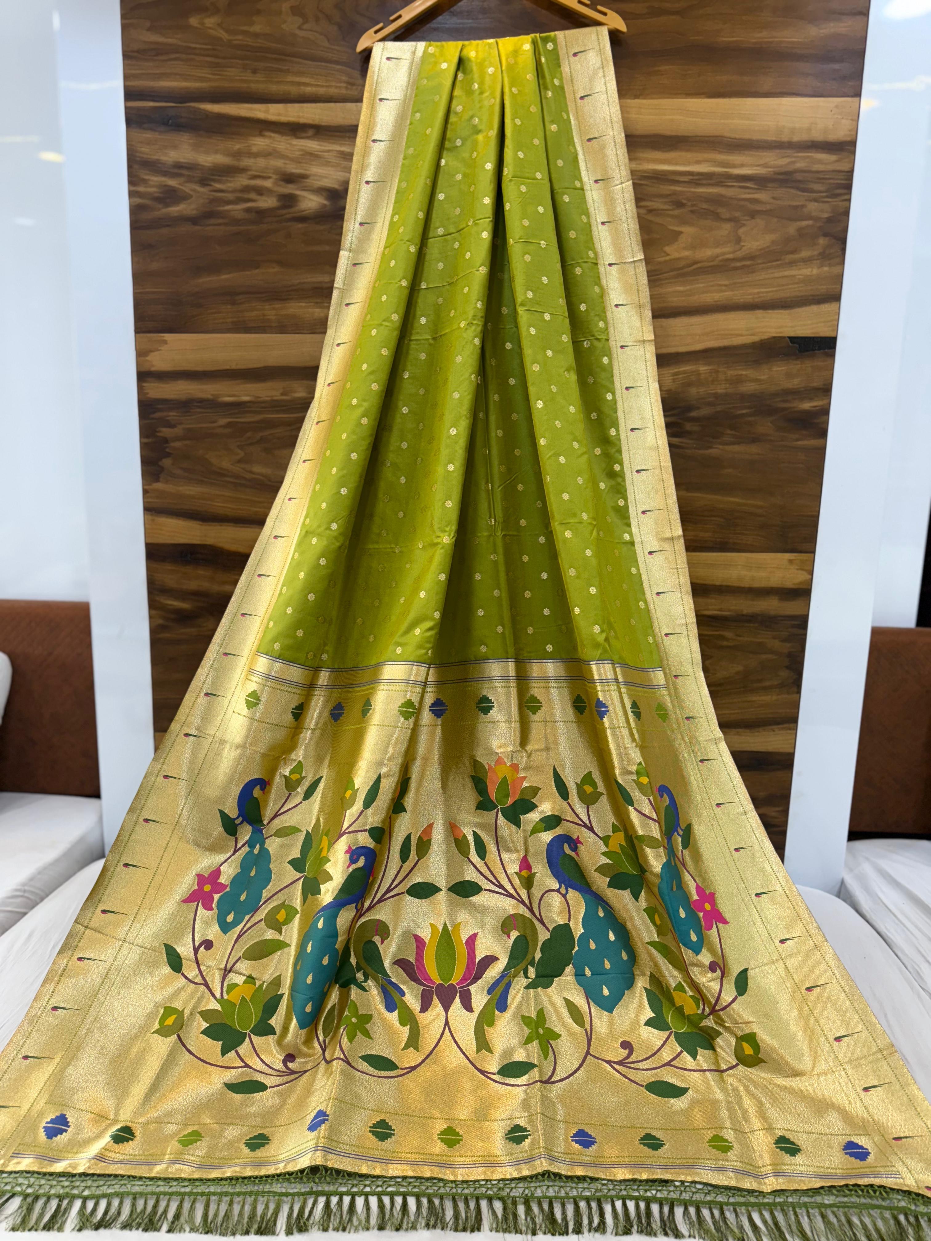 - Work: All-over Pure Zari Weaving with Heavy Paithani Meena Work