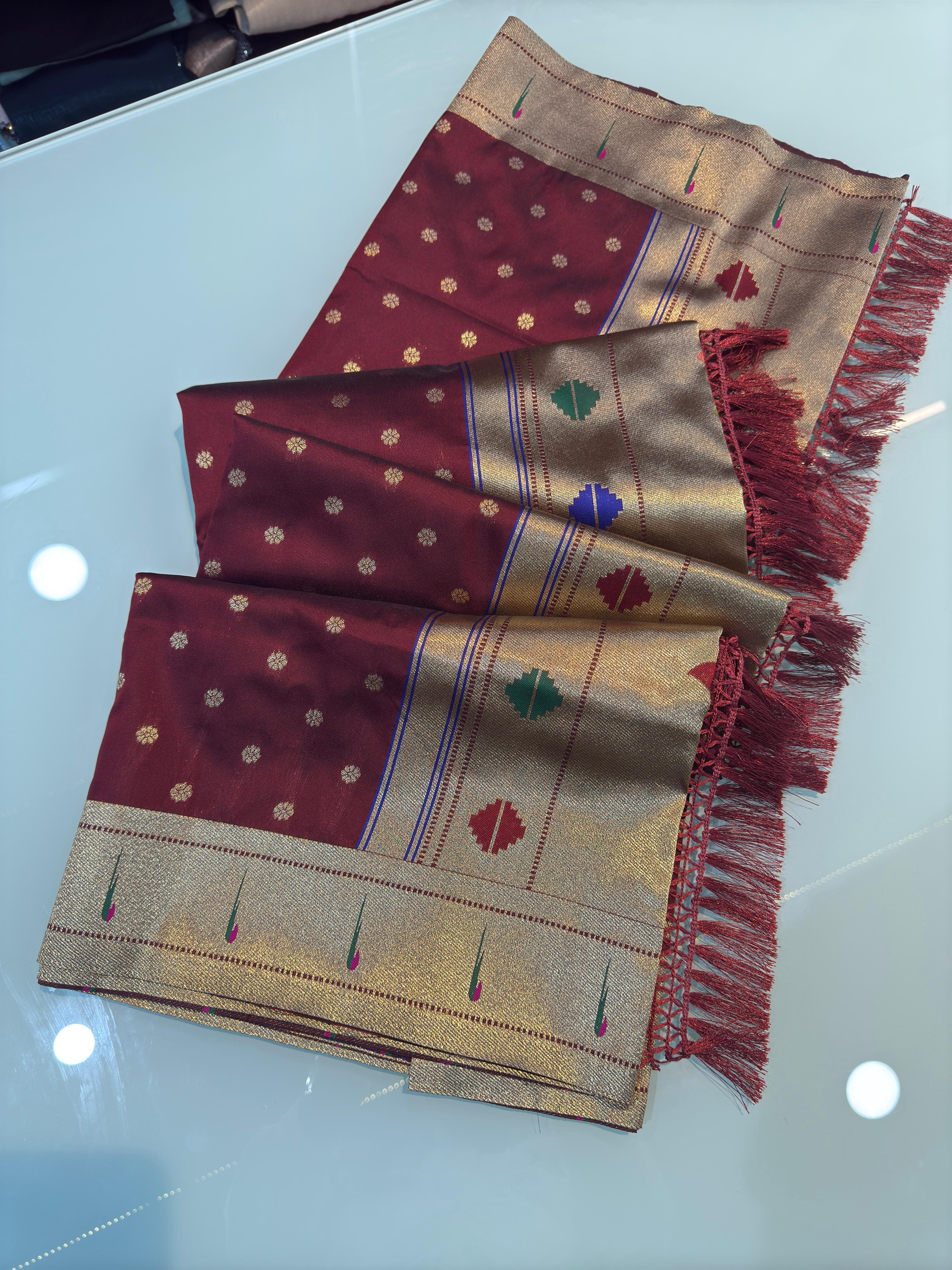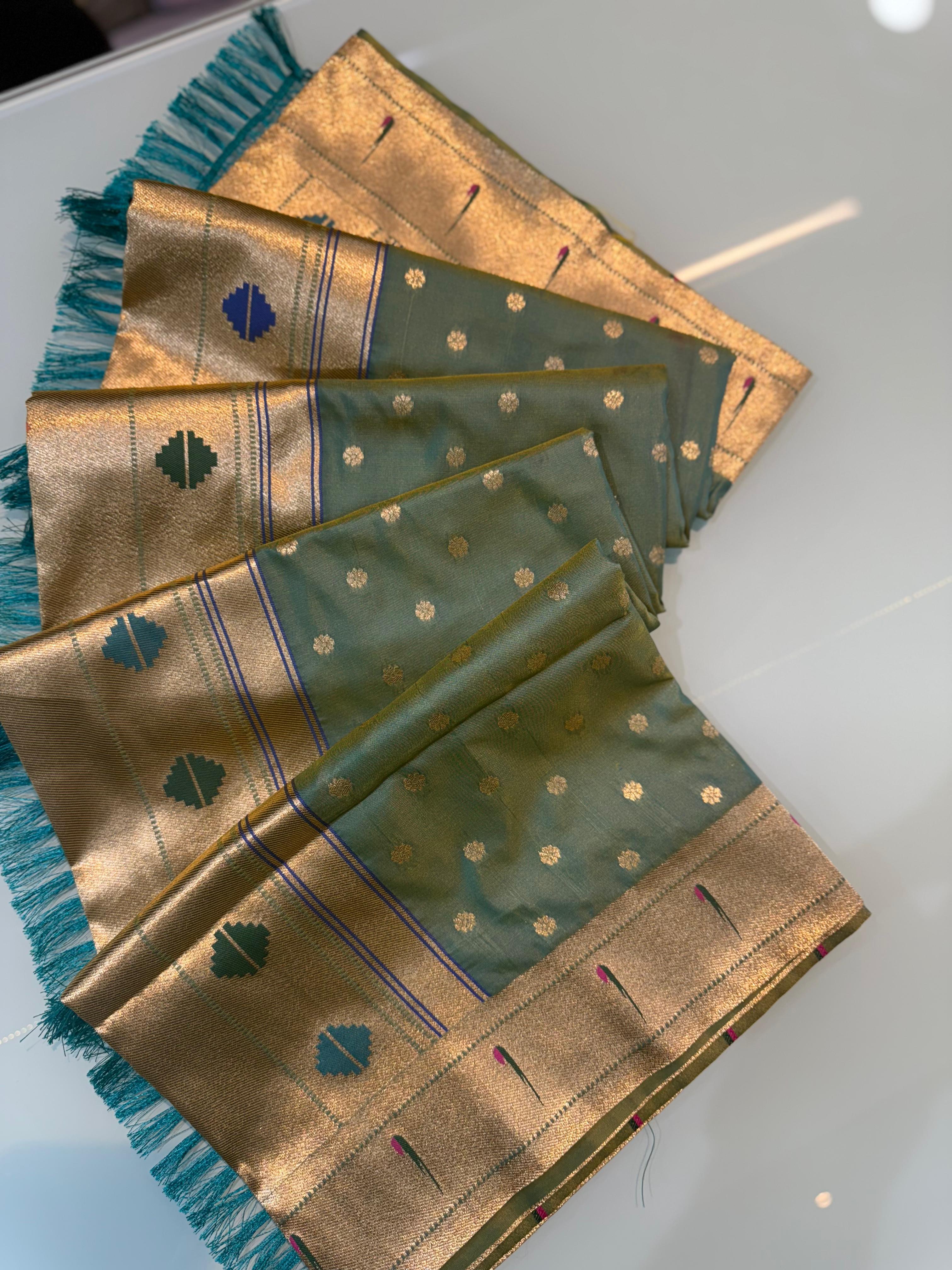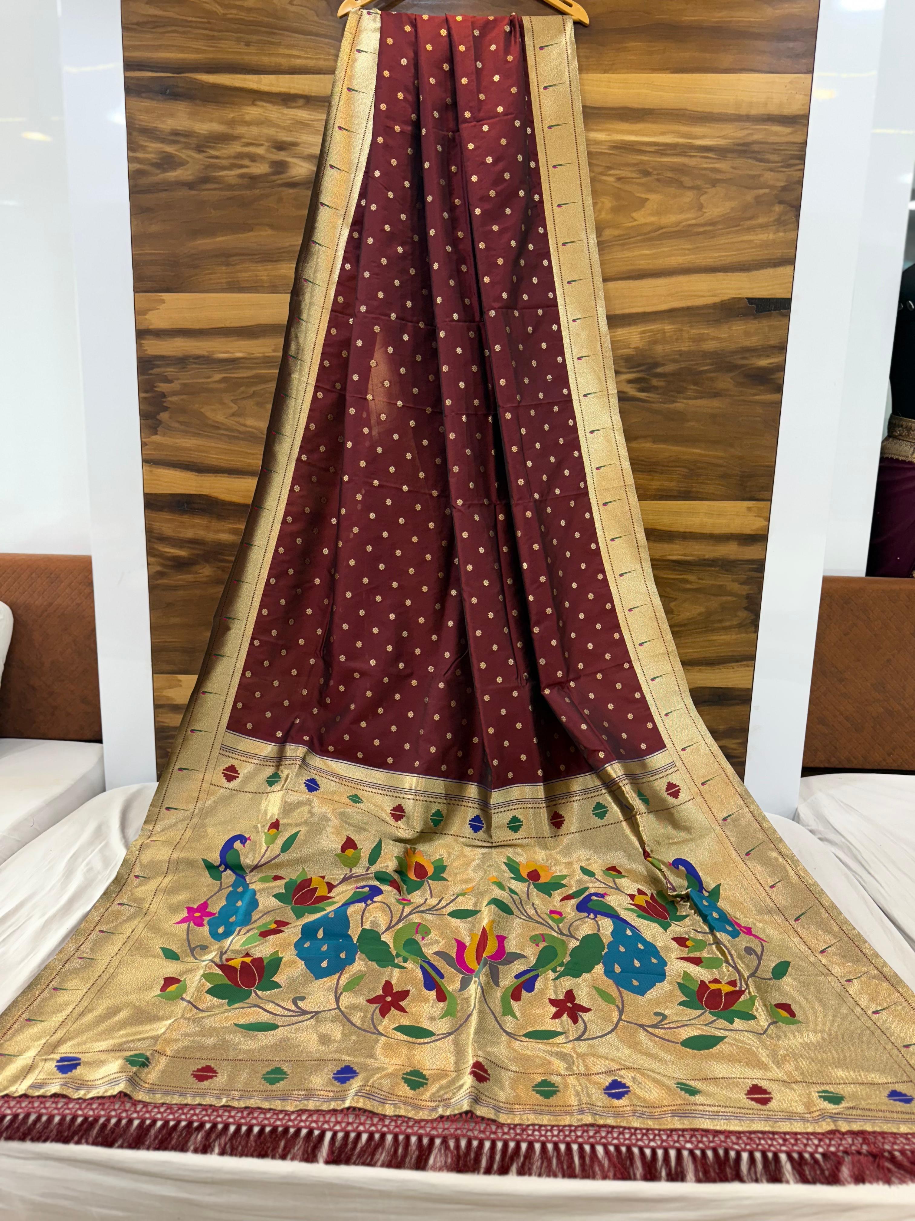 - Work: All-over Pure Zari Weaving with Heavy Paithani Meena Work