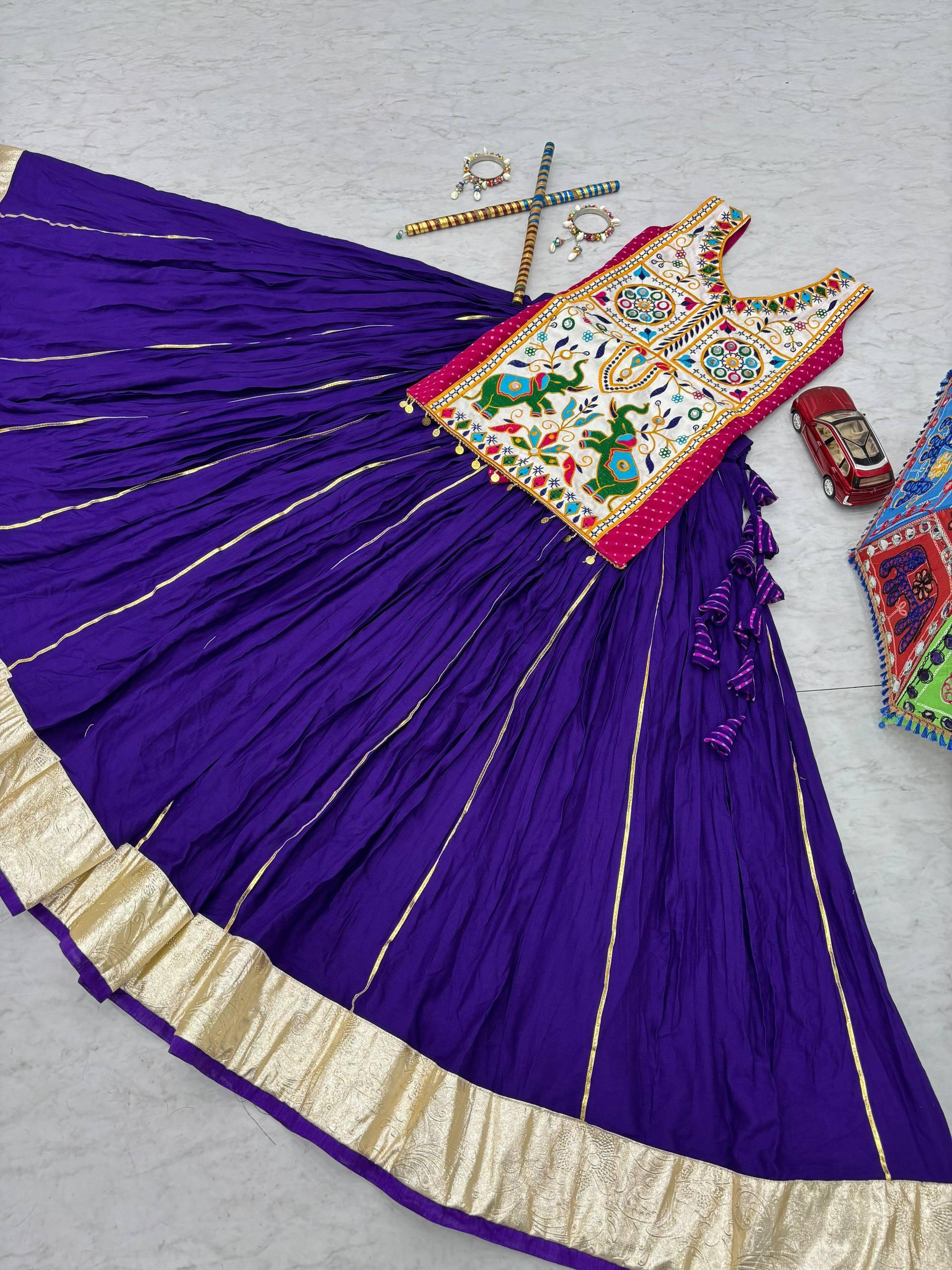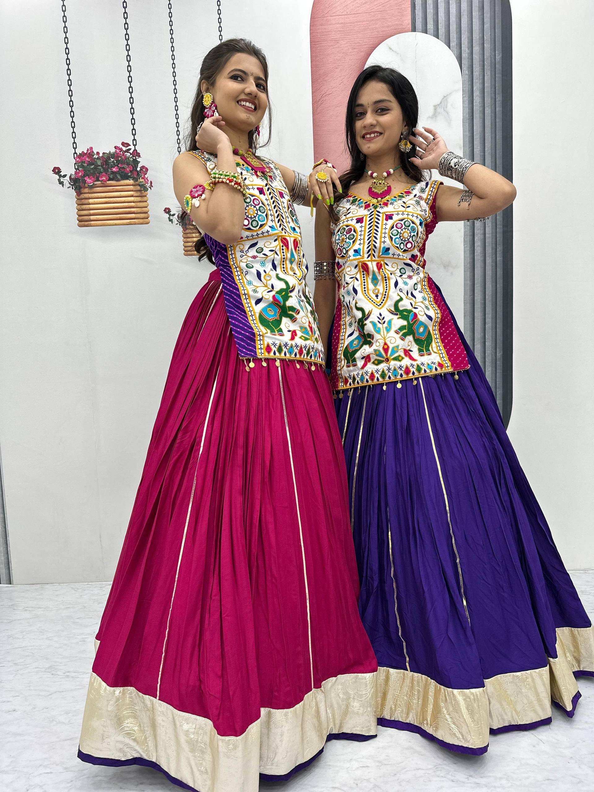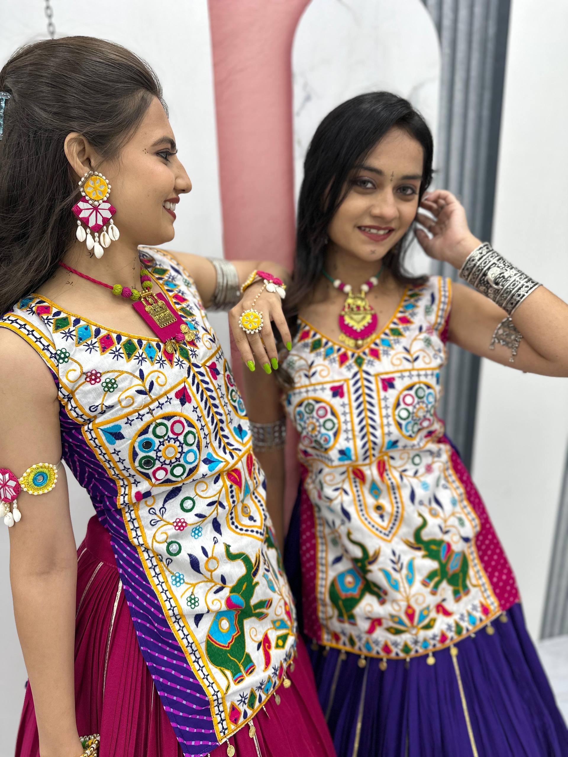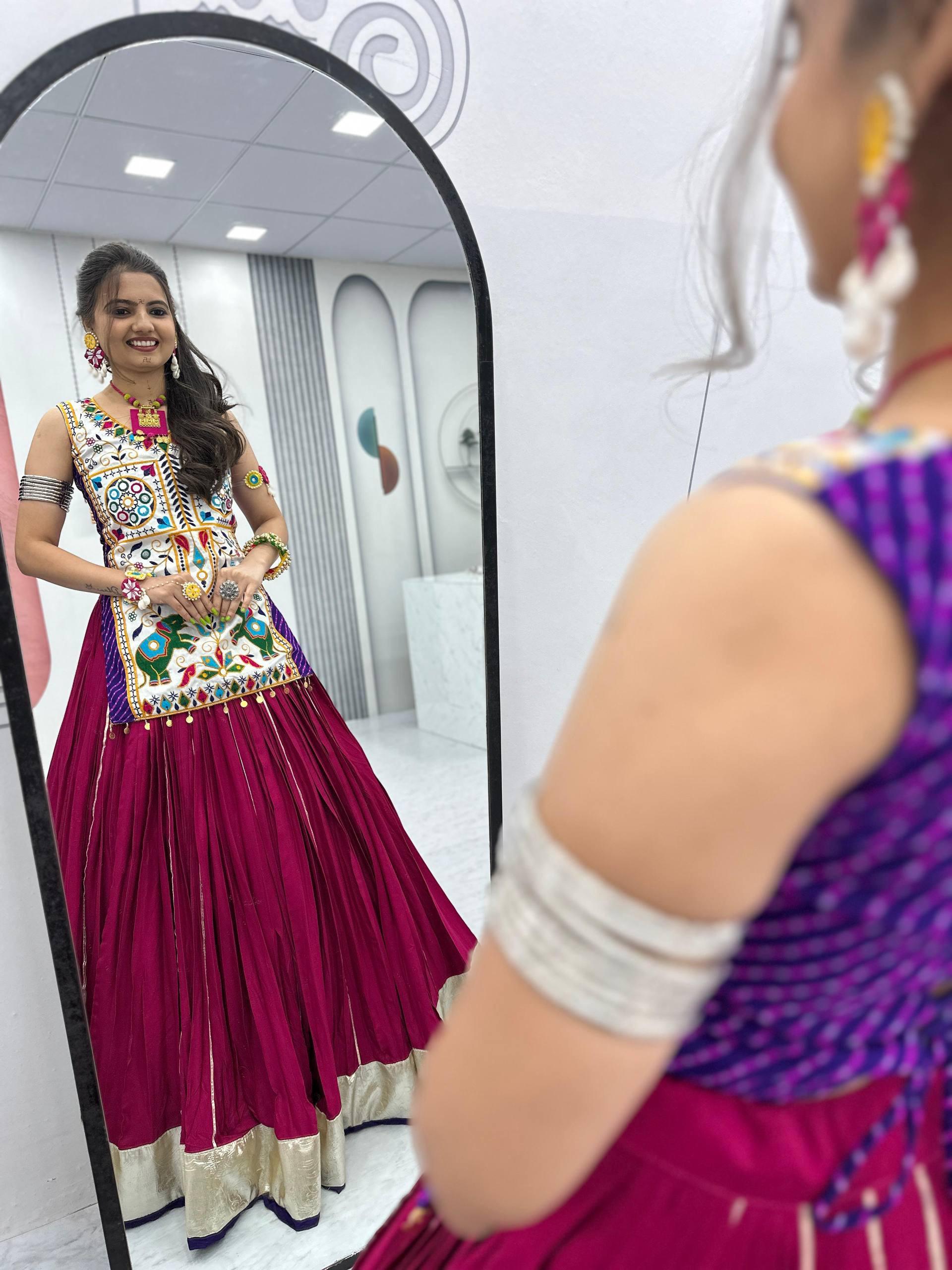 The beautiful choli with padding and intricate mirror work pairs perfectly with a pure cotton lehenga featuring a grand 6-meter flair, giving you a stunning twirl-worthy silhouette. Enhanced with lumpi lace border and ribbon work, this outfit is perfect for Navratri, Garba nights, festive celebrations, and cultural events.