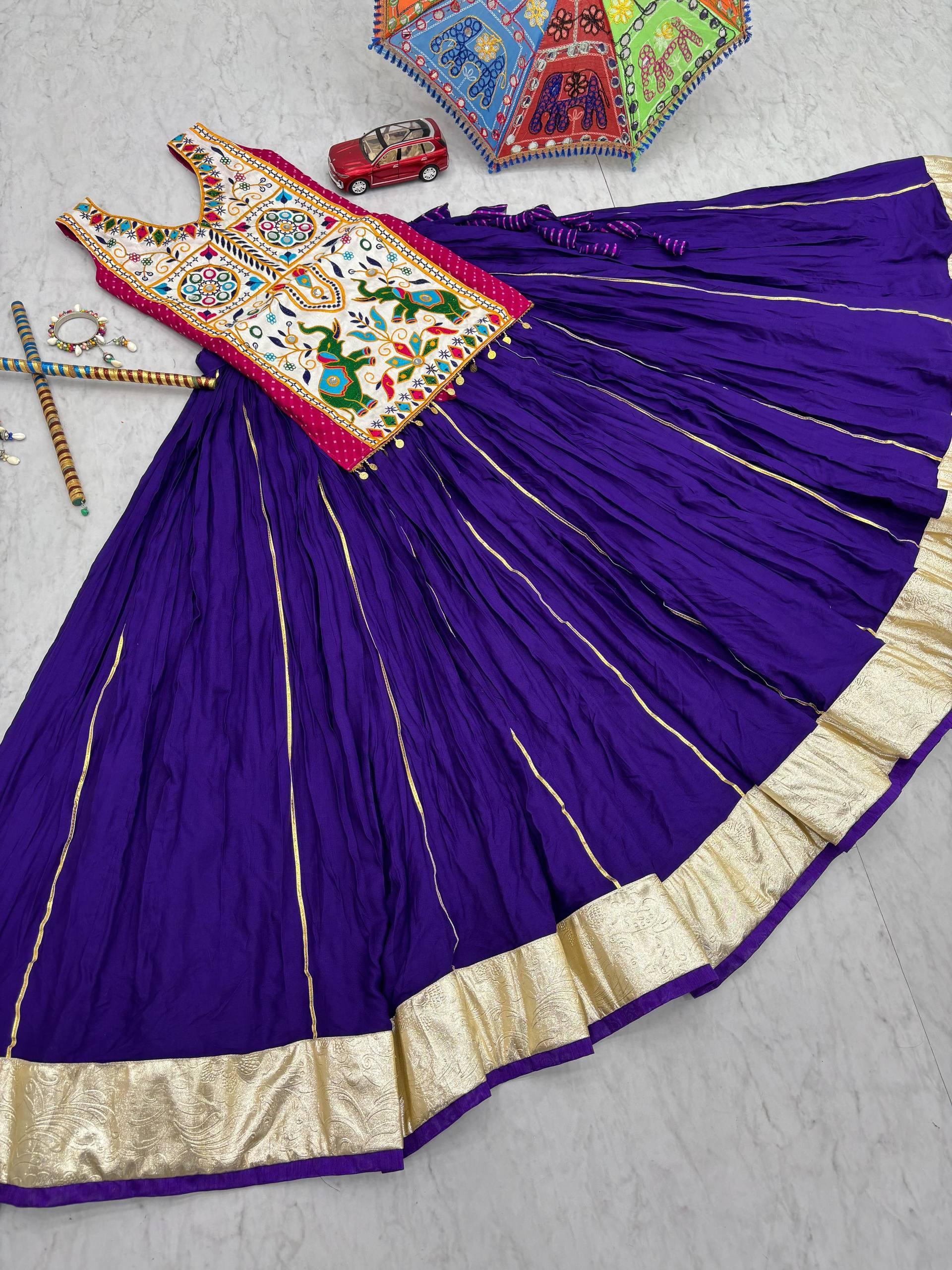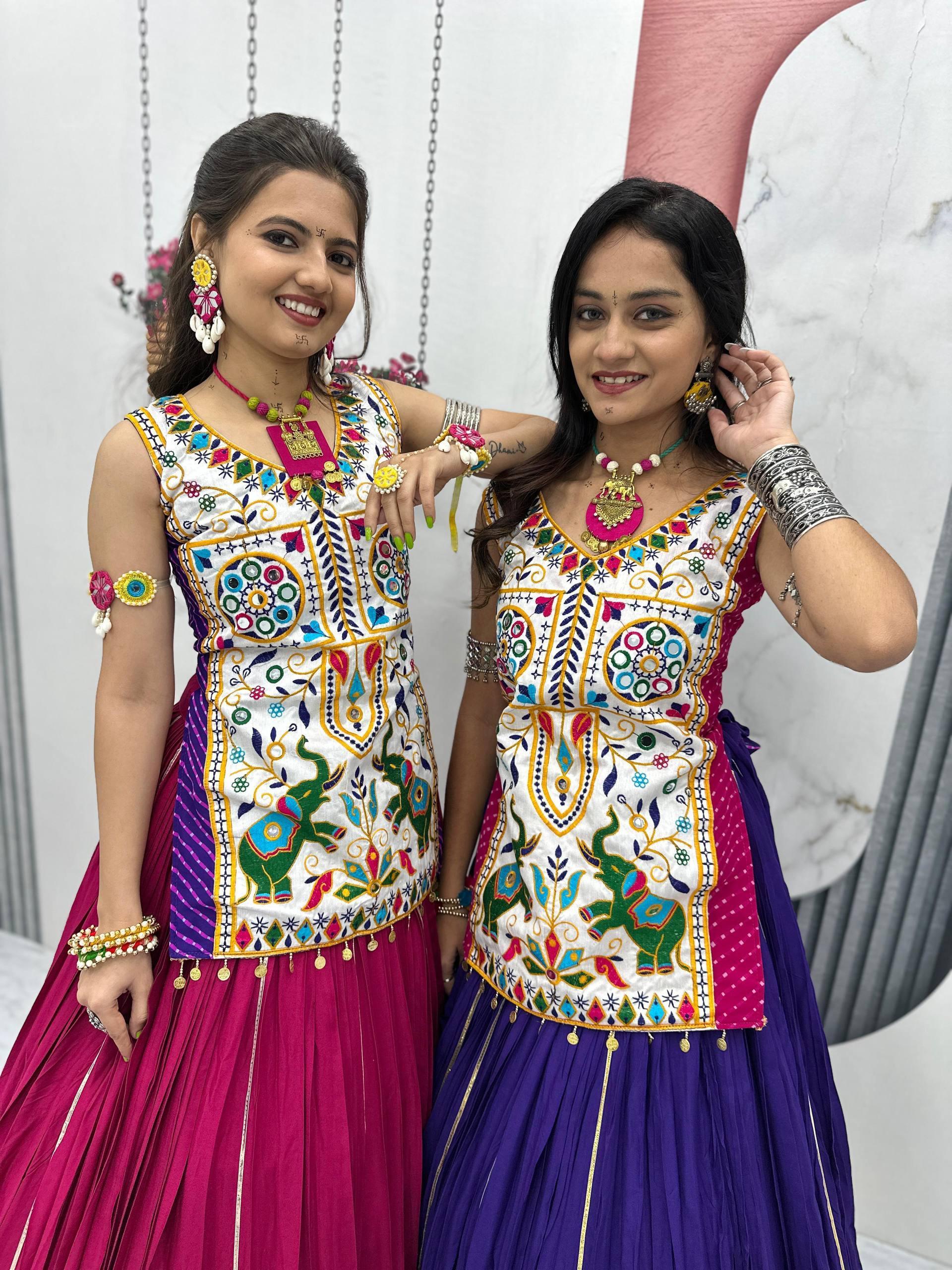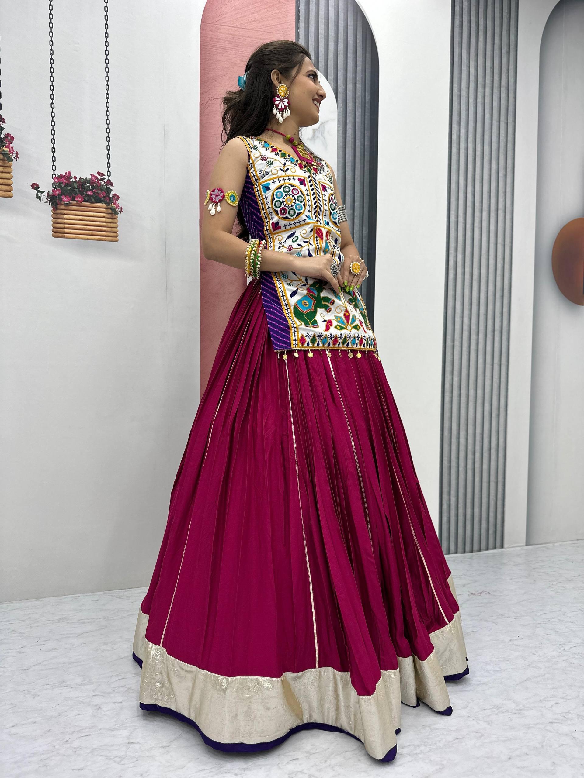 The beautiful choli with padding and intricate mirror work pairs perfectly with a pure cotton lehenga featuring a grand 6-meter flair, giving you a stunning twirl-worthy silhouette. Enhanced with lumpi lace border and ribbon work, this outfit is perfect for Navratri, Garba nights, festive celebrations, and cultural events.