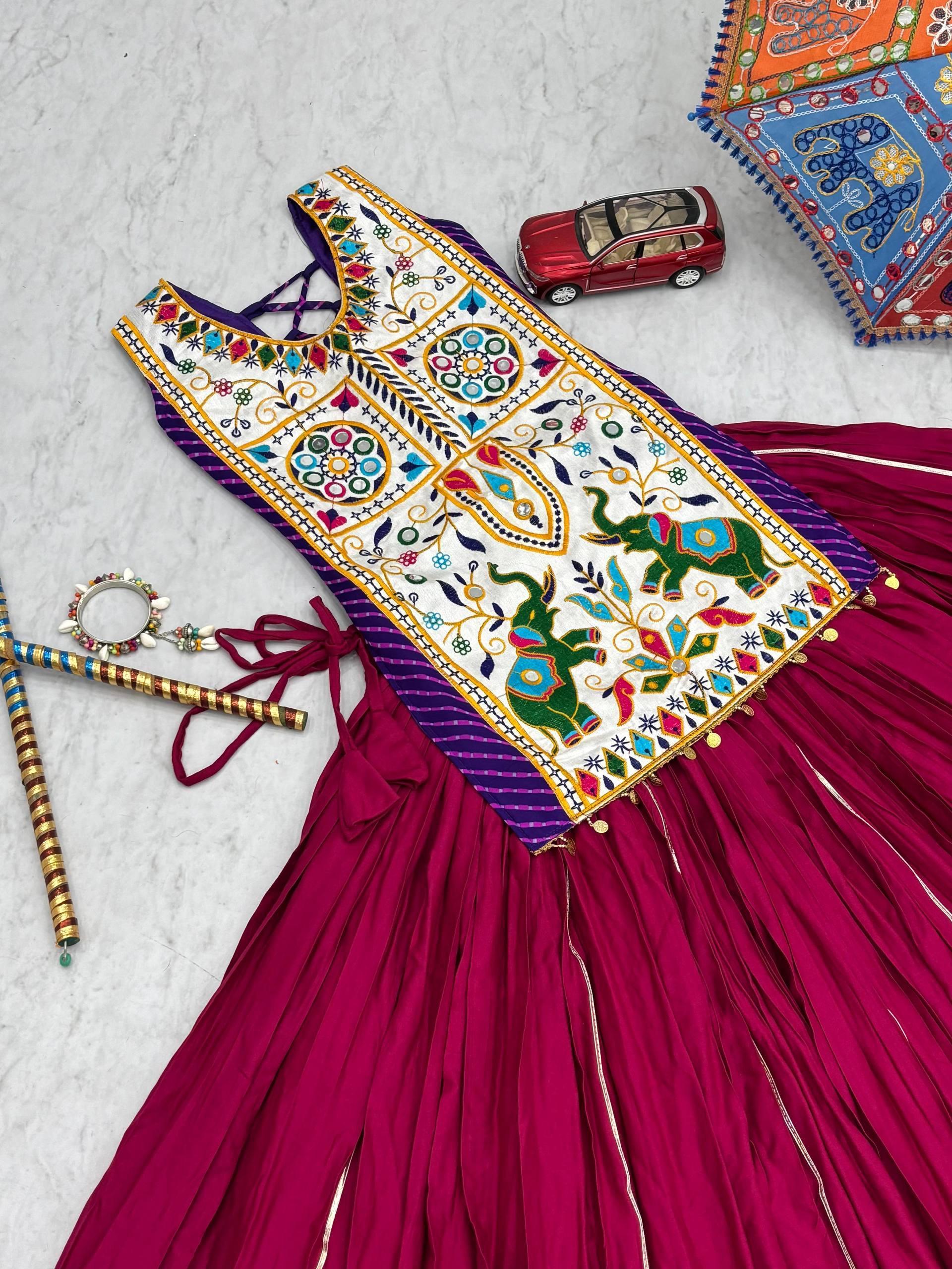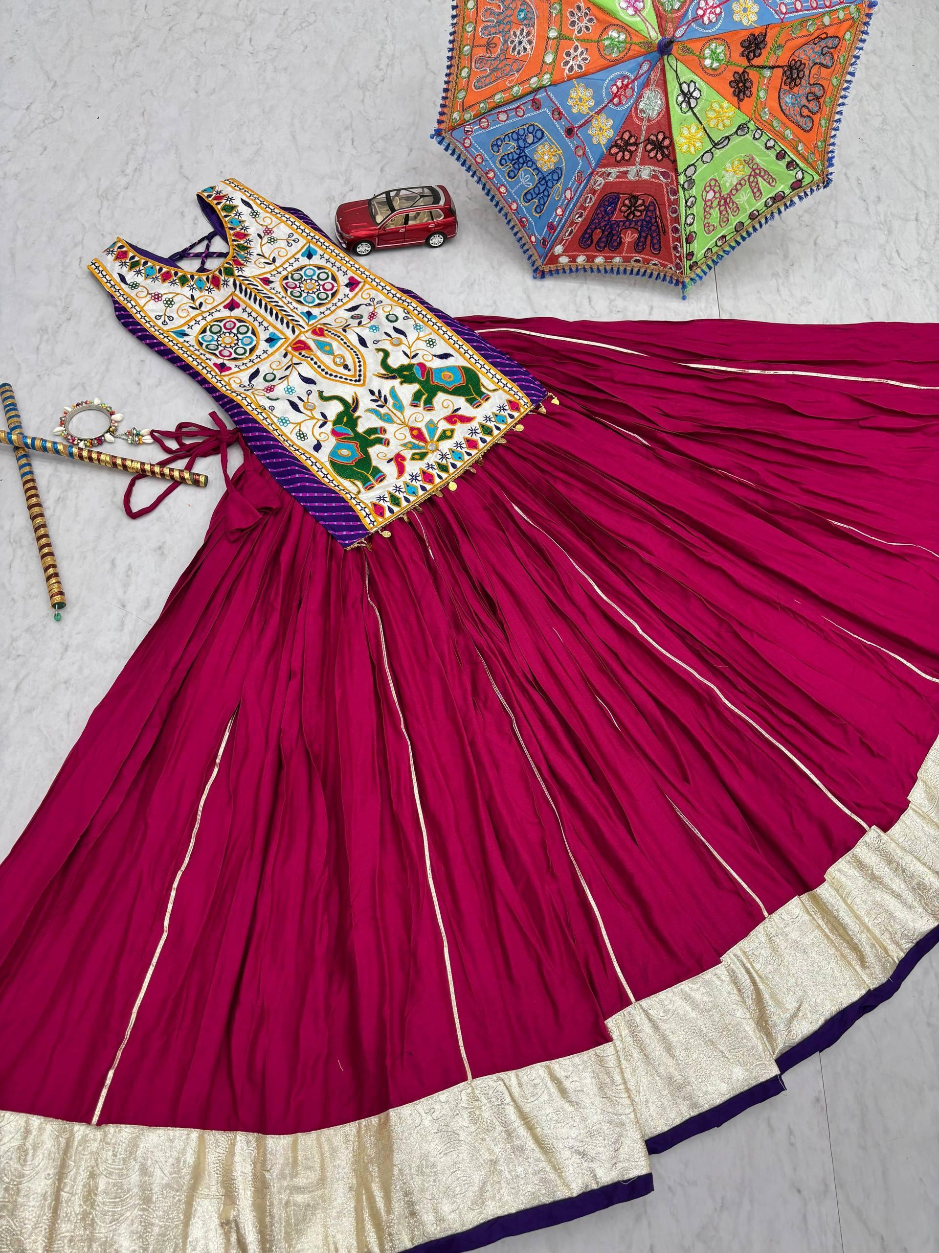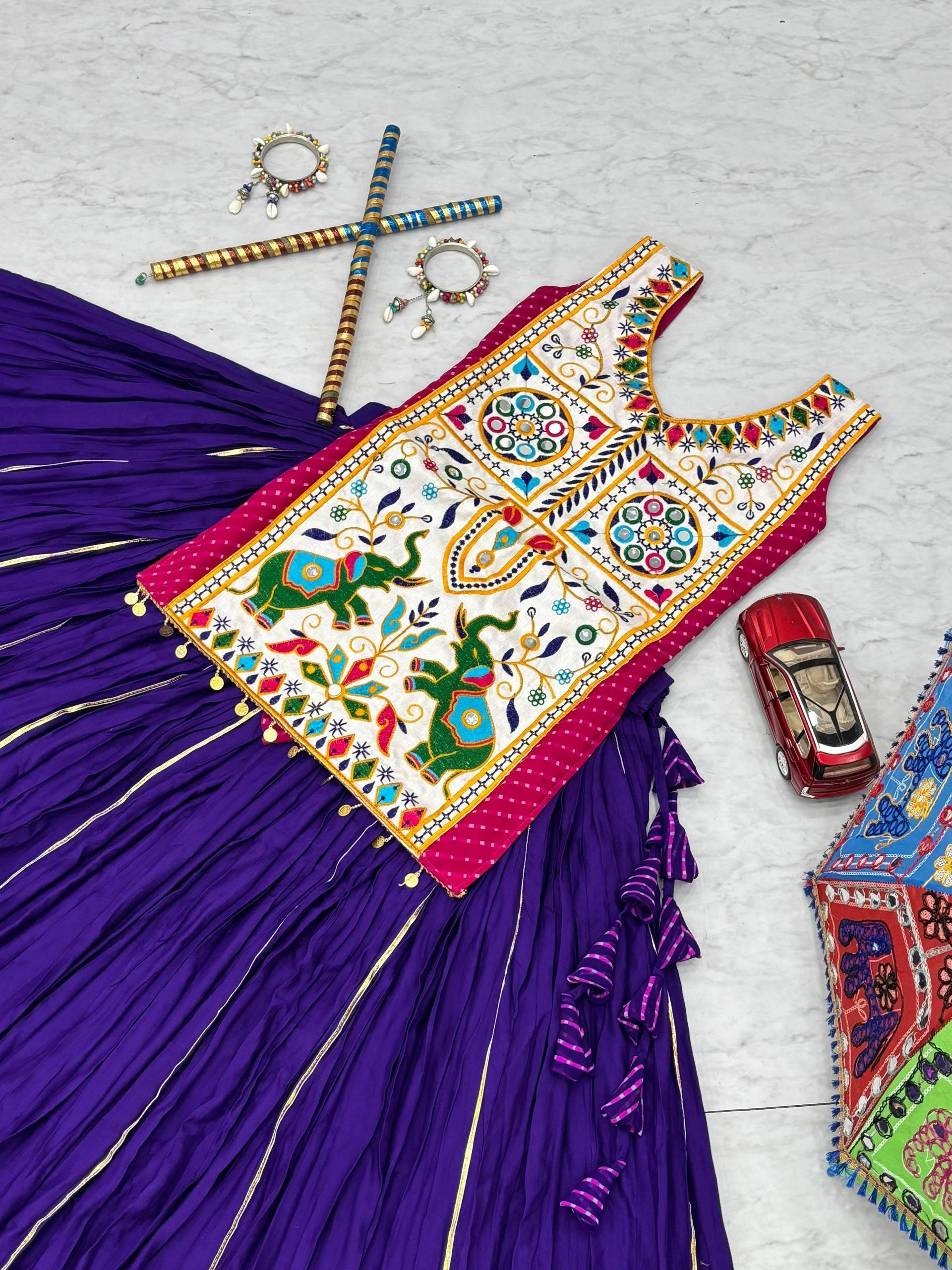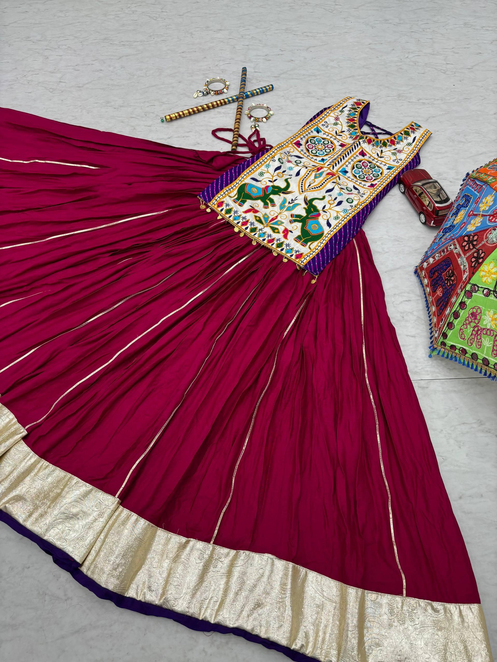 The beautiful choli with padding and intricate mirror work pairs perfectly with a pure cotton lehenga featuring a grand 6-meter flair, giving you a stunning twirl-worthy silhouette. Enhanced with lumpi lace border and ribbon work, this outfit is perfect for Navratri, Garba nights, festive celebrations, and cultural events.