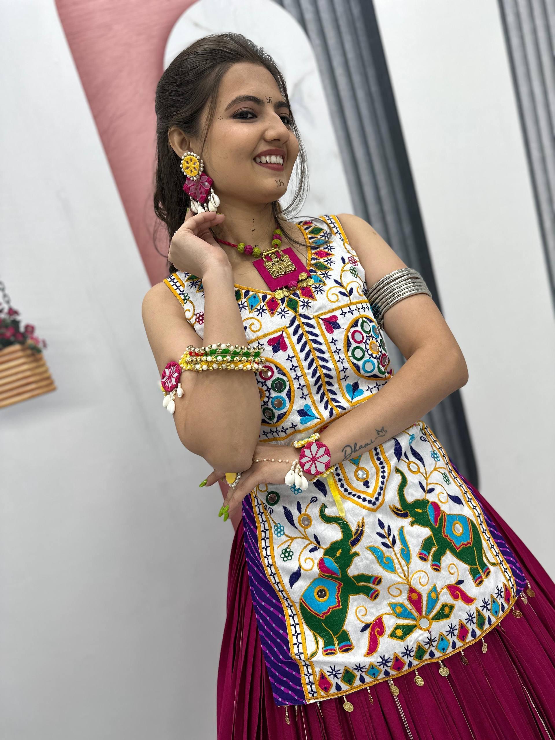 Celebrate this festive season in style with the Prisha Navratri Special Lehenga Choli Set, designed to give you a vibrant and traditional Garba-ready look. Crafted with premium fabrics and real modeling finish, this outfit features heavy Gamathi work with real mirror detailing, adding authentic ethnic charm.
