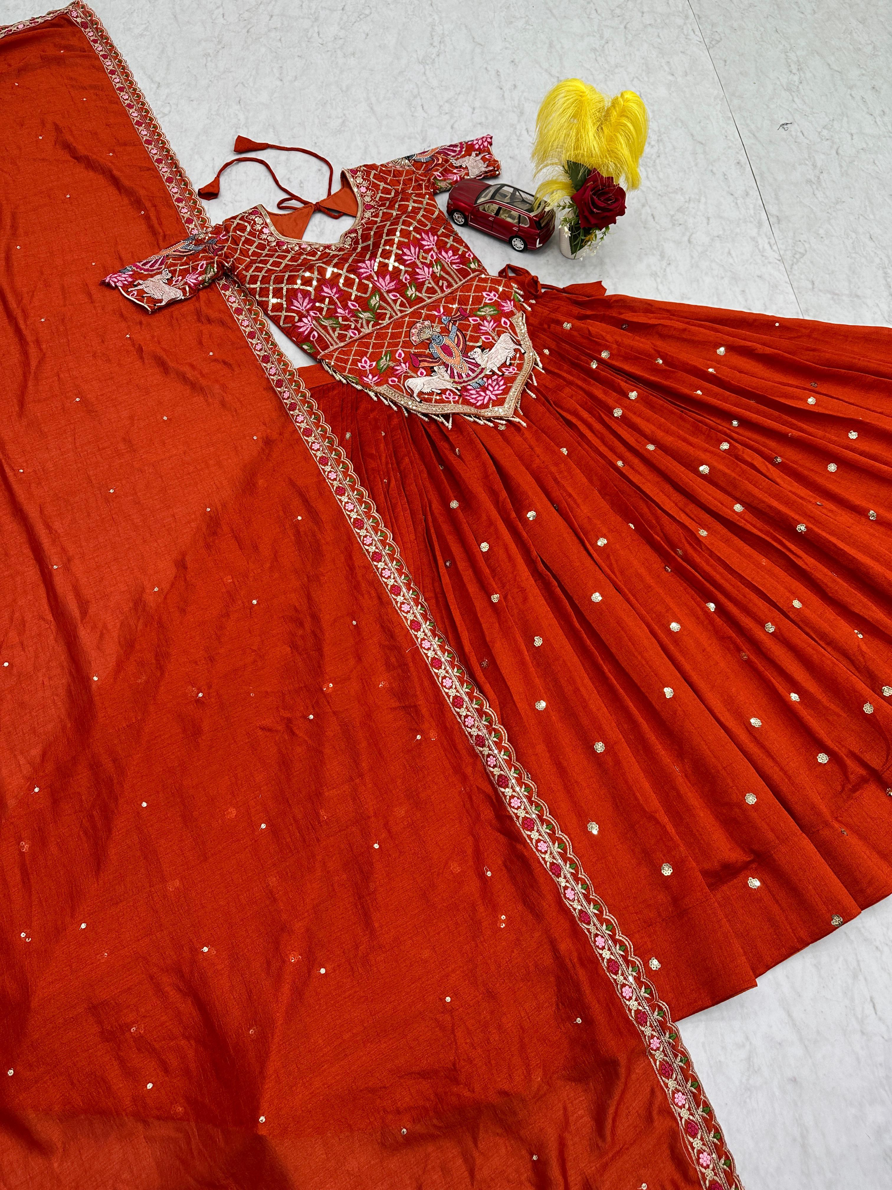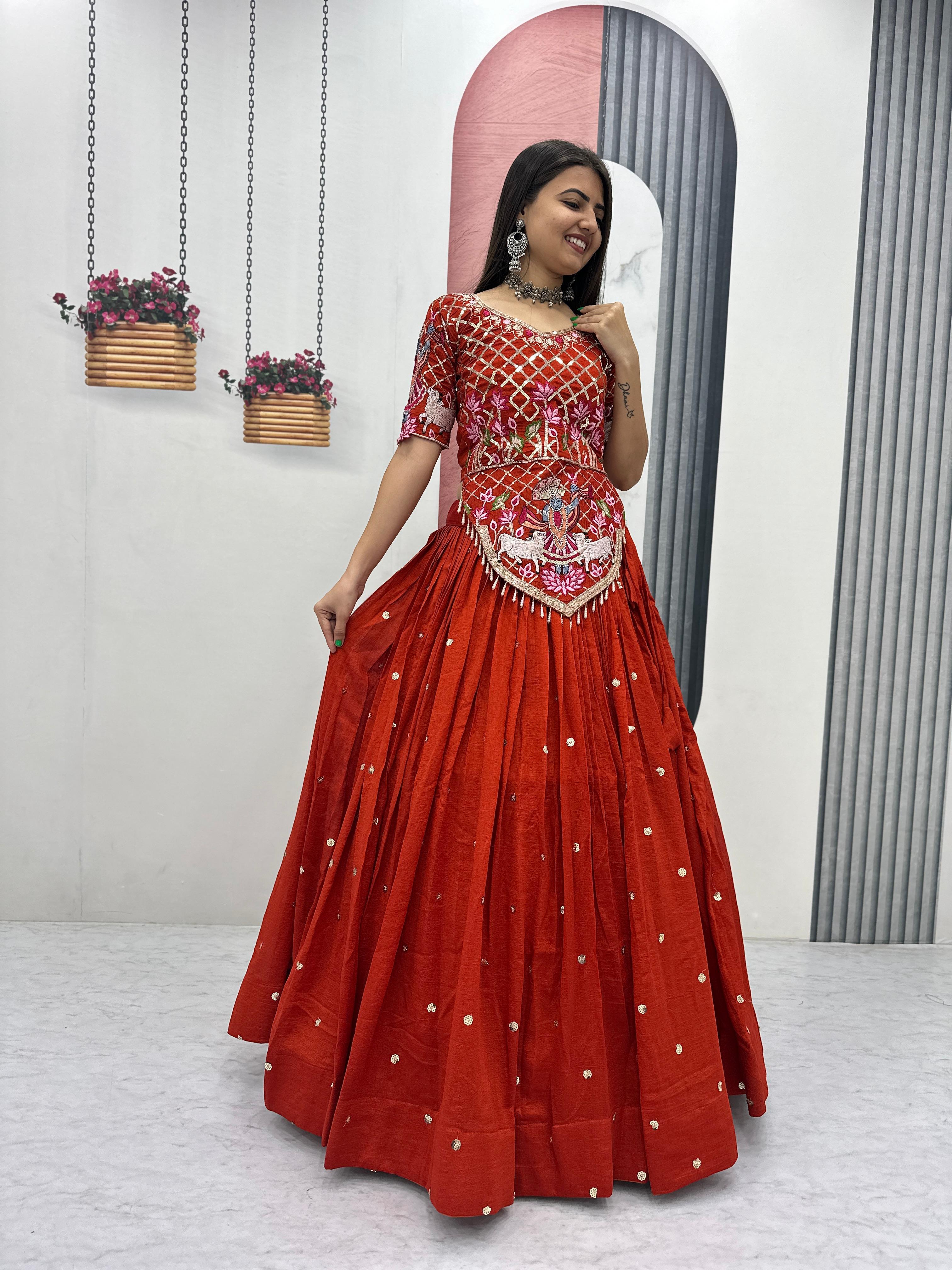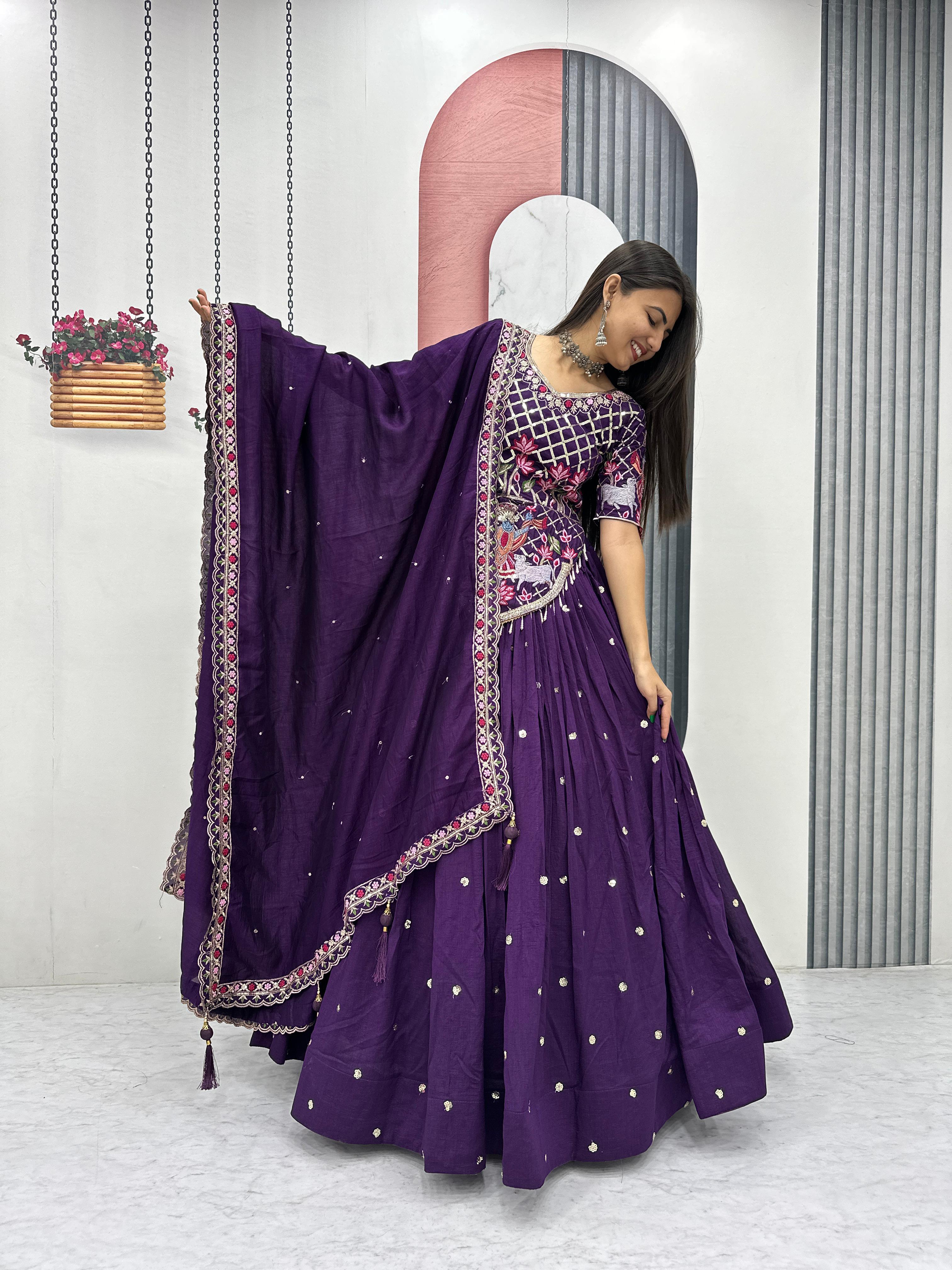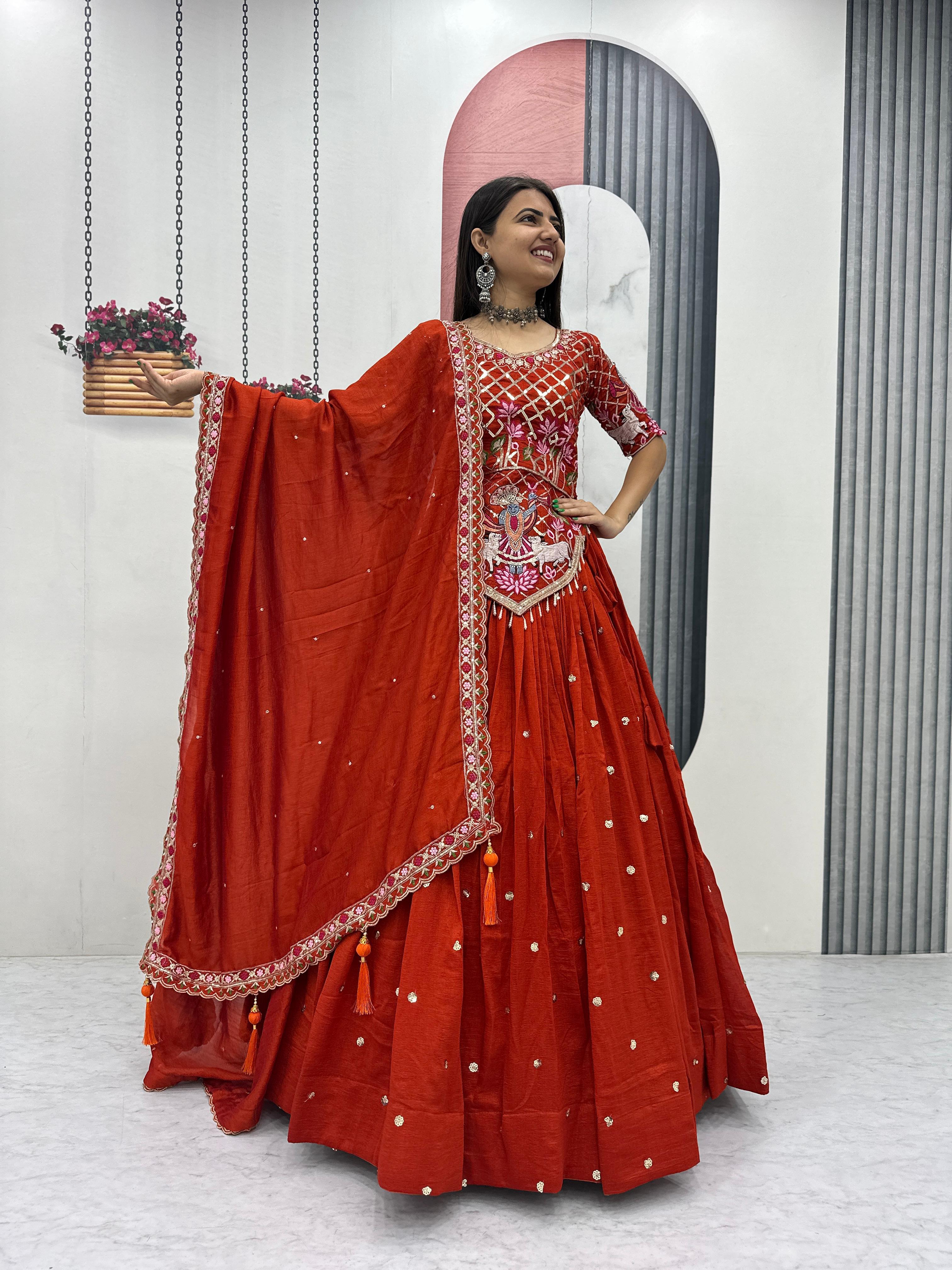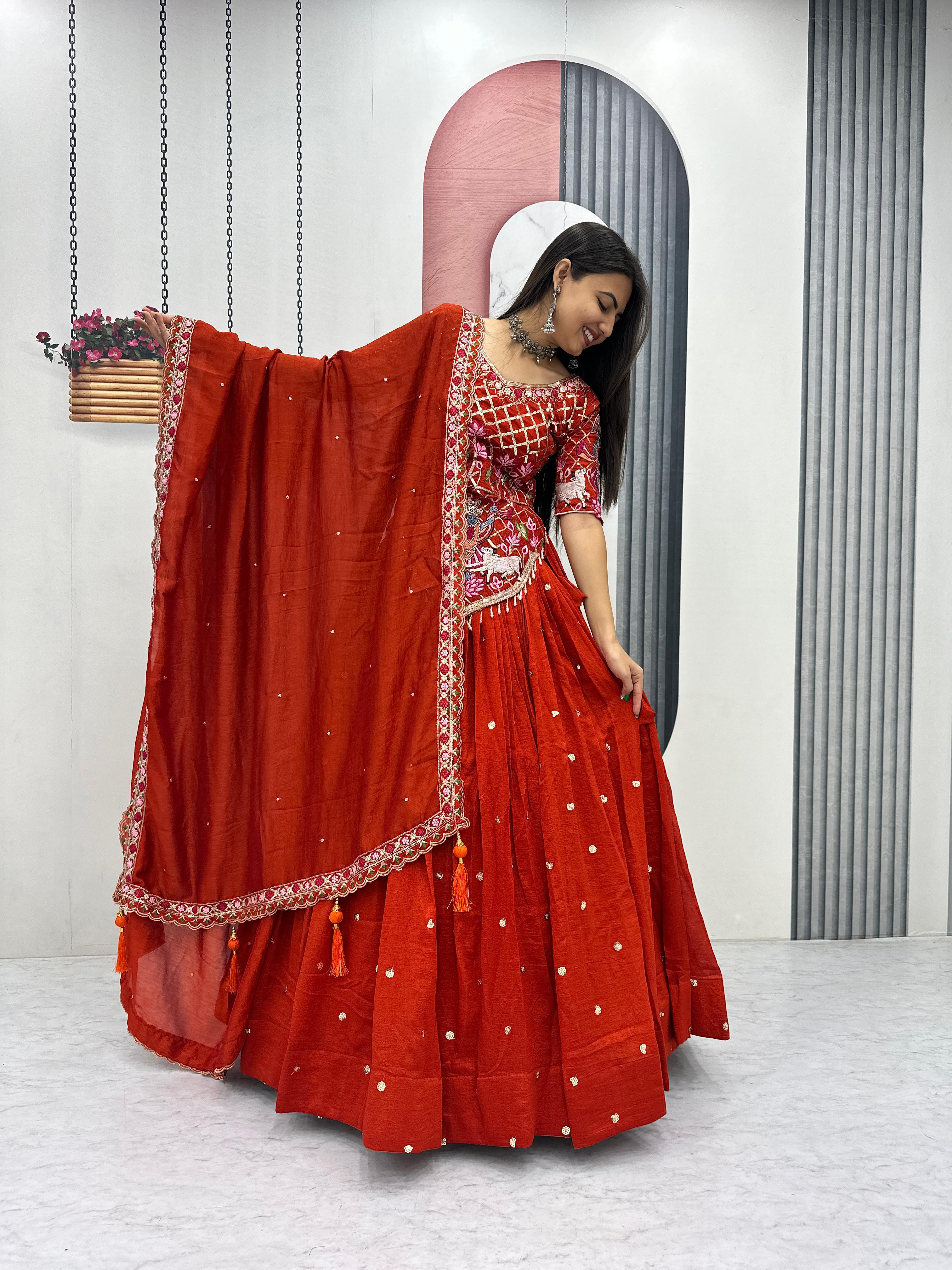 The heavily flared 6-meter lehenga creates a stunning, voluminous silhouette perfect for twirling at weddings and festive occasions. Paired with a fully stitched embroidered choli and a matching Vichitra silk dupatta, this ensemble offers a complete bridal and festive look.