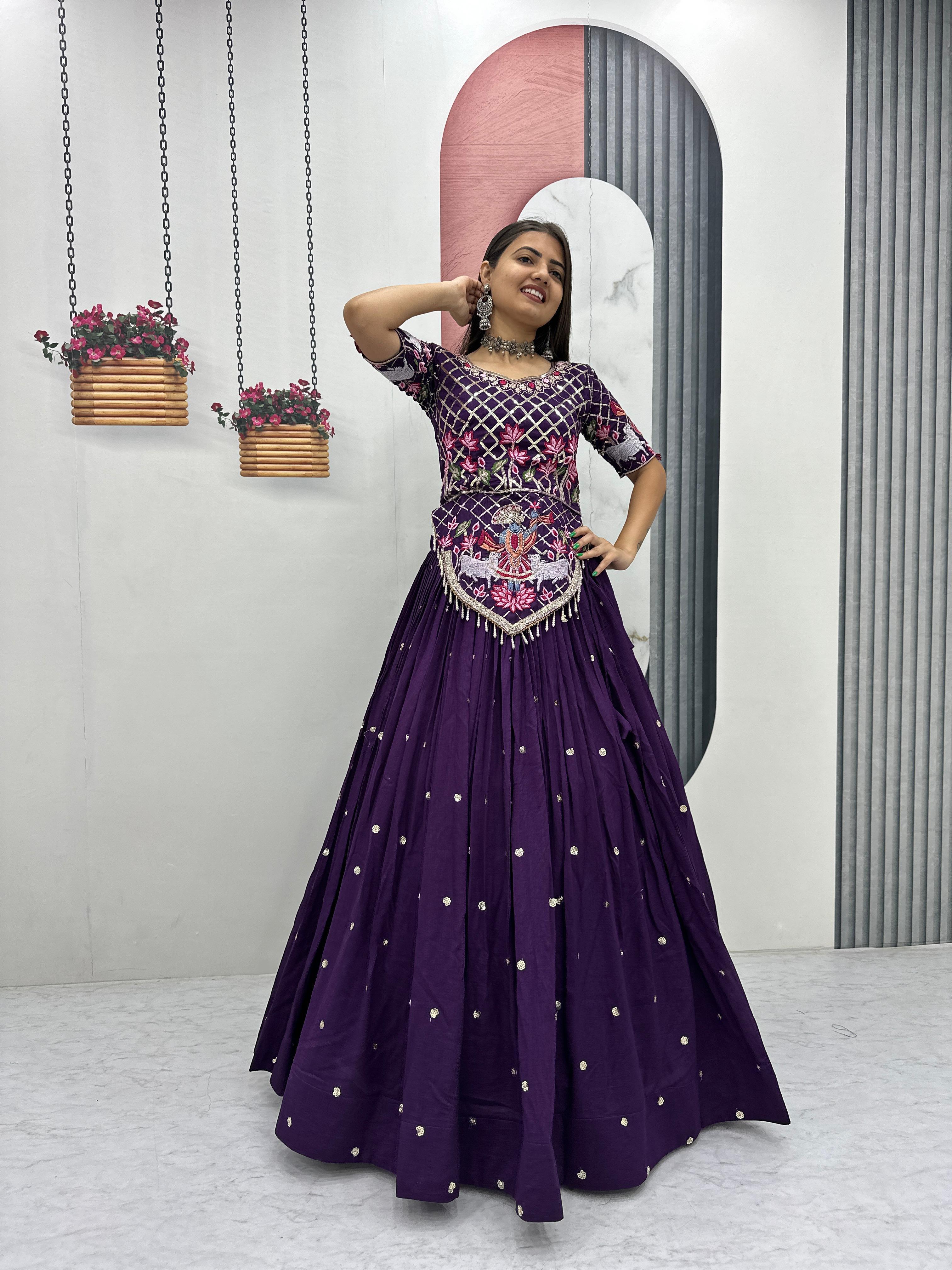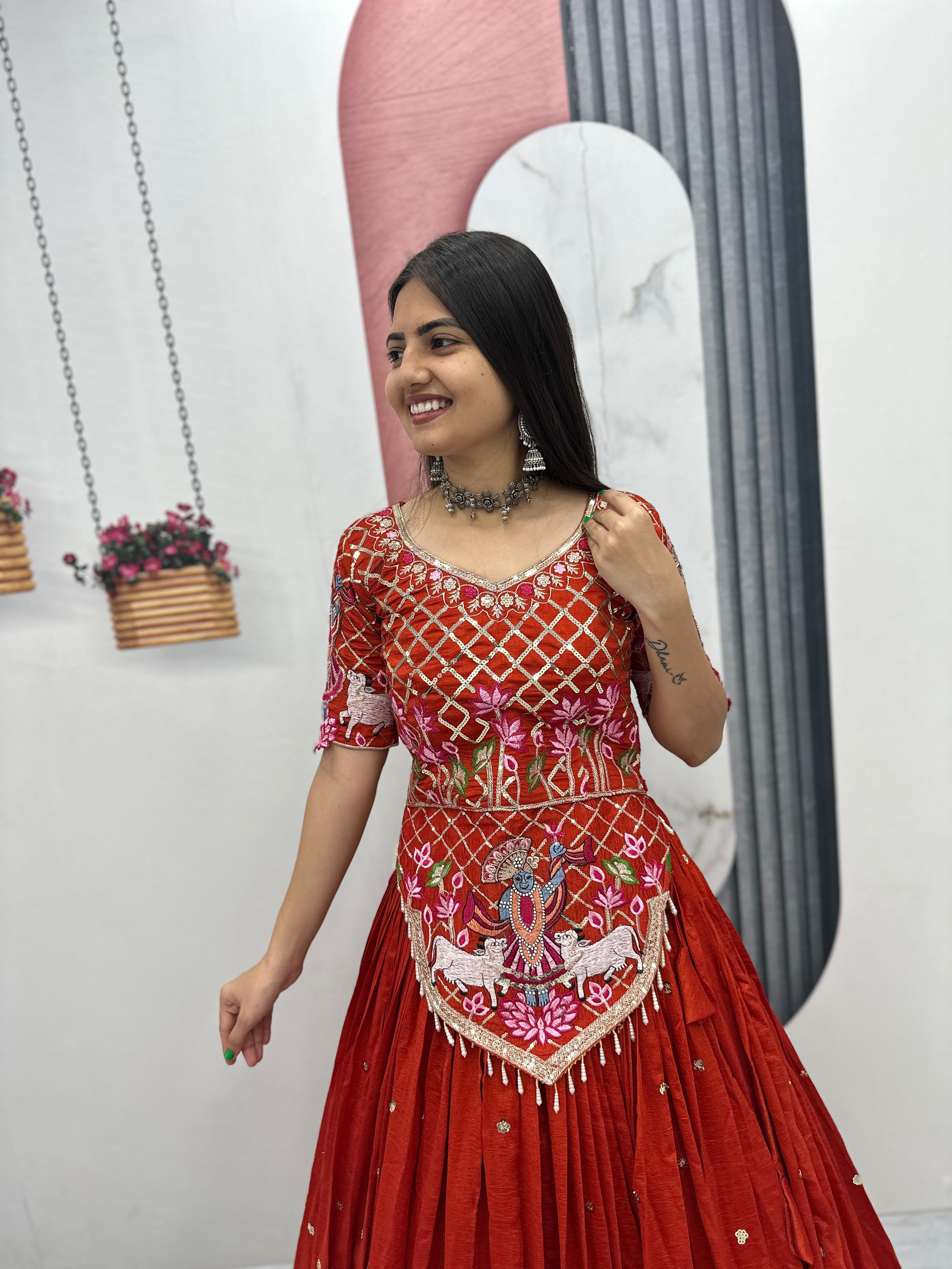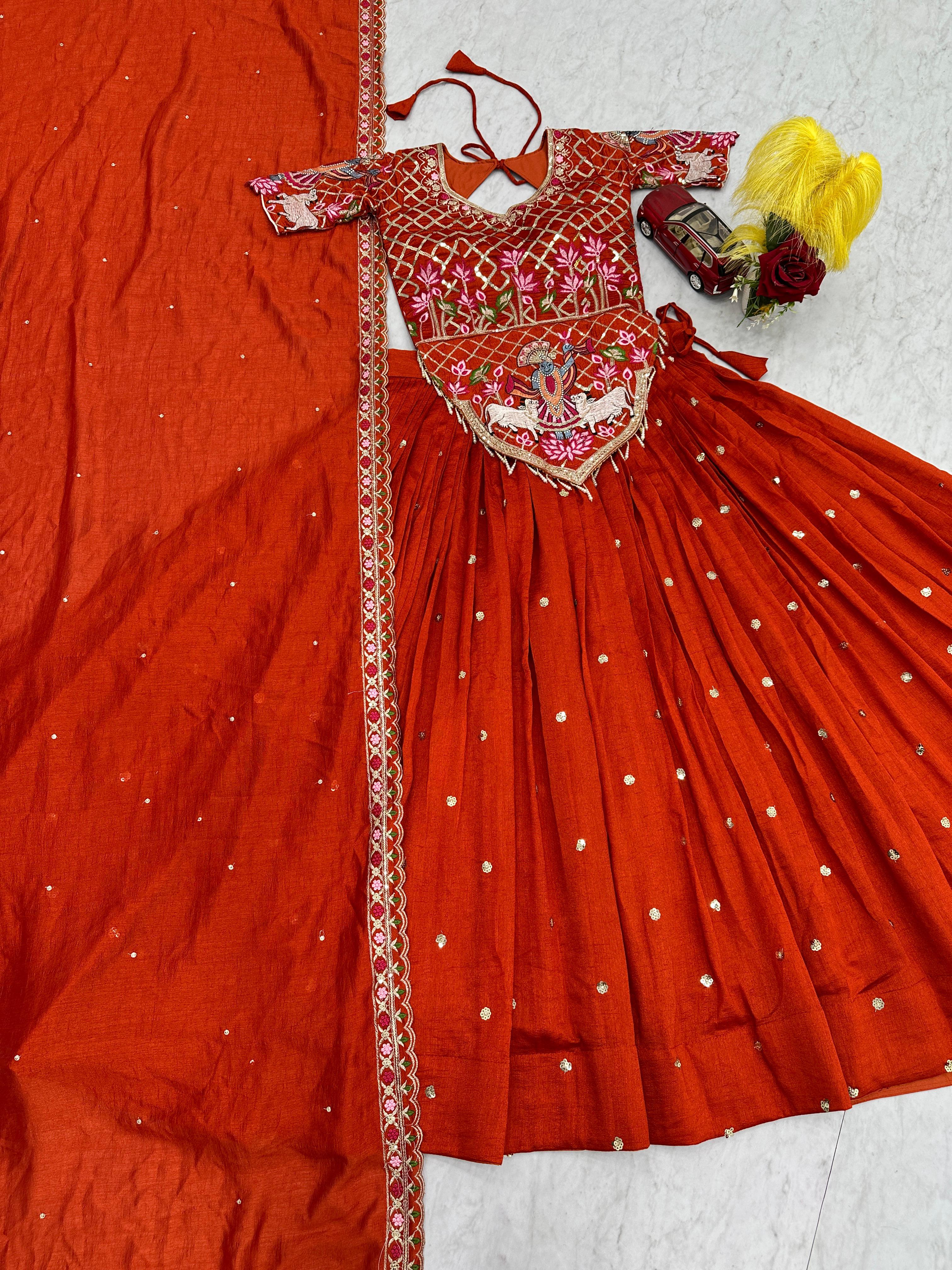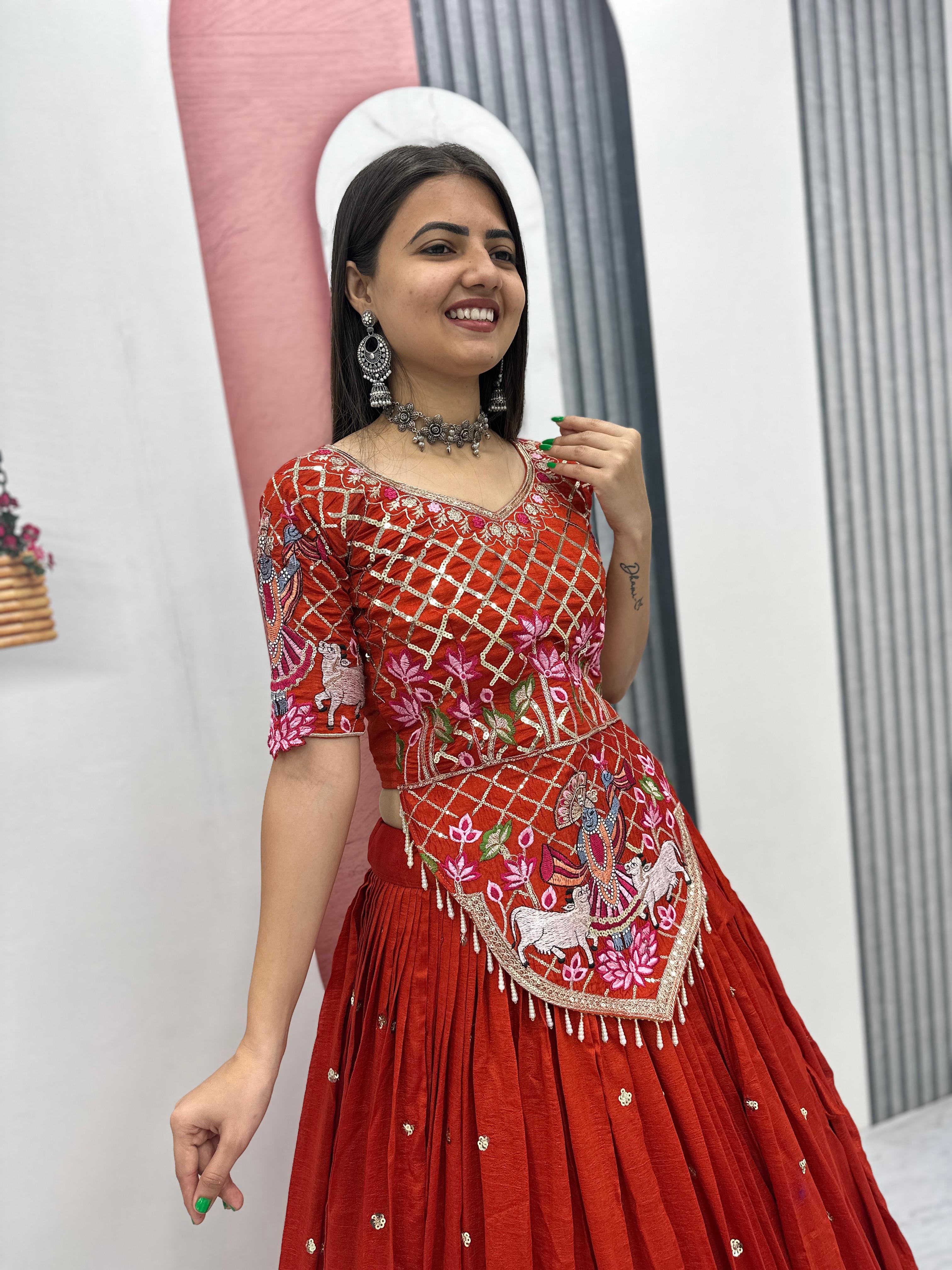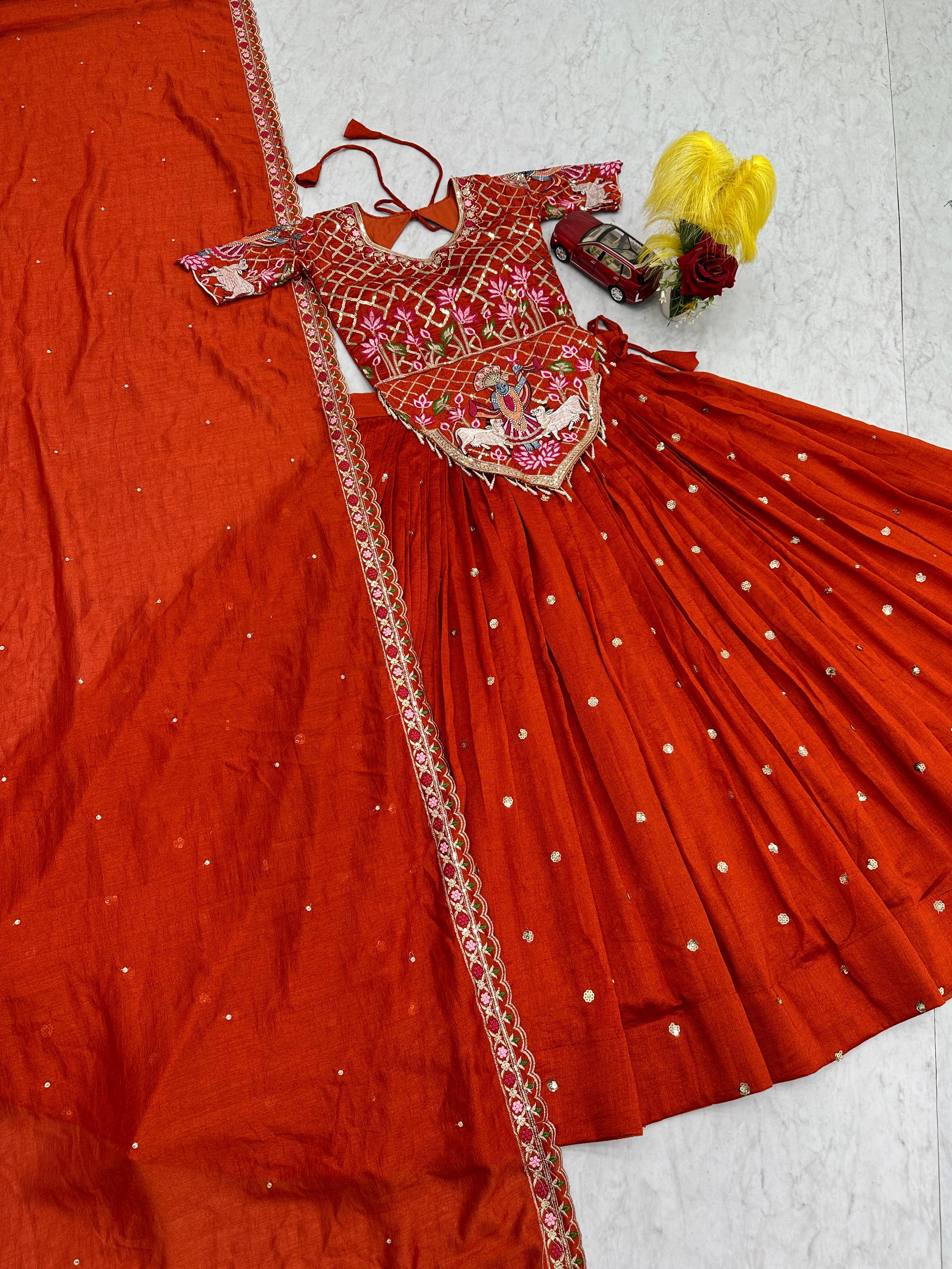 The heavily flared 6-meter lehenga creates a stunning, voluminous silhouette perfect for twirling at weddings and festive occasions. Paired with a fully stitched embroidered choli and a matching Vichitra silk dupatta, this ensemble offers a complete bridal and festive look.