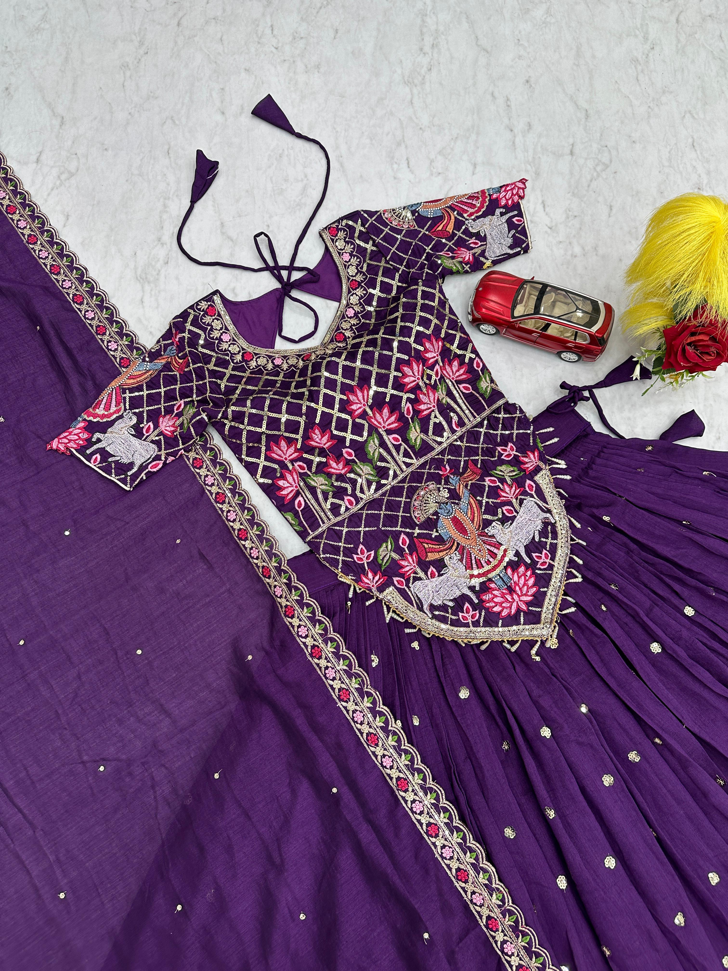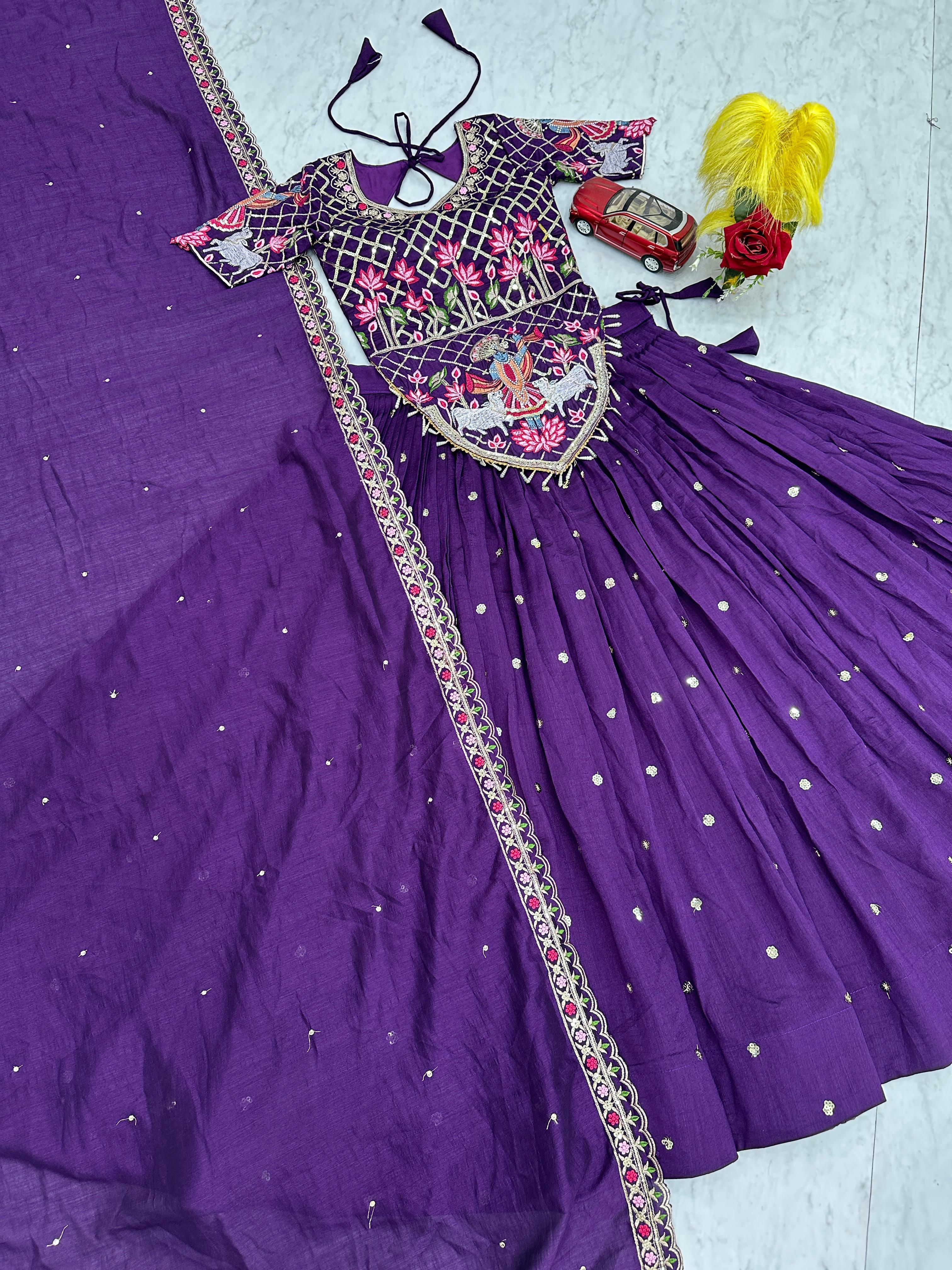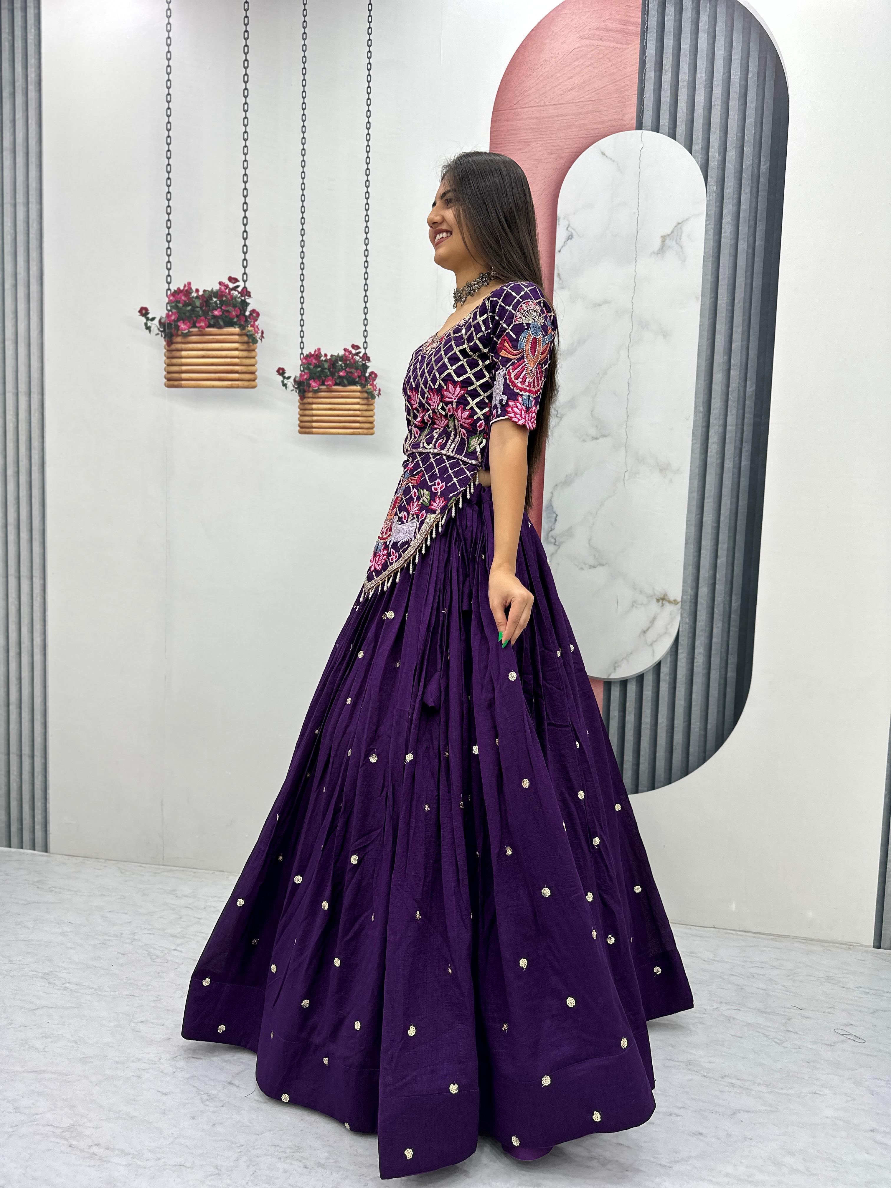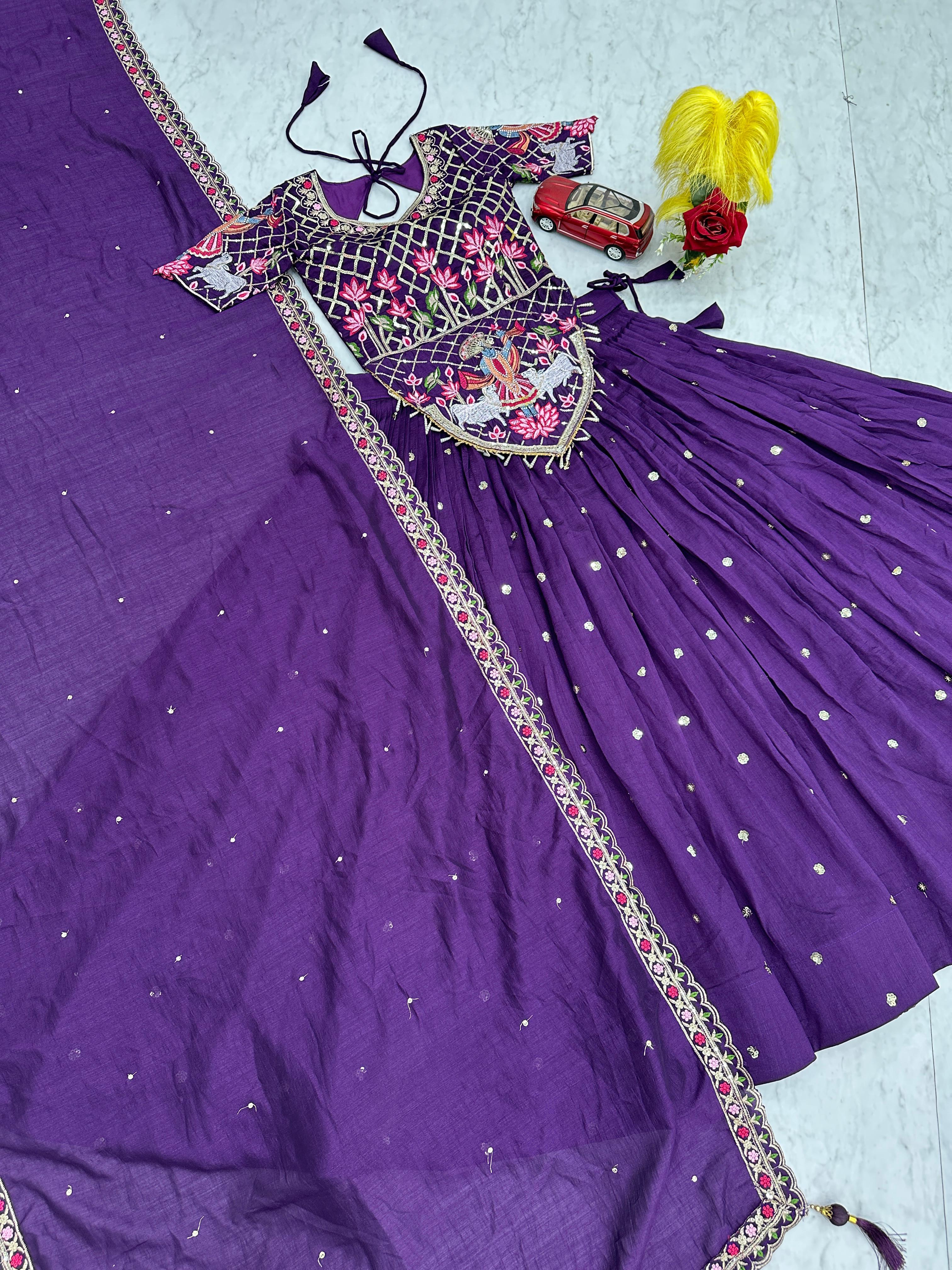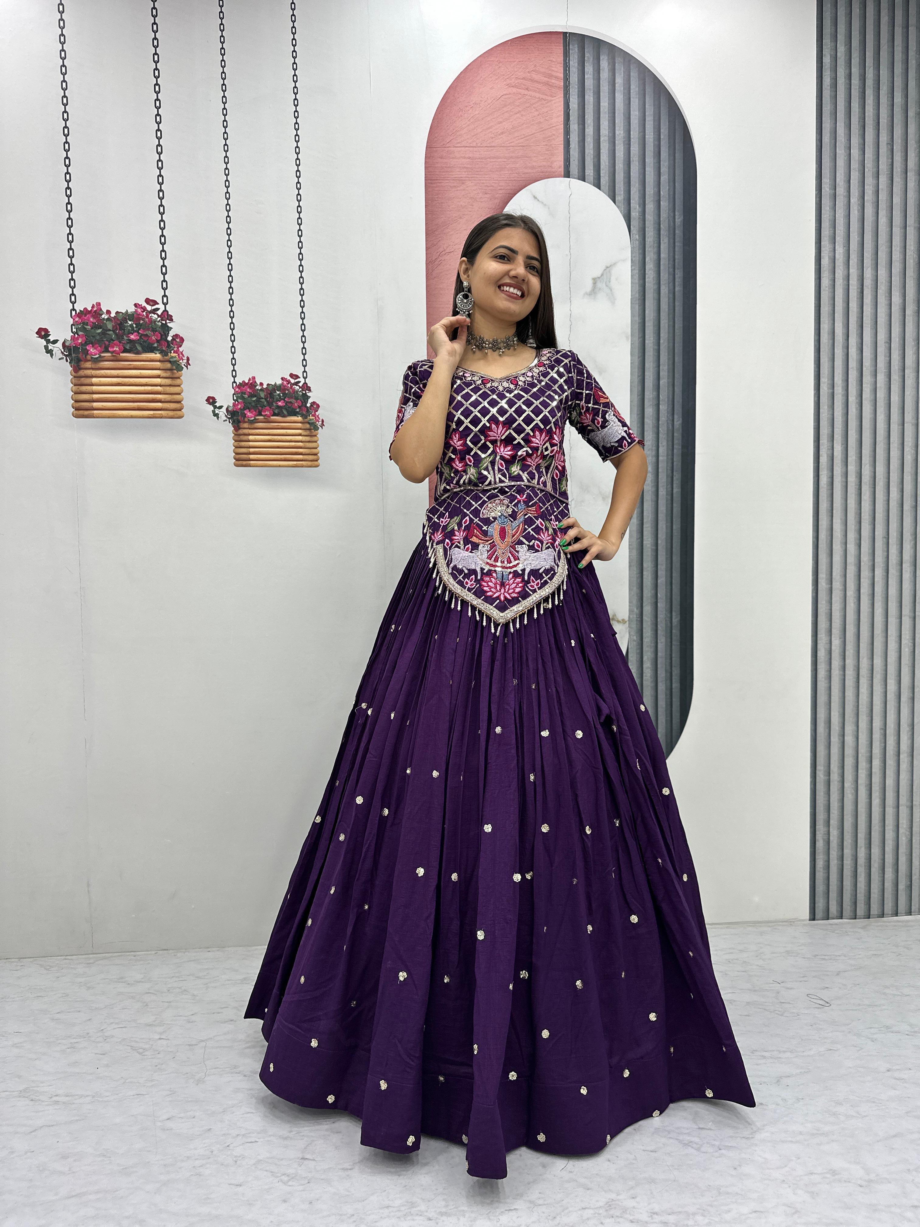 The heavily flared 6-meter lehenga creates a stunning, voluminous silhouette perfect for twirling at weddings and festive occasions. Paired with a fully stitched embroidered choli and a matching Vichitra silk dupatta, this ensemble offers a complete bridal and festive look.