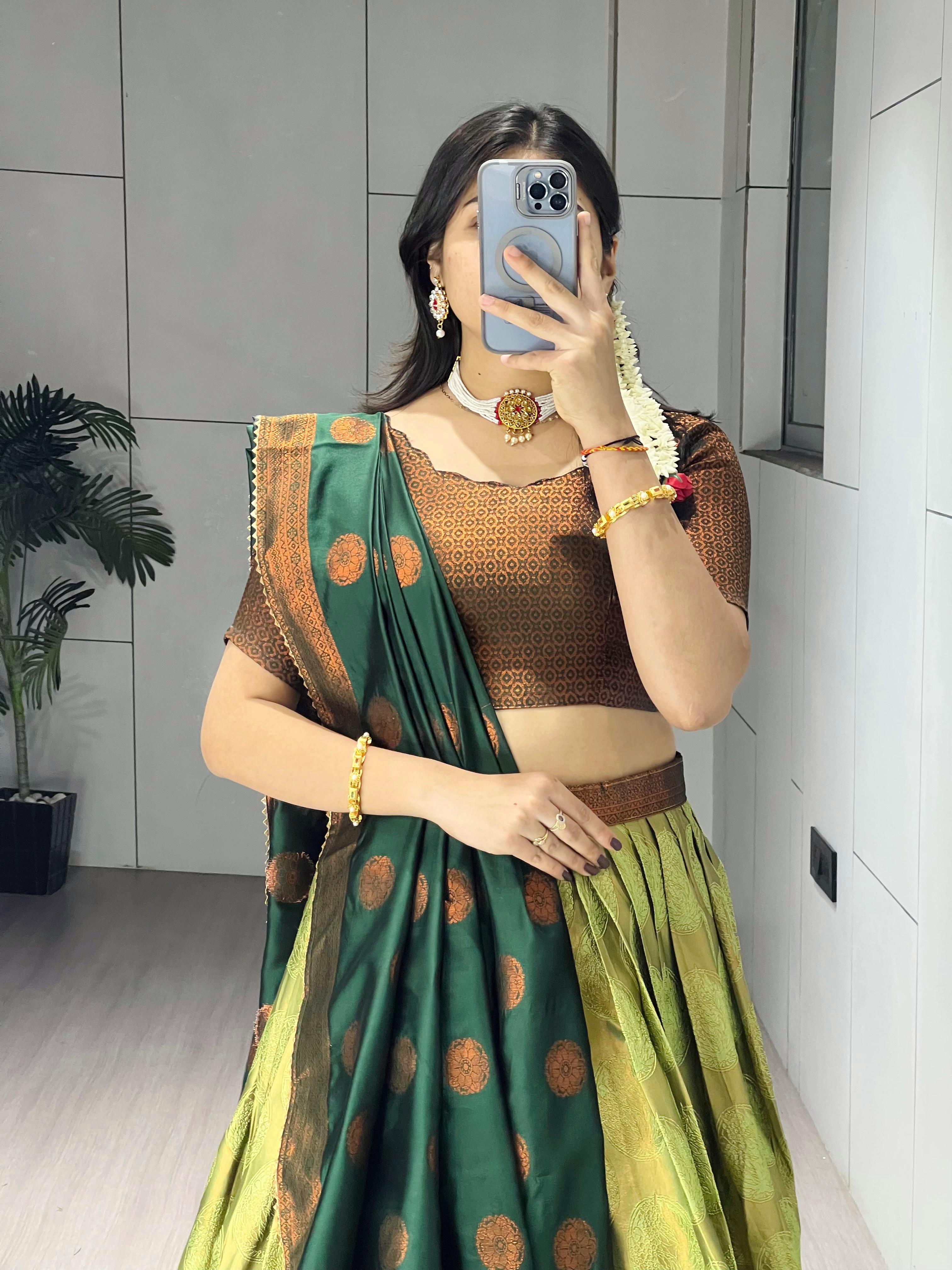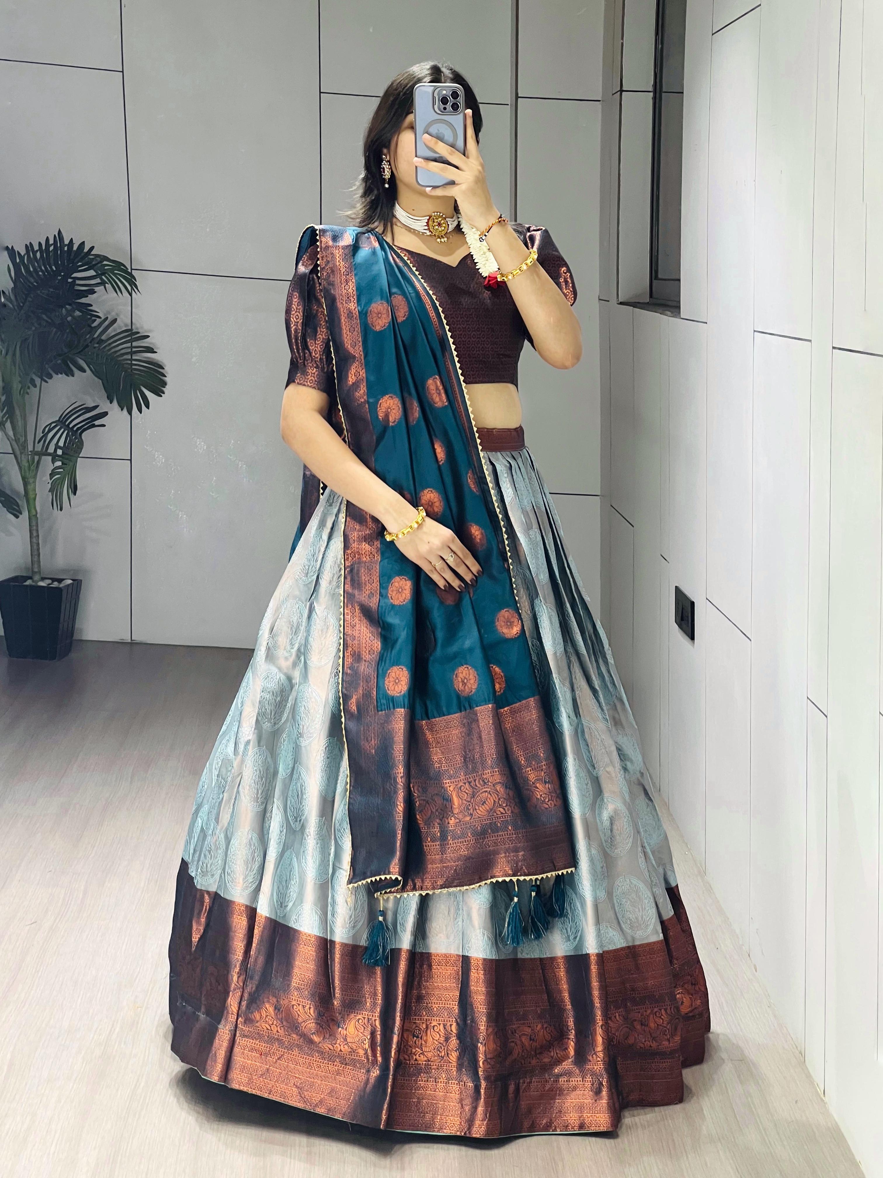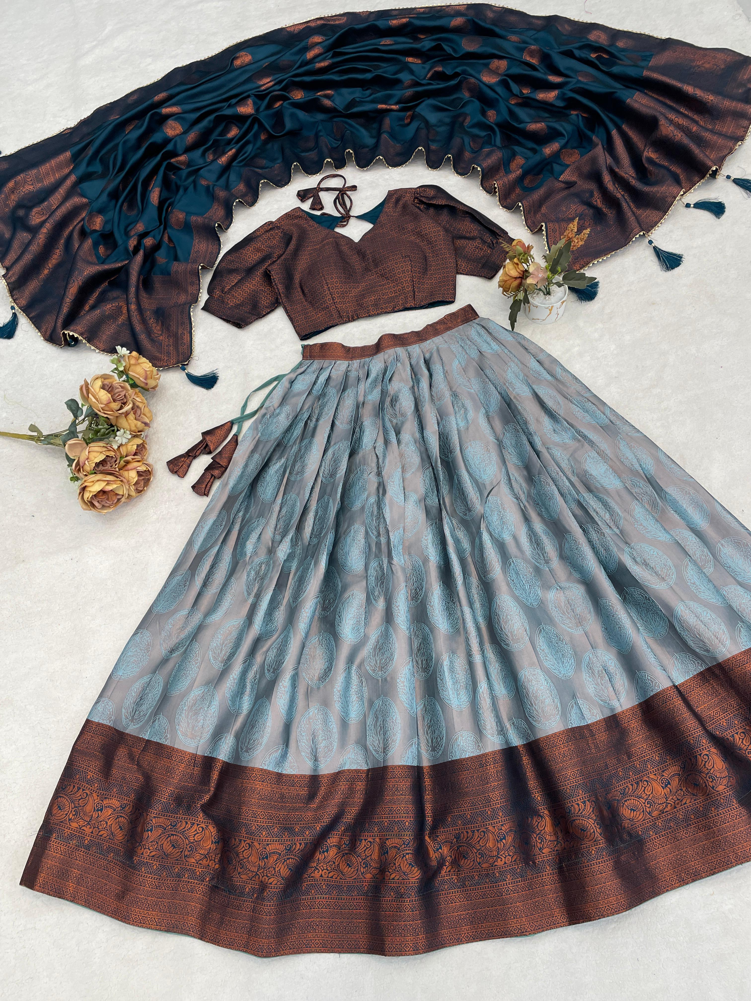 Introducing the Rajsi Silk Pattu Lehenga Set, a luxurious ethnic ensemble designed for weddings and grand festive occasions. Crafted from premium silk fabric, this lehenga showcases beautiful copper-golden zari weaving motifs with a contrasting border, giving it a regal and timeless appeal.