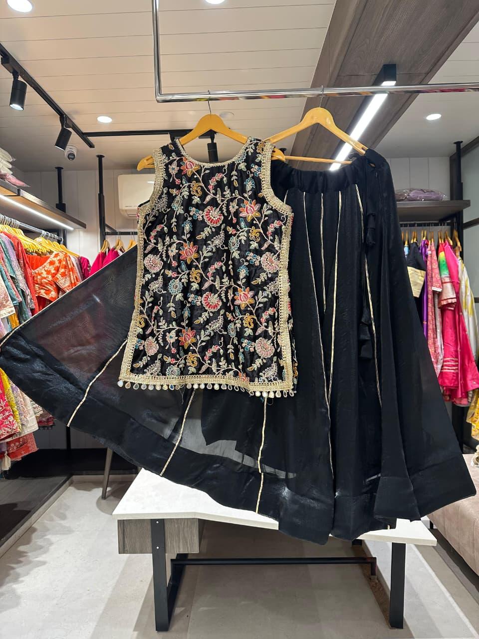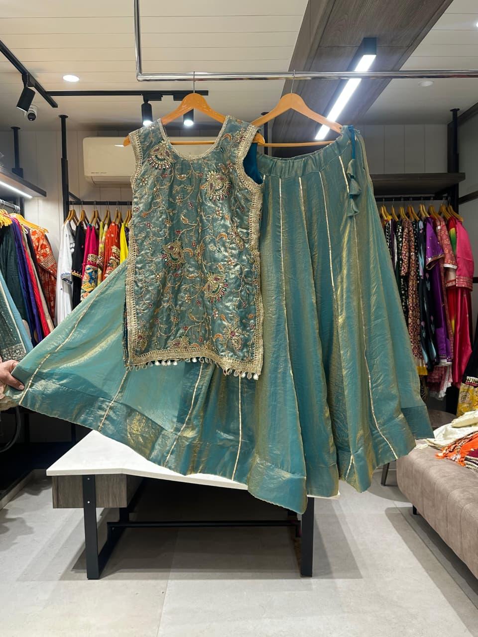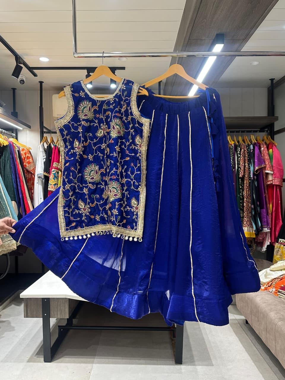 The skirt is beautifully structured with pure crepe lining, heavy can-can layers, and elegant gotta lace finishing, ensuring a voluminous and rich look. Paired with a designer blouse featuring intricate resham embroidery and mirror lace detailing, this outfit is perfect for weddings, festive celebrations, and grand occasions.