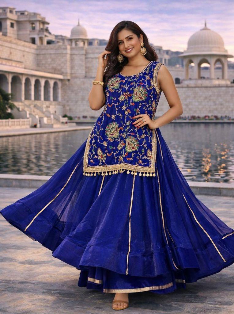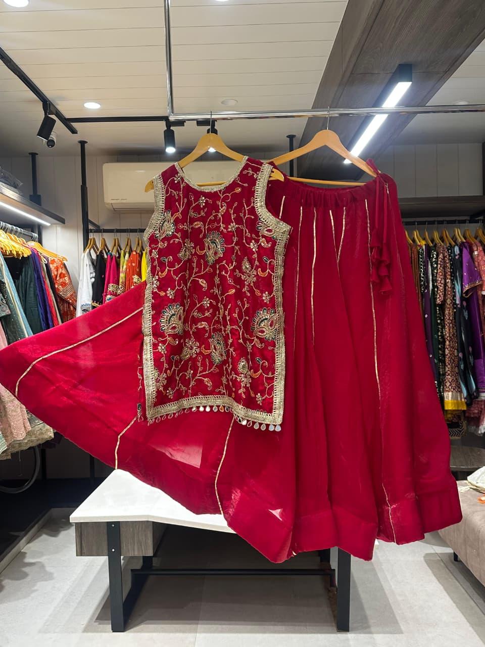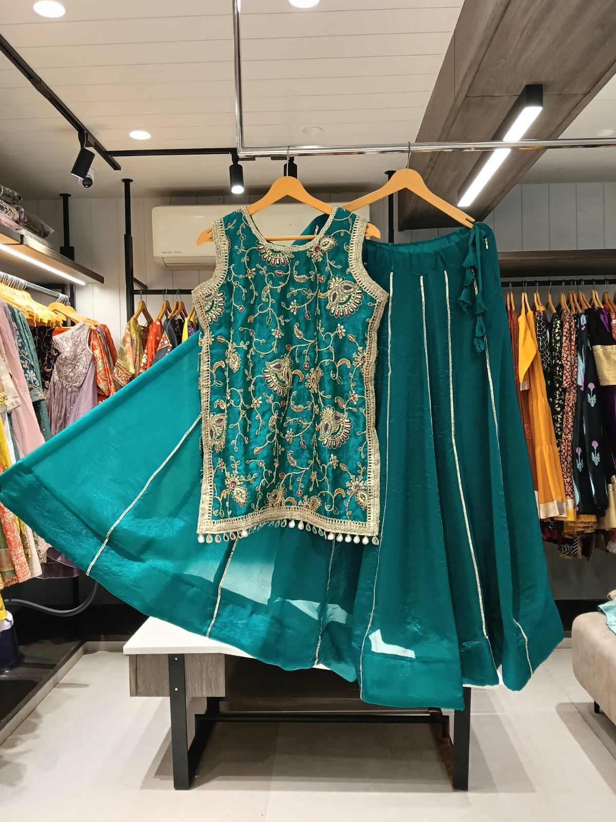 The skirt is beautifully structured with pure crepe lining, heavy can-can layers, and elegant gotta lace finishing, ensuring a voluminous and rich look. Paired with a designer blouse featuring intricate resham embroidery and mirror lace detailing, this outfit is perfect for weddings, festive celebrations, and grand occasions.