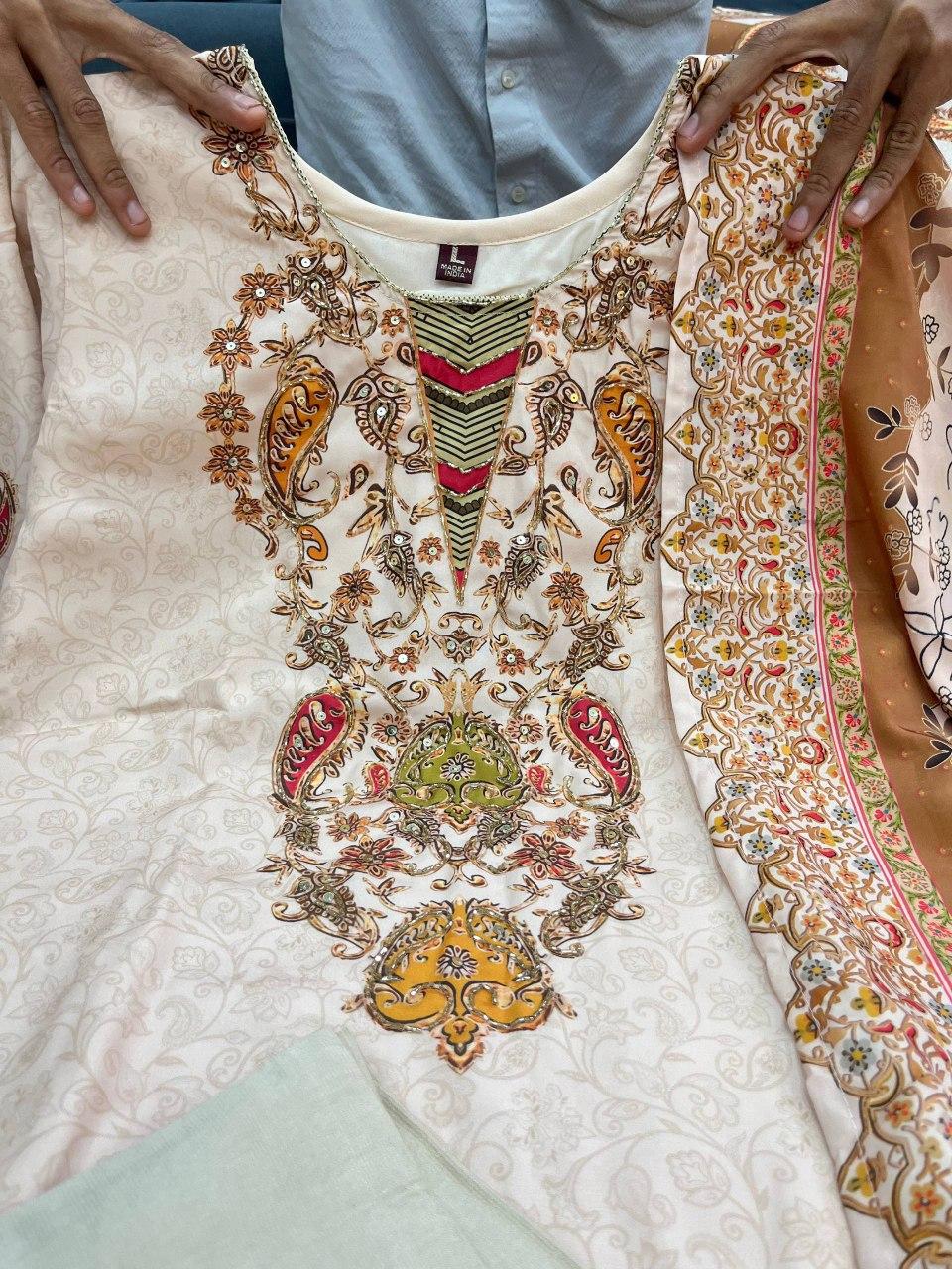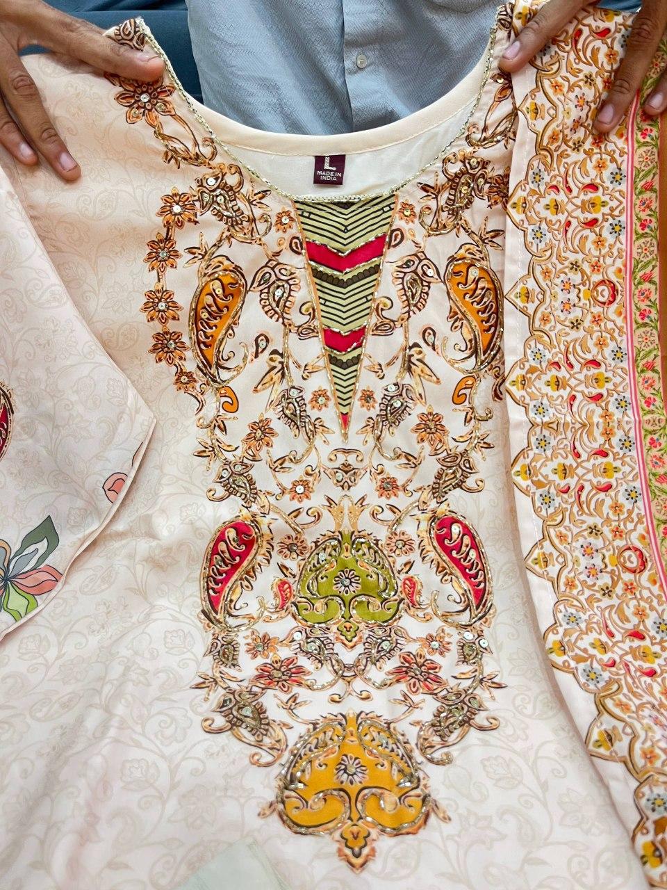 Elevate your festive wardrobe with this Premium Russian Crepe Kurti Pant Dupatta Set, meticulously crafted for comfort, elegance, and timeless charm. Featuring fully hand-embroidered neck work and a soft multicolor floral & paisley print on both sides, this outfit perfectly merges traditional aesthetics with modern appeal.