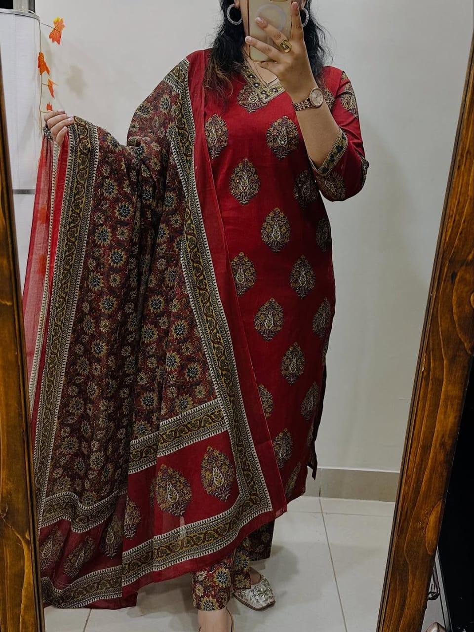 The straight-fit kurti offers a graceful silhouette, paired with comfortable plazo pants and a lightweight dupatta for a complete traditional look. The soft cotton fabric ensures all-day comfort while maintaining a polished and stylish appearance.