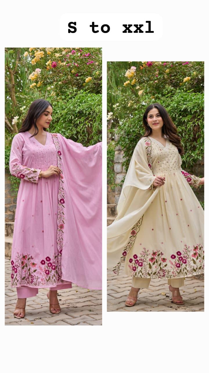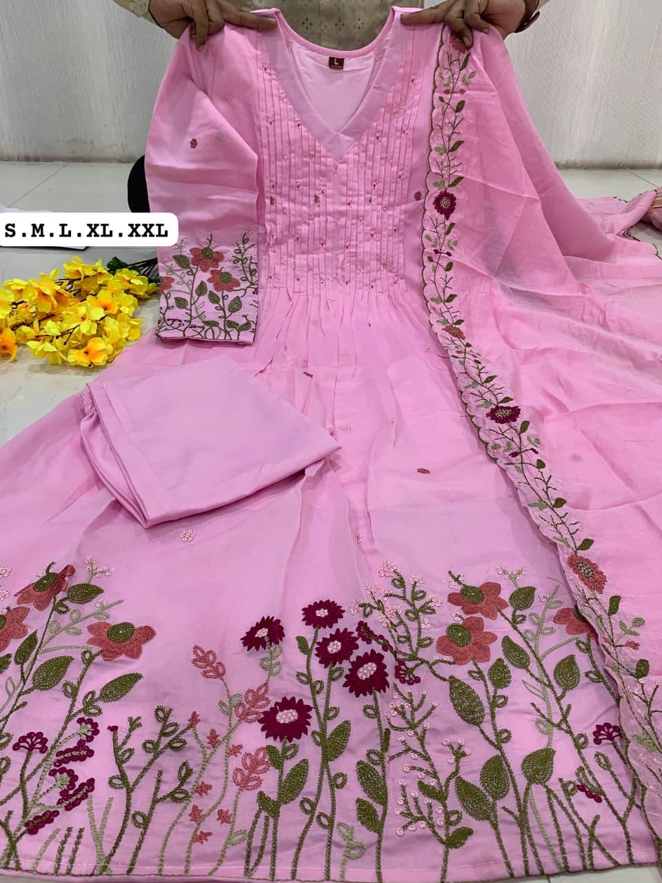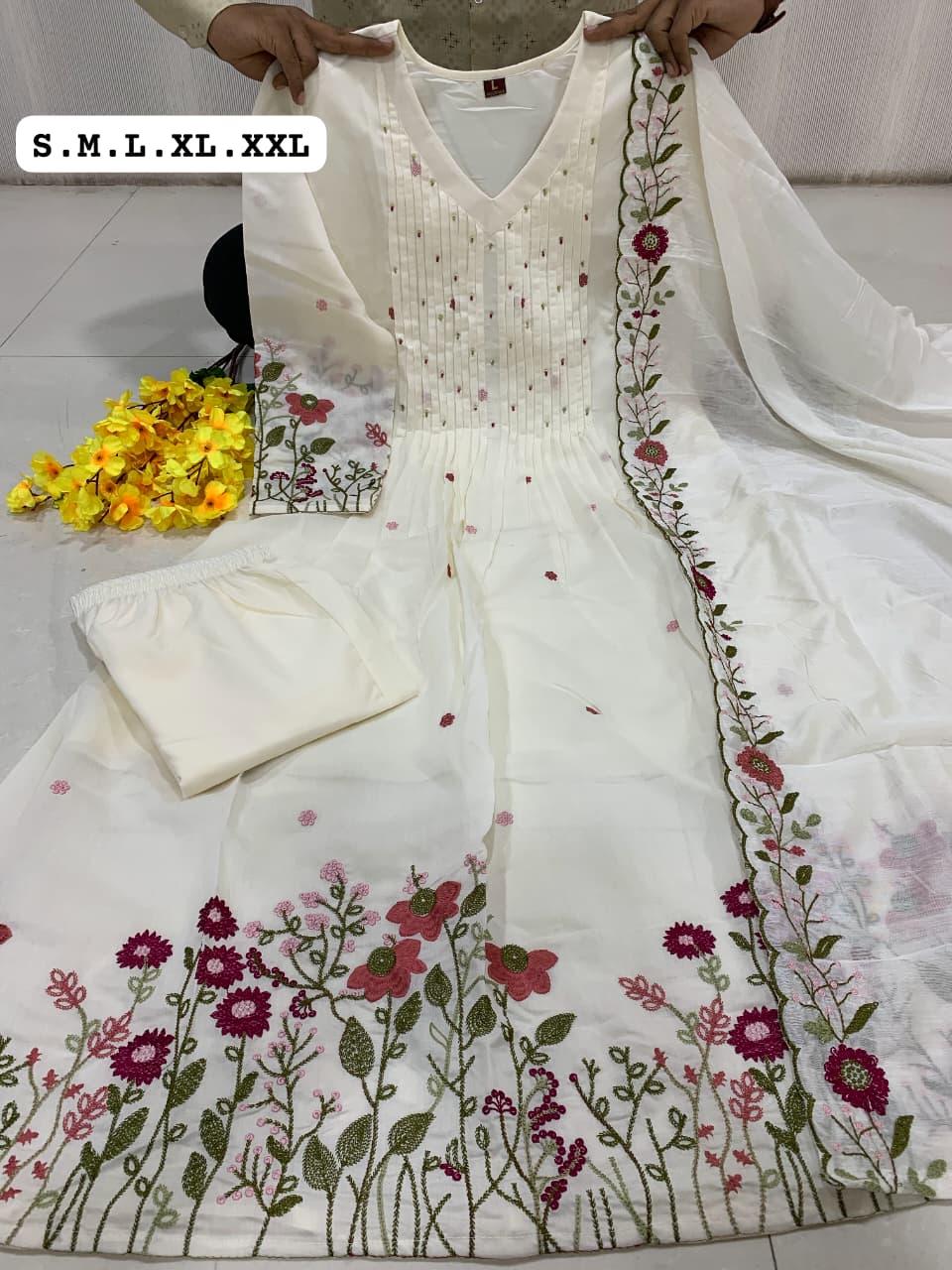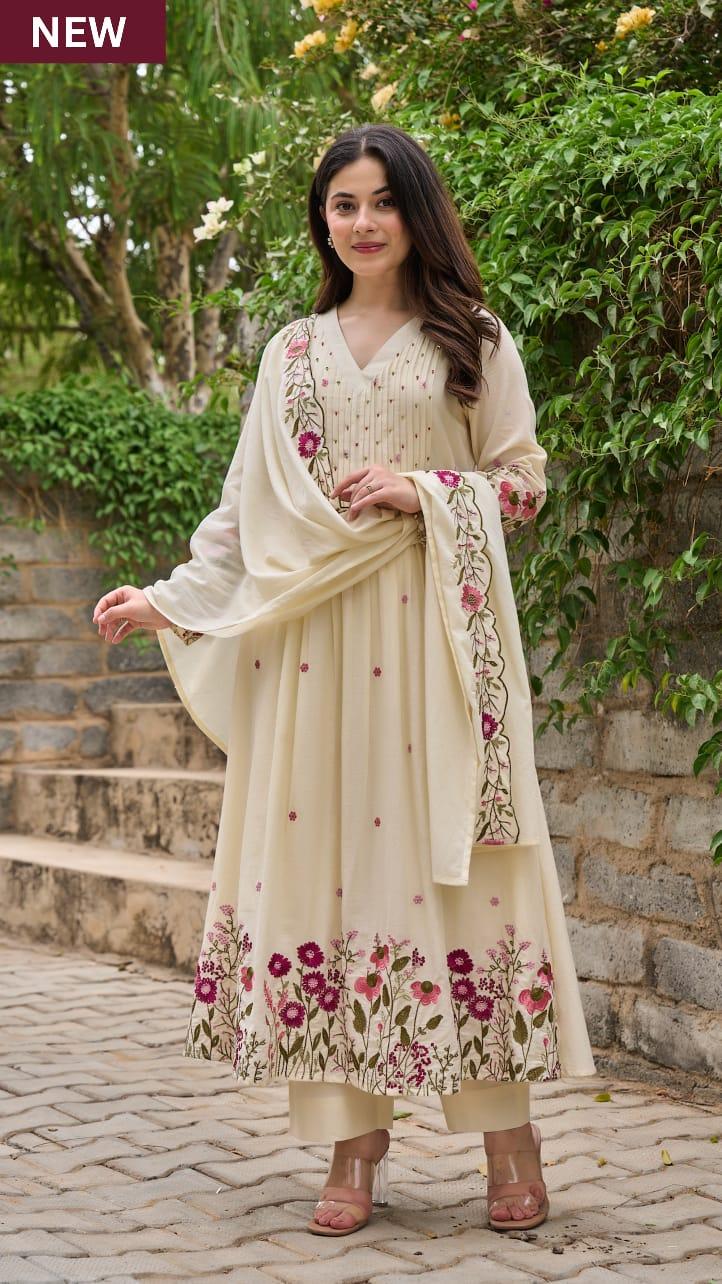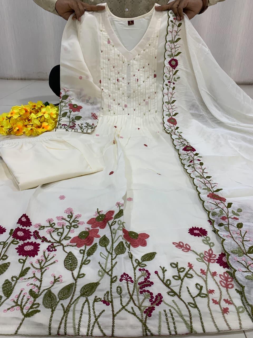 The outfit is paired with a matching pant and a heavy Chanderi silk dupatta with embroidery border, adding a touch of sophistication and timeless ethnic beauty. Designed with soft cotton lining for extra comfort, this suit set is perfect for festive gatherings, family functions, celebrations, and special occasions.