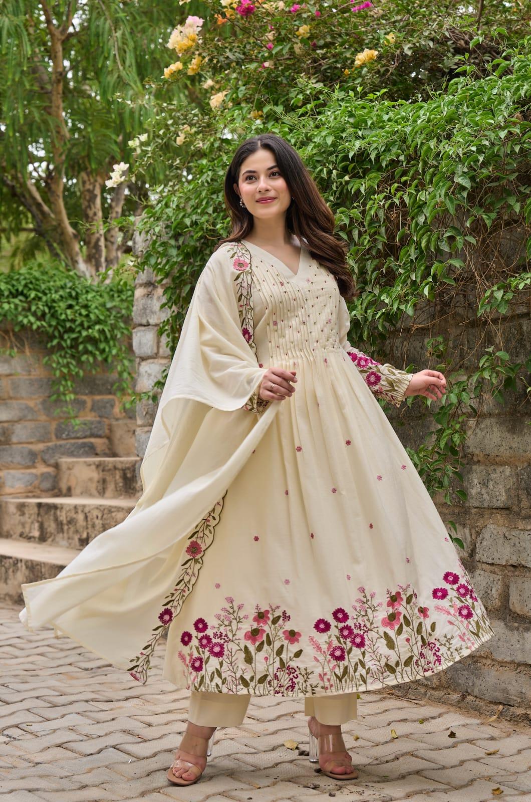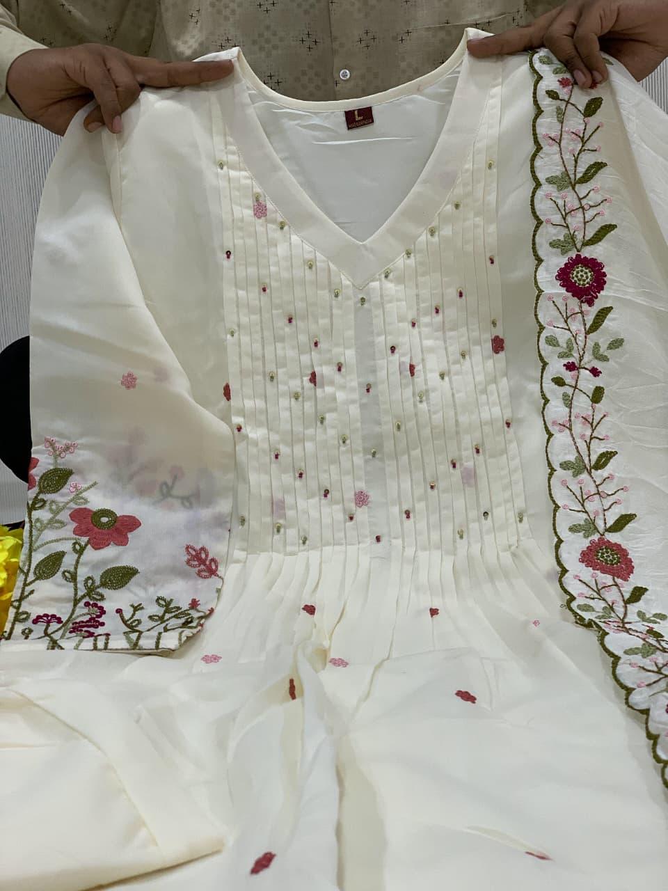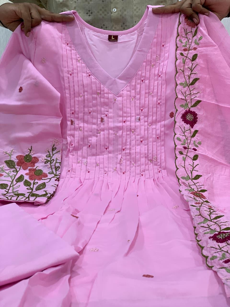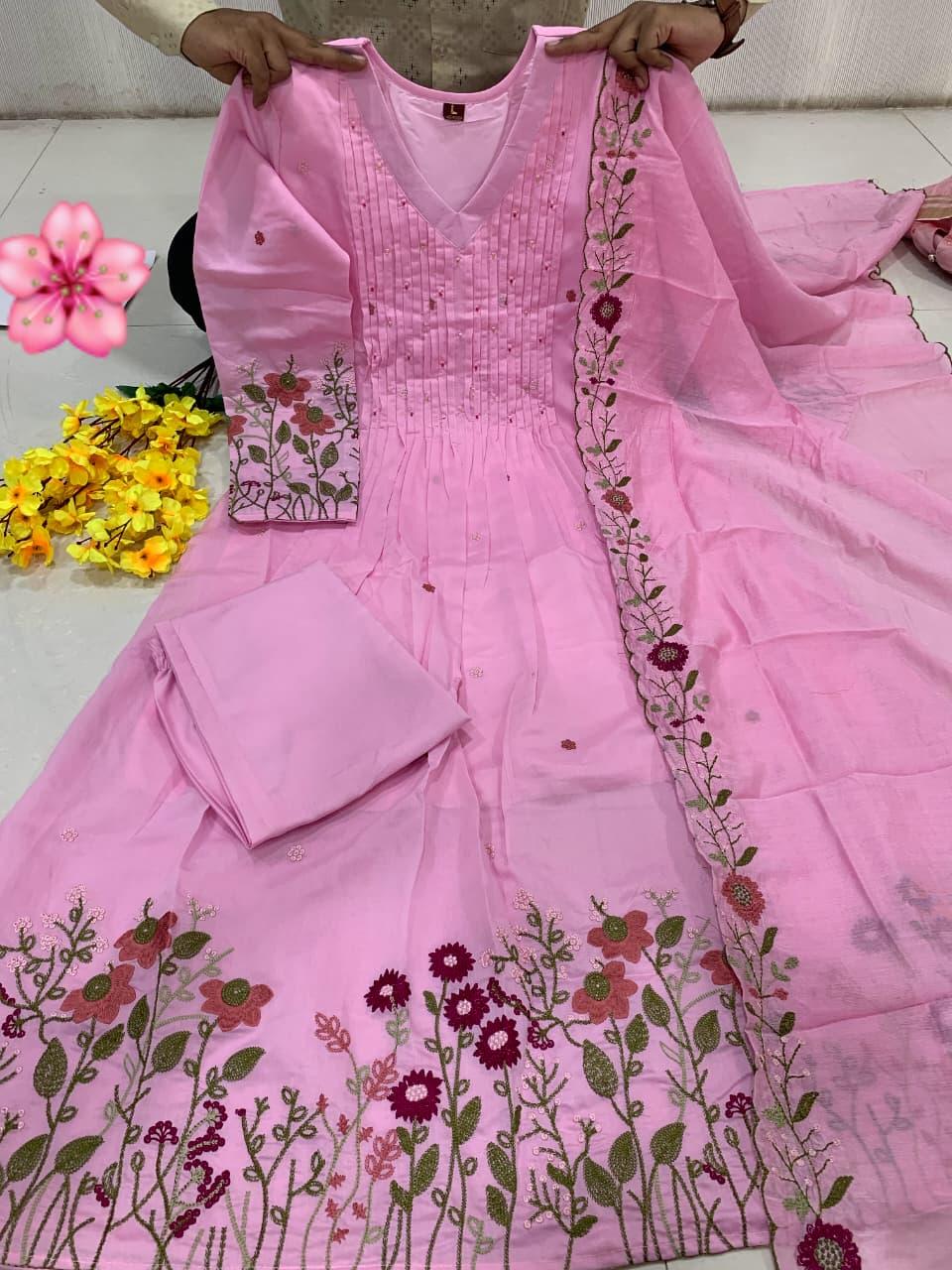 The outfit is paired with a matching pant and a heavy Chanderi silk dupatta with embroidery border, adding a touch of sophistication and timeless ethnic beauty. Designed with soft cotton lining for extra comfort, this suit set is perfect for festive gatherings, family functions, celebrations, and special occasions.