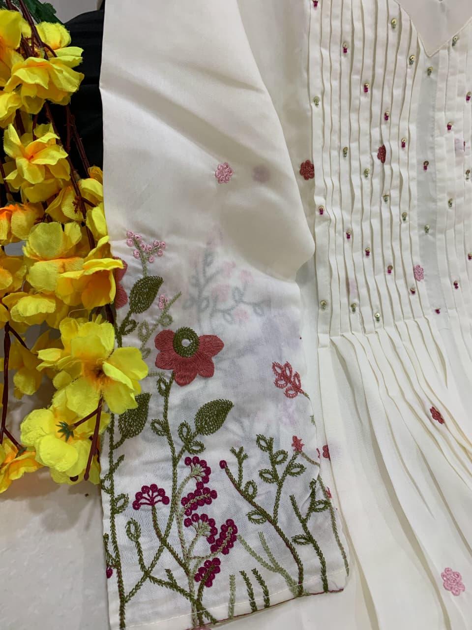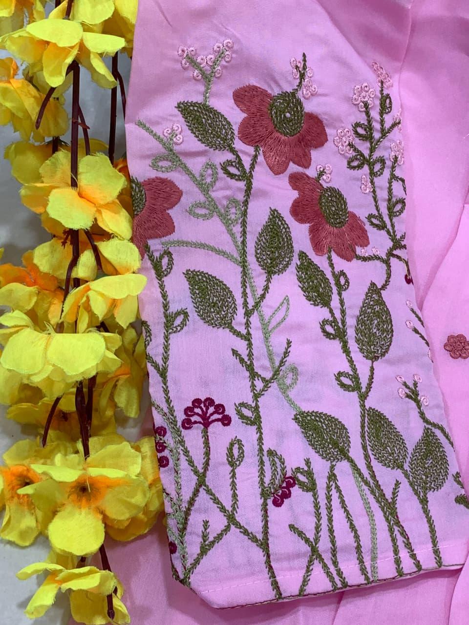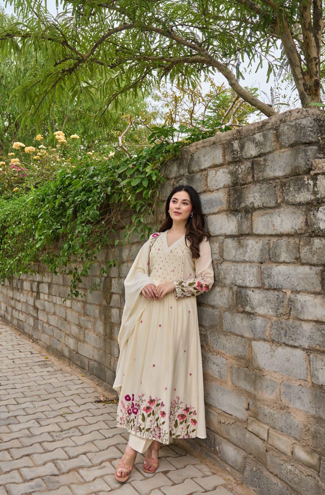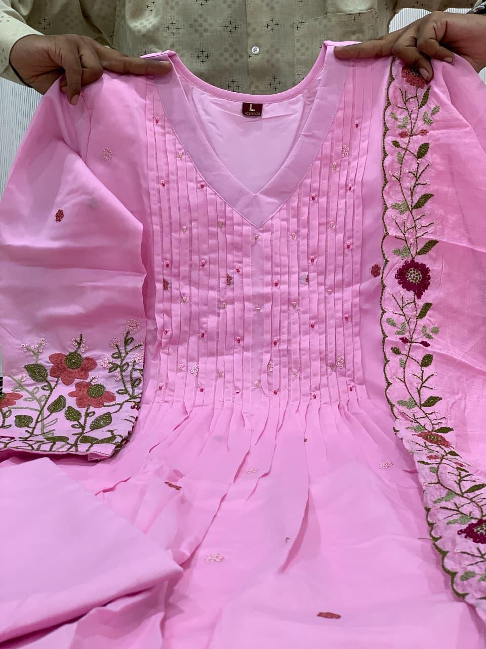 The outfit is paired with a matching pant and a heavy Chanderi silk dupatta with embroidery border, adding a touch of sophistication and timeless ethnic beauty. Designed with soft cotton lining for extra comfort, this suit set is perfect for festive gatherings, family functions, celebrations, and special occasions.