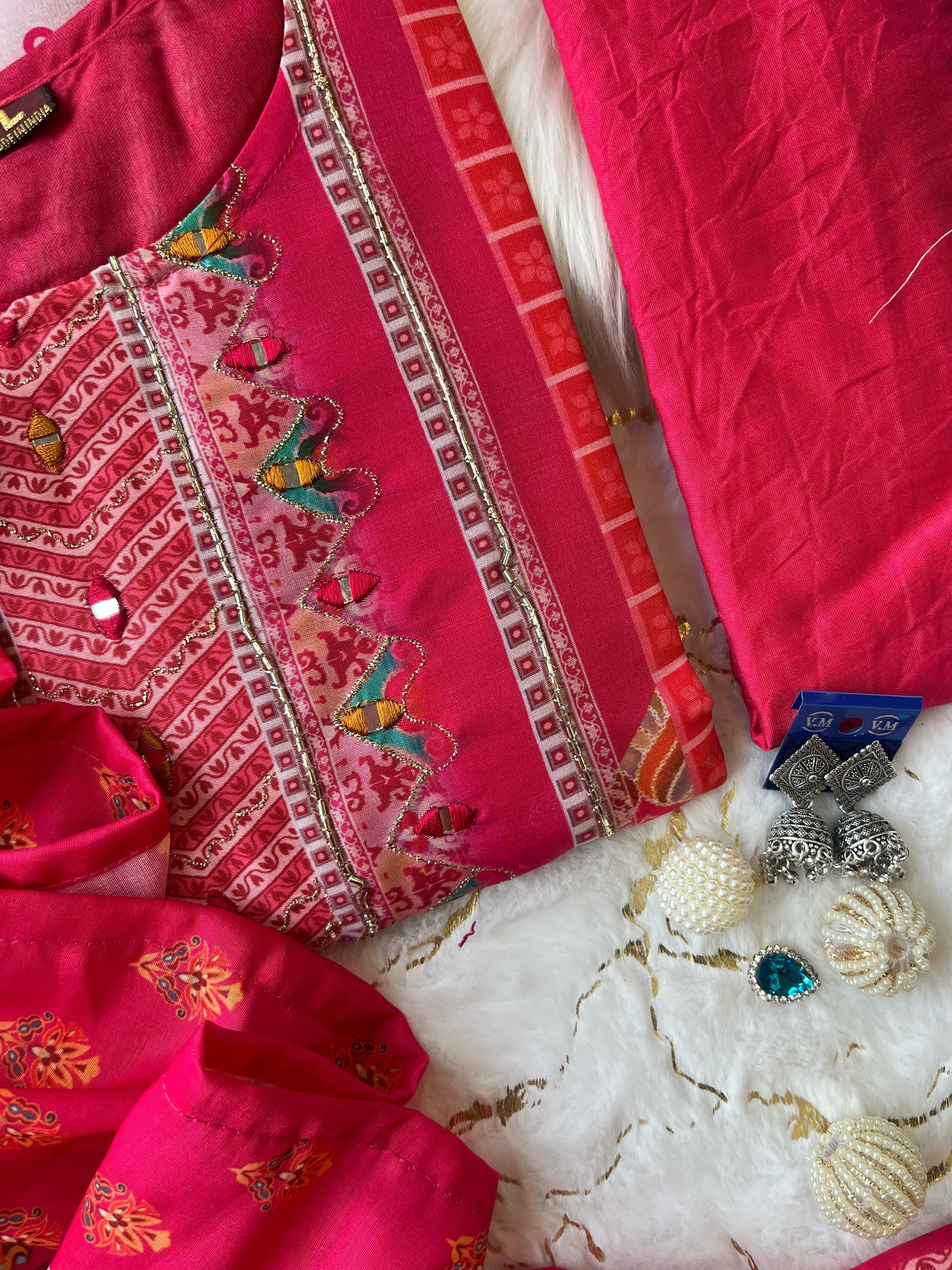Introducing the Softy Muslin Pakistani Suit with Mirror Work — a perfect blend of comfort and elegance for your upcoming special occasions. This beautiful suit set is crafted from lilac pure soft muslin fabric, adorned with intricate digital prints and real mirror work on the neck. The set includes a stylish kurti, matching pants, and a dupatta with pearls and a single-line mala, offering a luxurious, breezy feel. The cotton lining adds extra comfort for all-day wear.