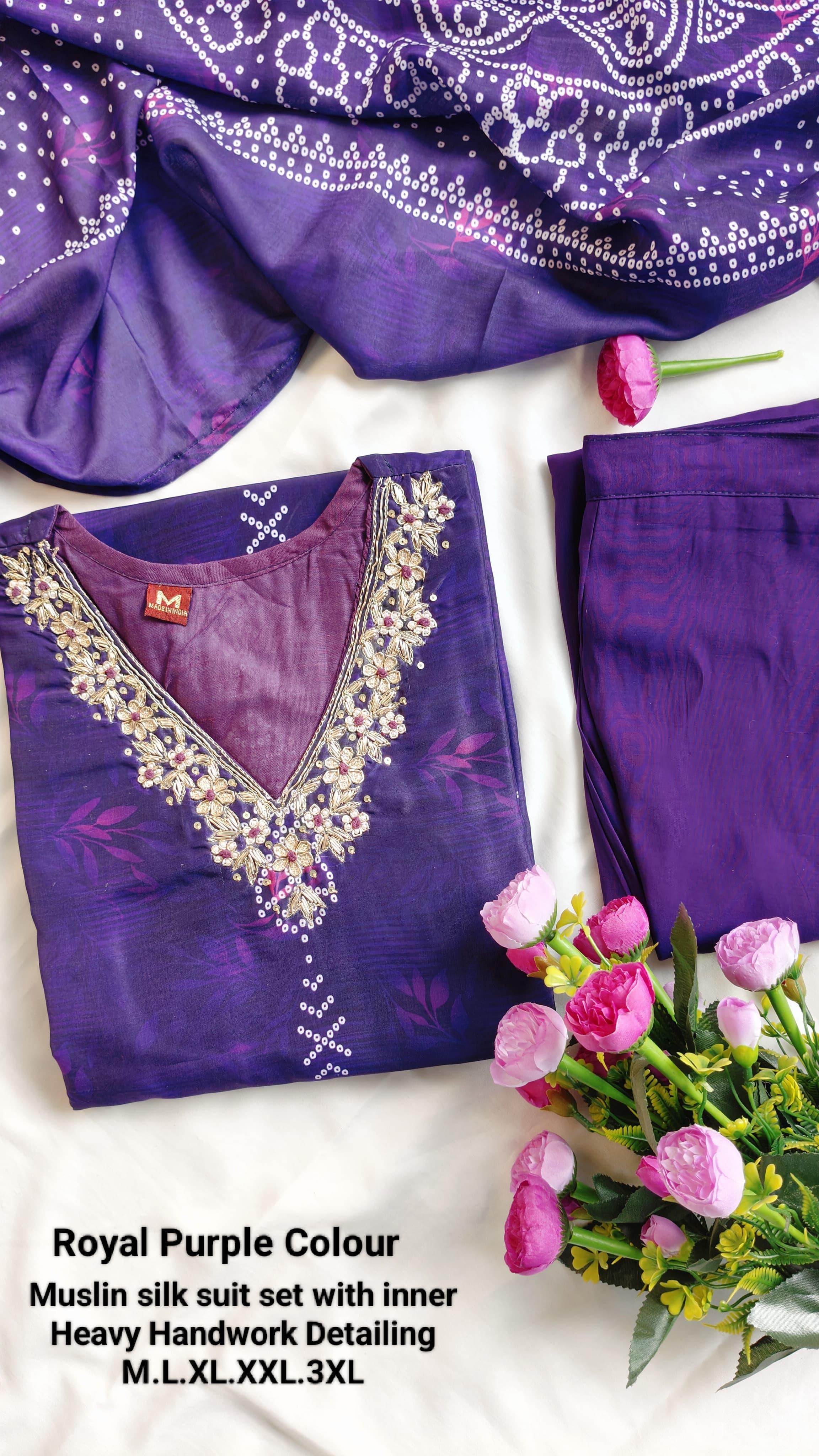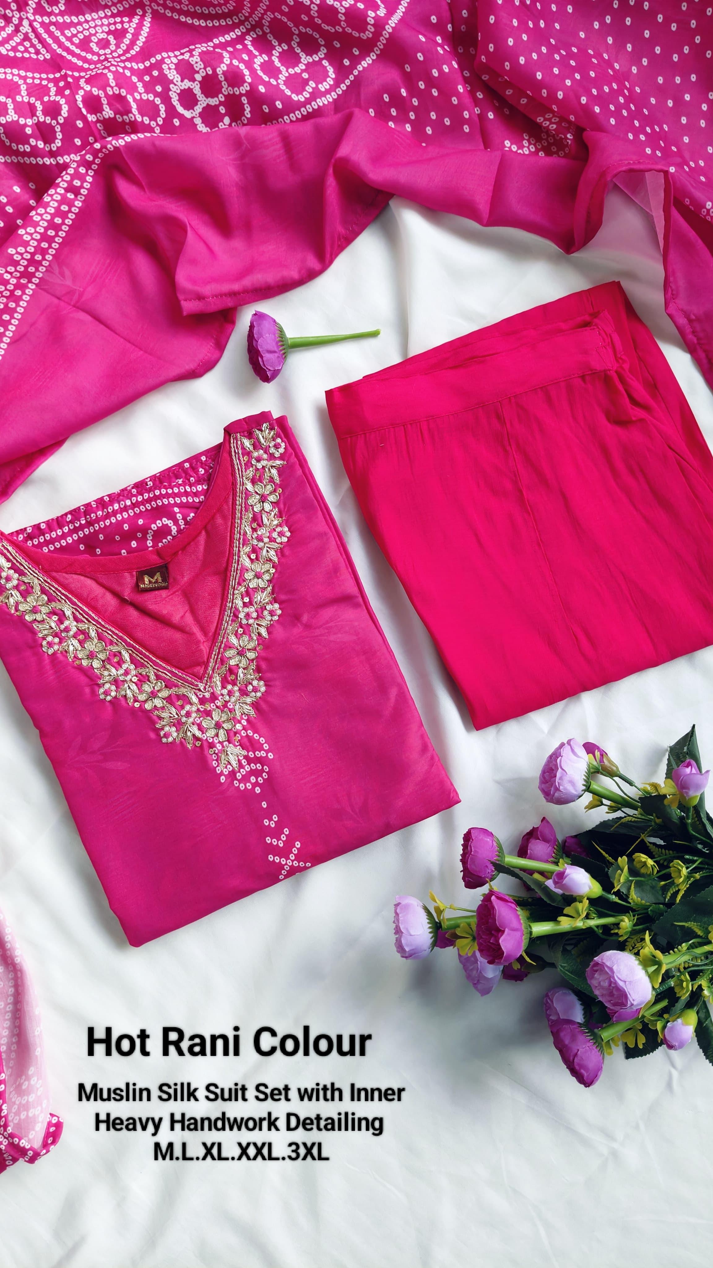 Step into elegance with our Wedding Special Bandhani Muslin Silk Suit Set, crafted for festive charm and grand occasions. Adorned with traditional Bandhani print, this straight-cut kurta set features intricate handwork on the yoke, and is paired with a flowy Roman Silk pant and matching Bandhani dupatta.