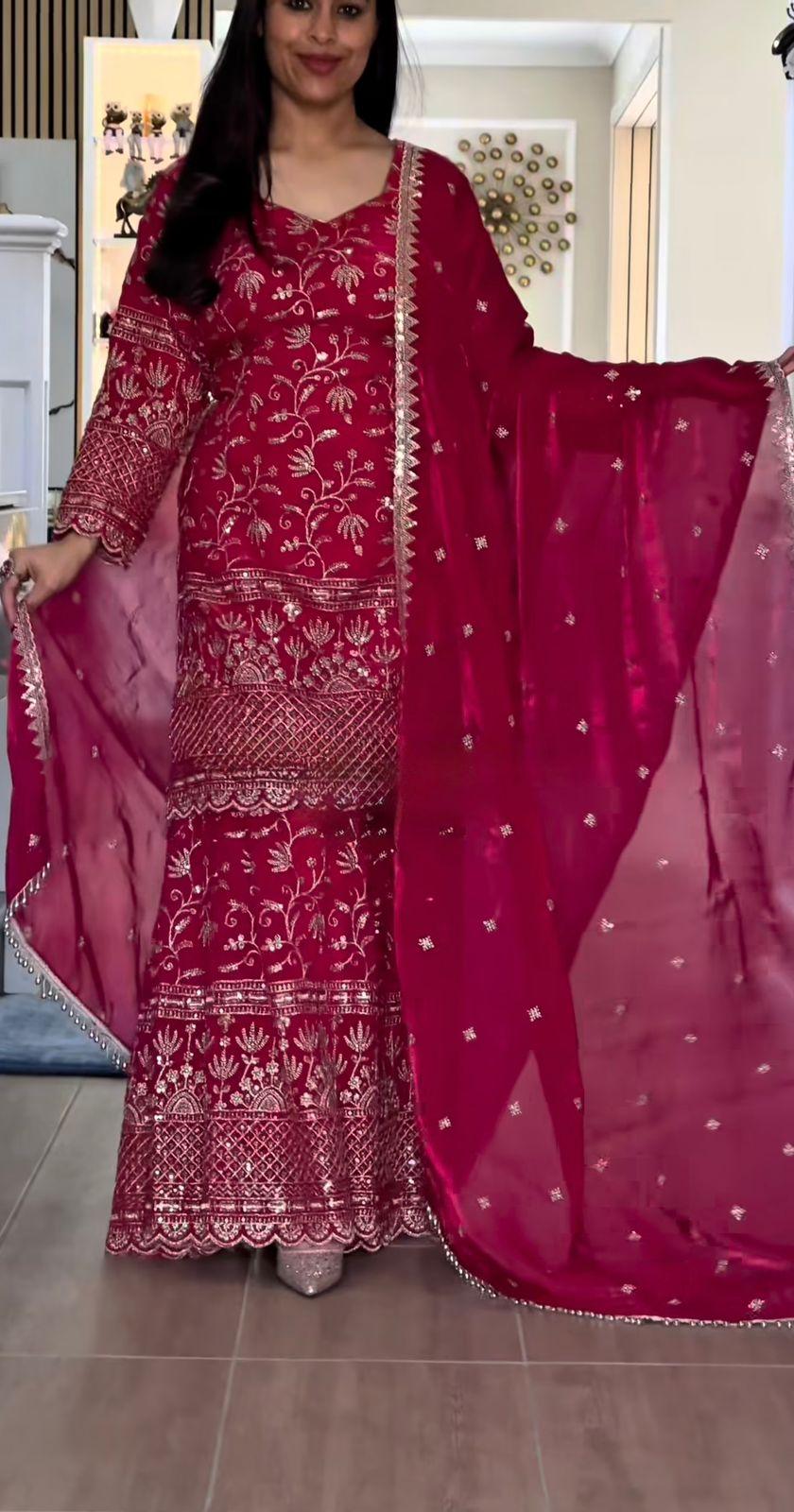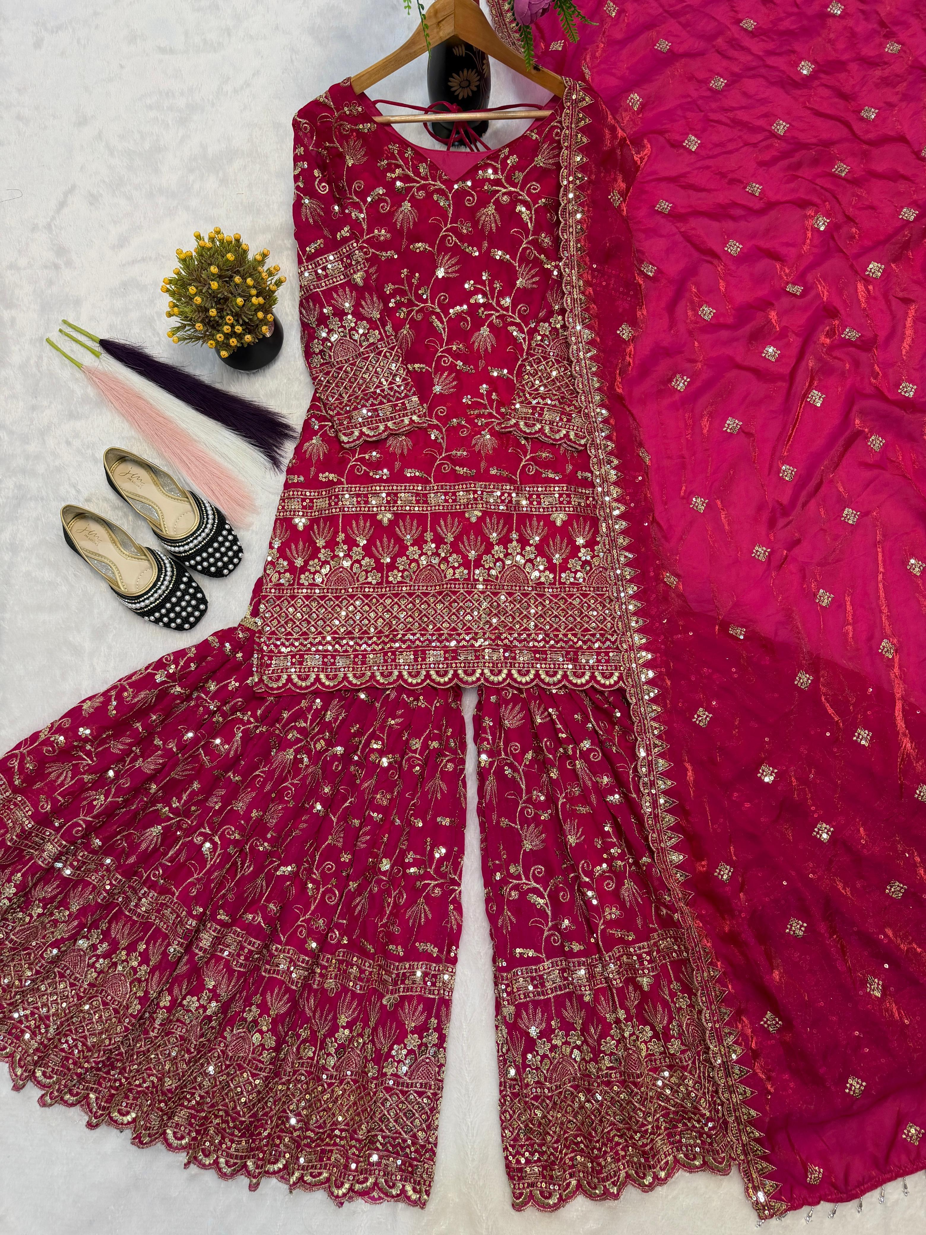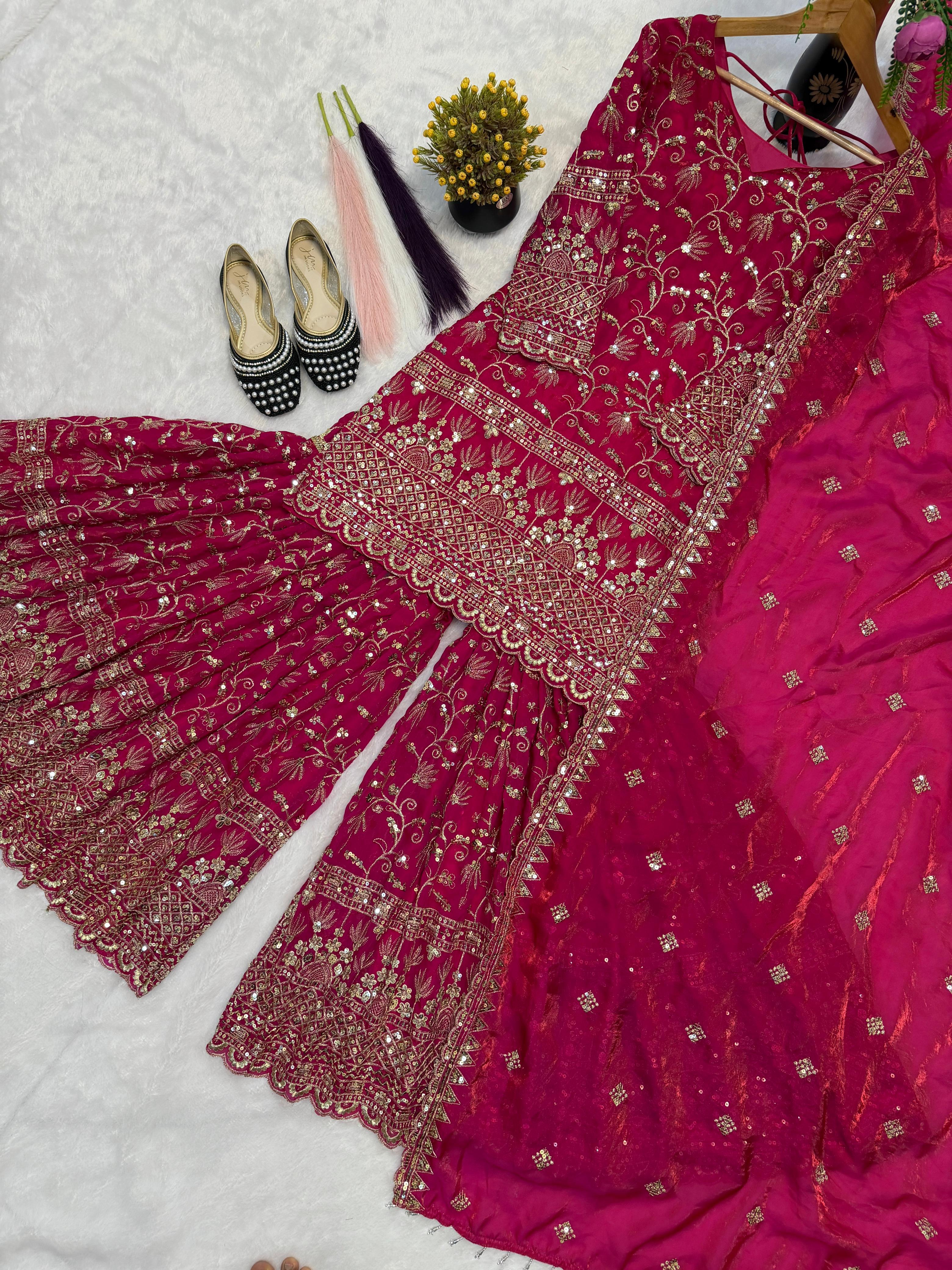 Elevate your festive style with the Zariya Fancy Crush Silk Designer Sharara Set, a luxurious party-wear ensemble from Atelier by Dishi. Crafted from premium heavy Fandy Crush Silk, this elegant outfit features beautiful 5mm sequin embroidery work with full sleeves, giving it a glamorous and sophisticated look.