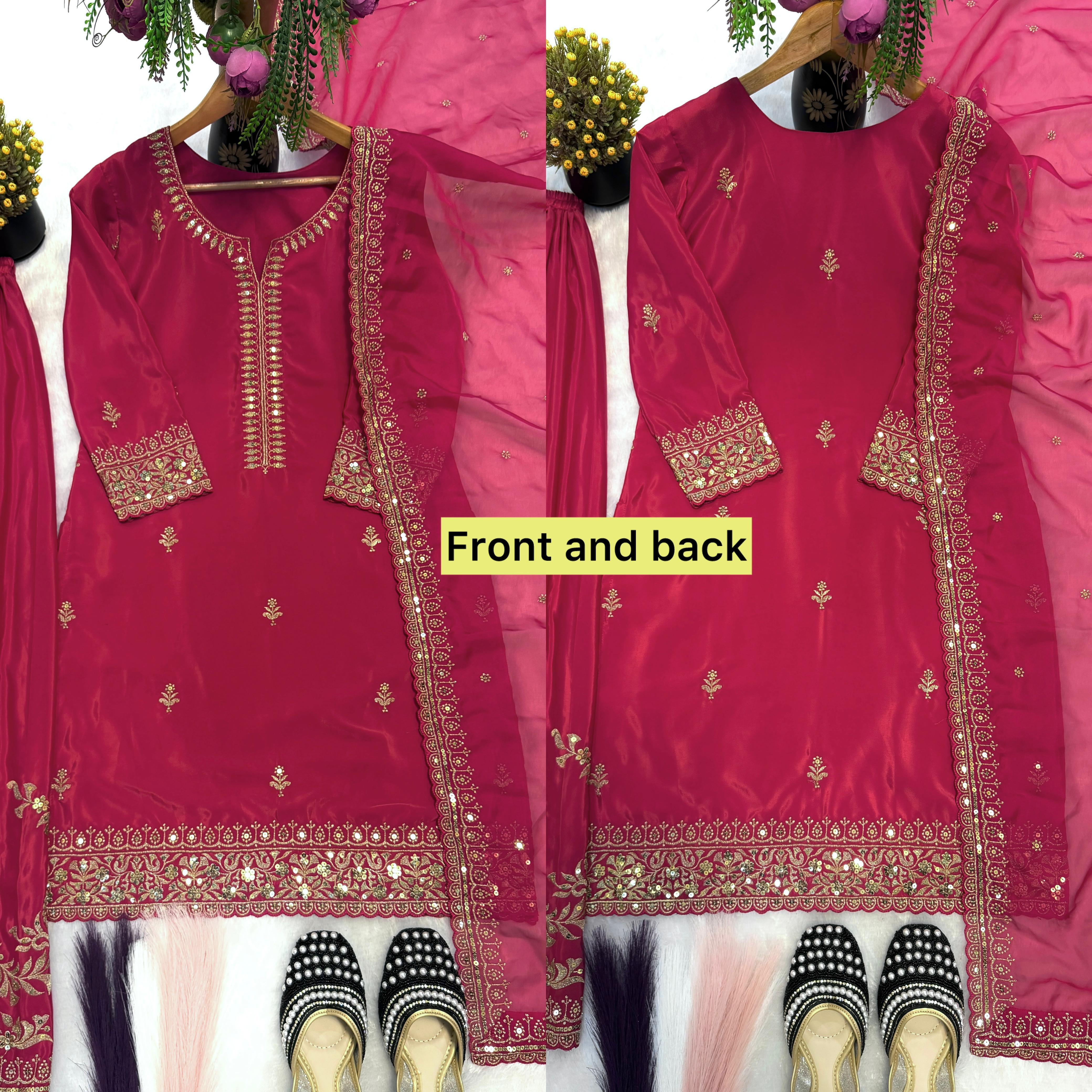 The outfit is paired with a fully flared embroidered sharara plazo, enhancing the overall silhouette with grace and volume. Completing the ensemble is a heavy organza silk dupatta featuring detailed embroidery with a fancy cutwork border, adding a sophisticated finishing touch.