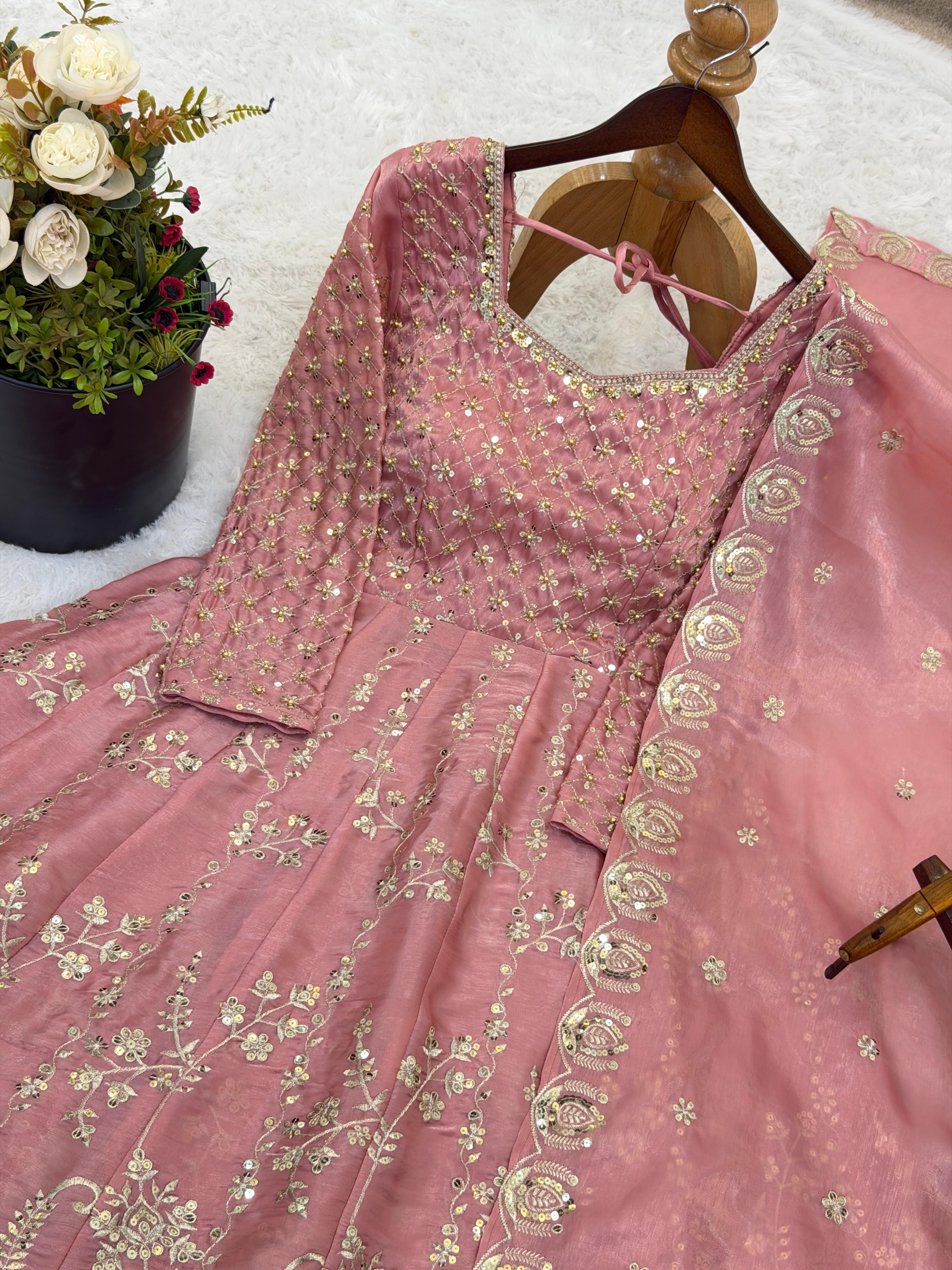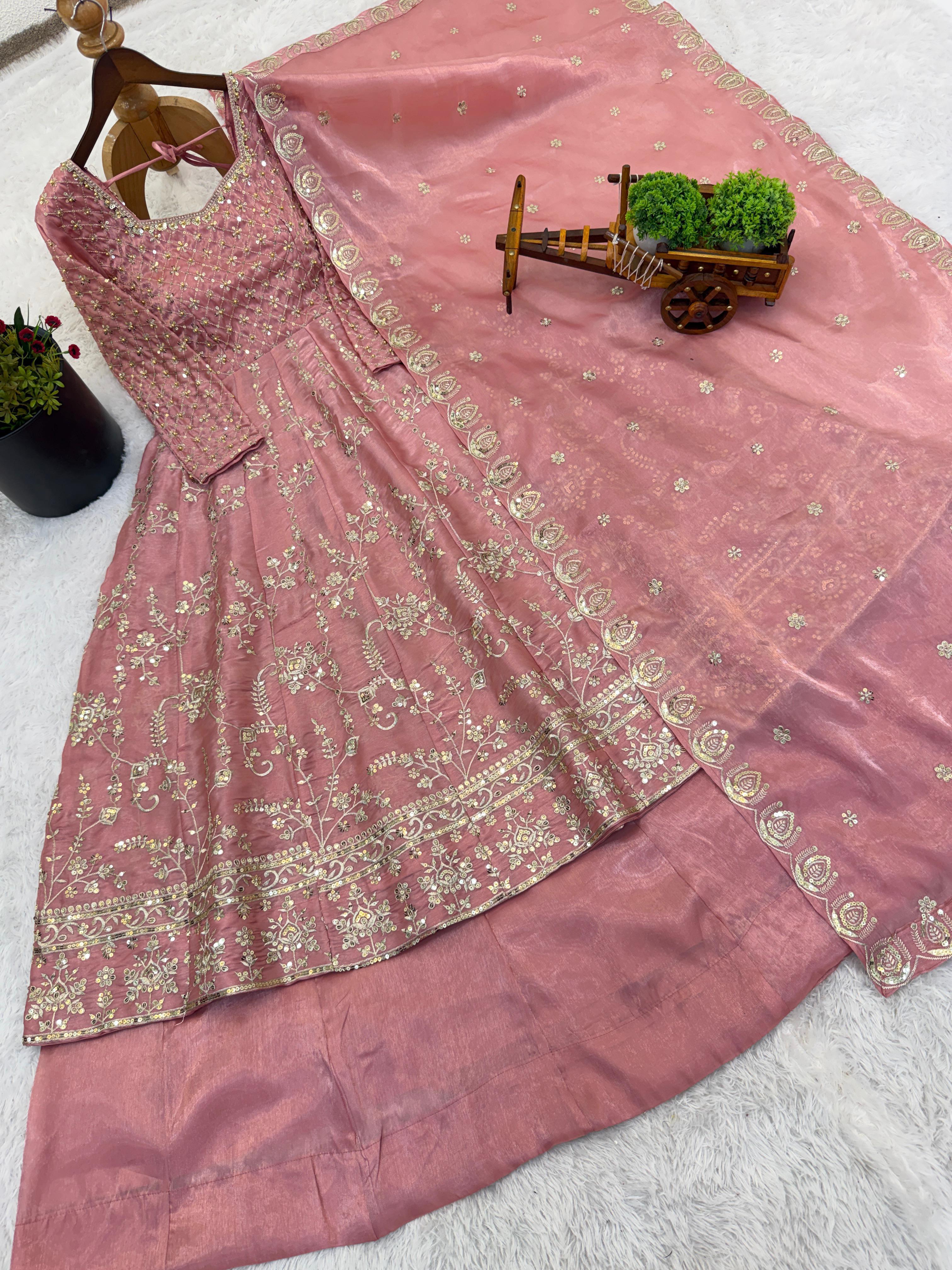 The long embroidered top paired with a semi-stitched lehenga creates a graceful and elegant silhouette, while the matching GMY silk dupatta with heavy embroidery sequence work adds a glamorous finishing touch.