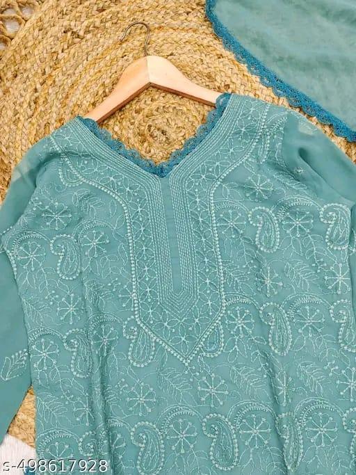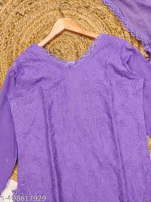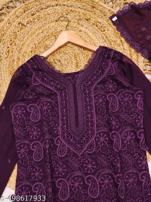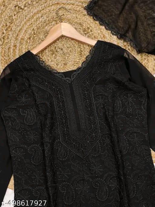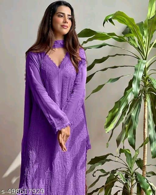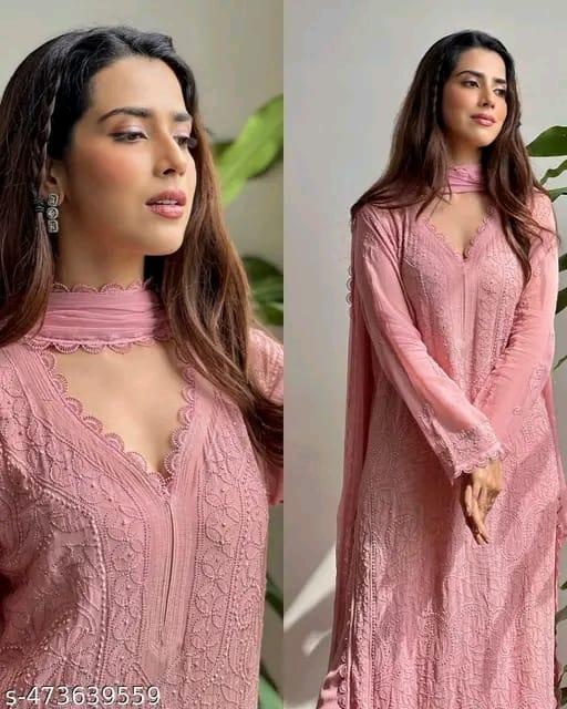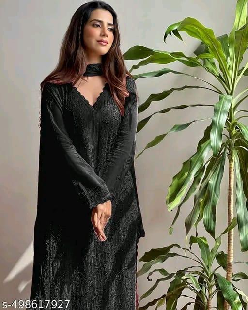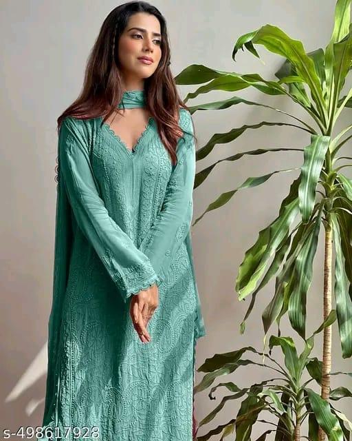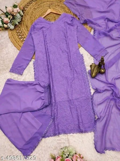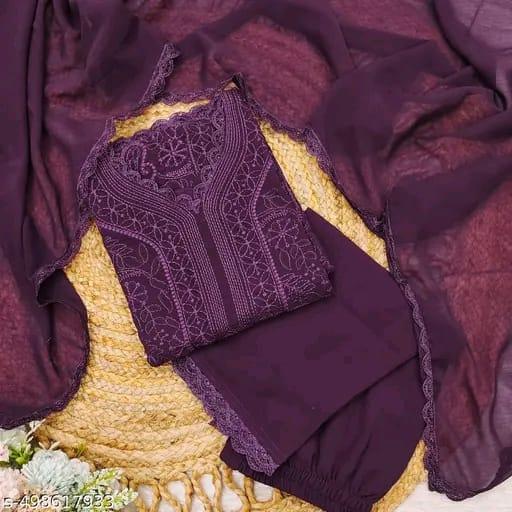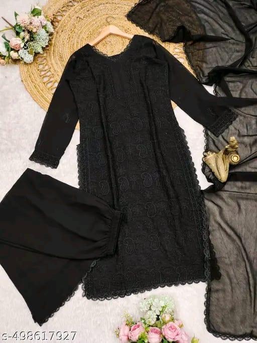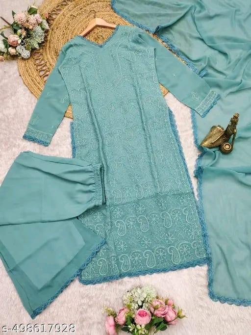 Step into elegance with Zoya Grace, a beautifully crafted 3-piece set featuring a faux georgette embroidered top, full-flair palazzo, and a matching dupatta. Designed for fashion-forward women, this outfit is perfect for festive wear, special gatherings, or even high-end daily wear. The intricate cotton thread embroidery with GPO lacework adds a rich and sophisticated touch to the entire ensemble.